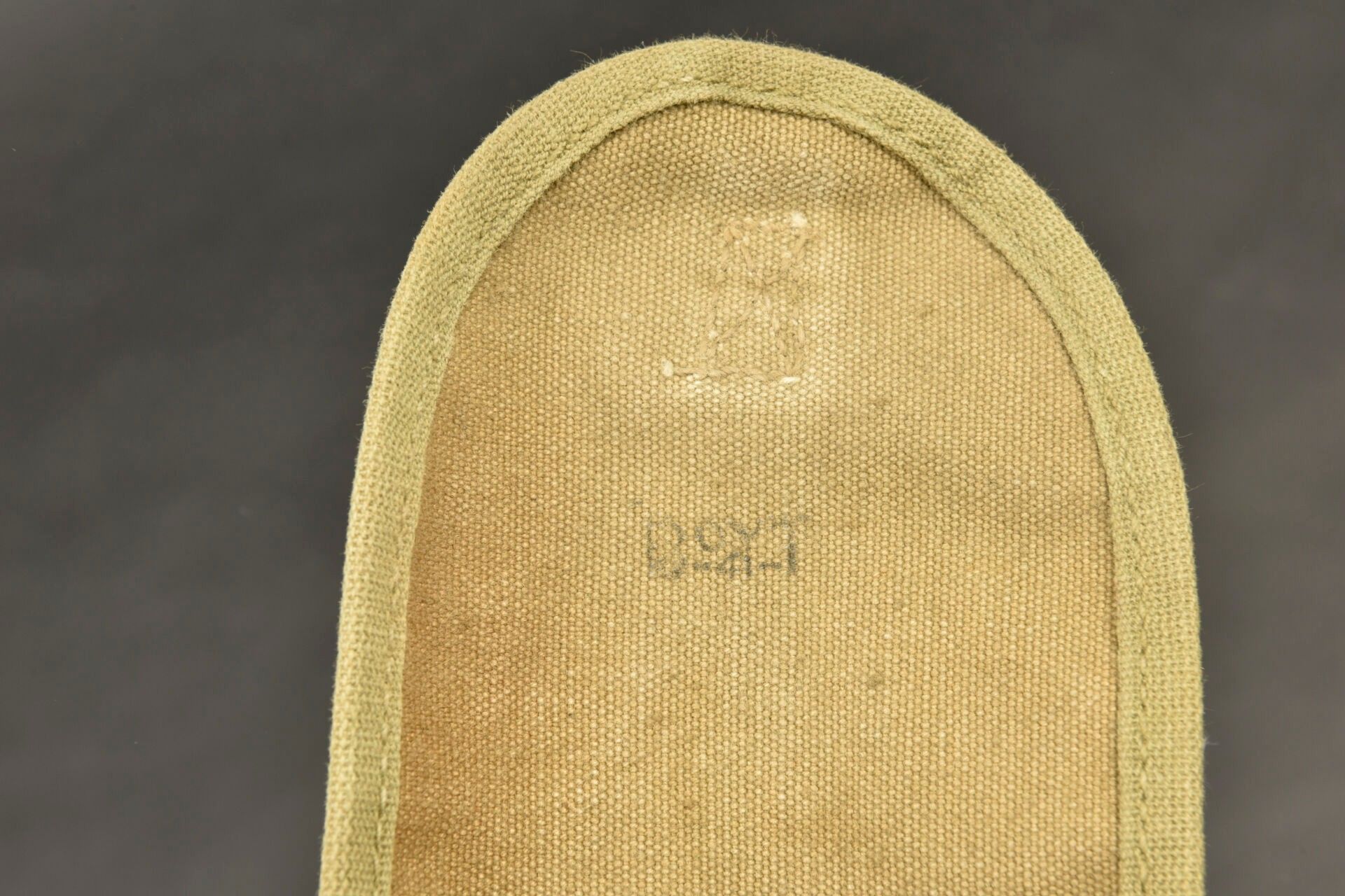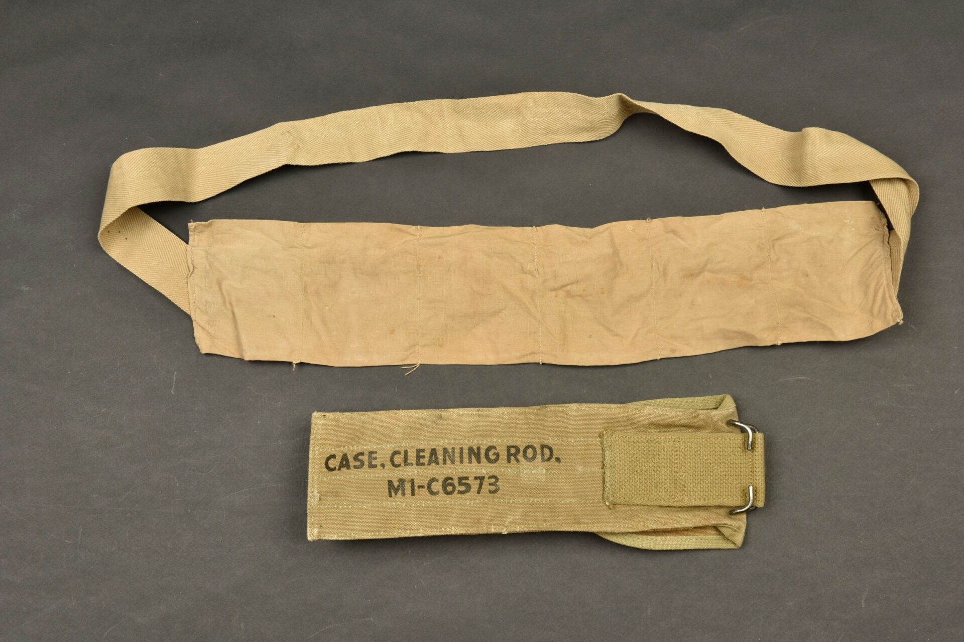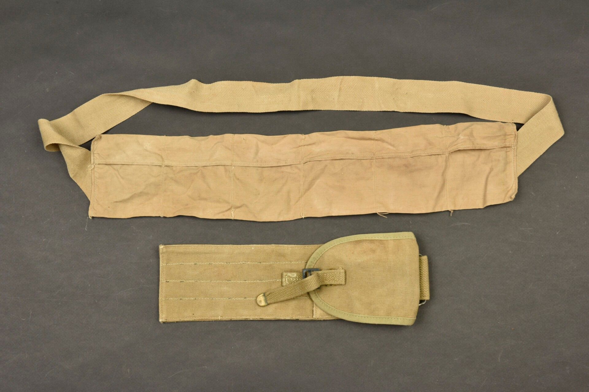 US Accessories. Comprising a case for 30mm machine gun cleaning accessories, heavy OD canvas, the hook for attaching to the belt is present, empty. Marked Case Cleaning prod M1-C6573. A beige canvas bandoleer, complete, with no visible markings. Some wear and patina to parts. Condition II+. 2+