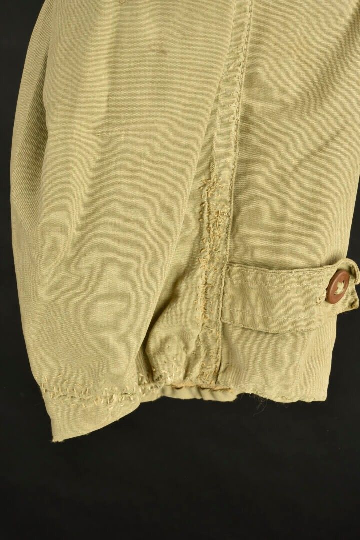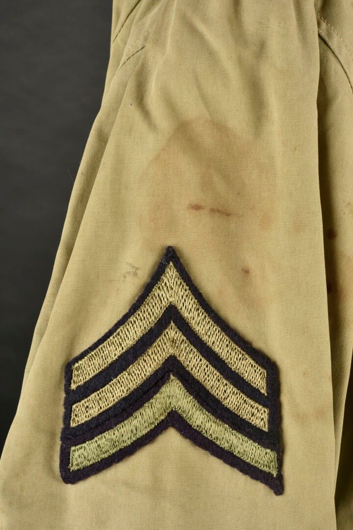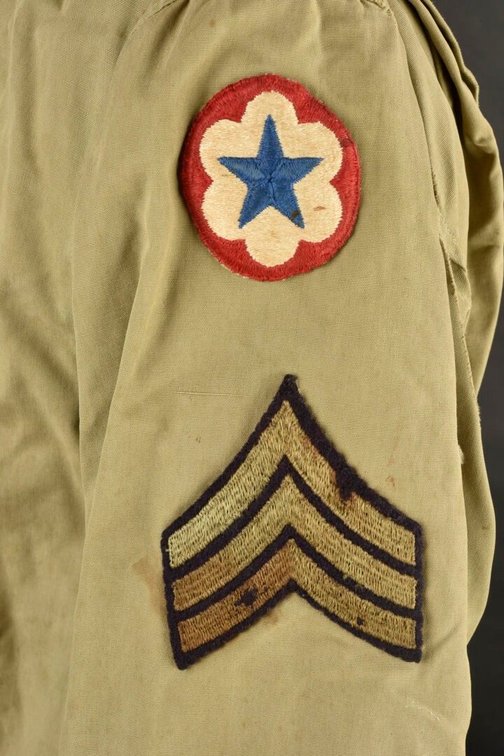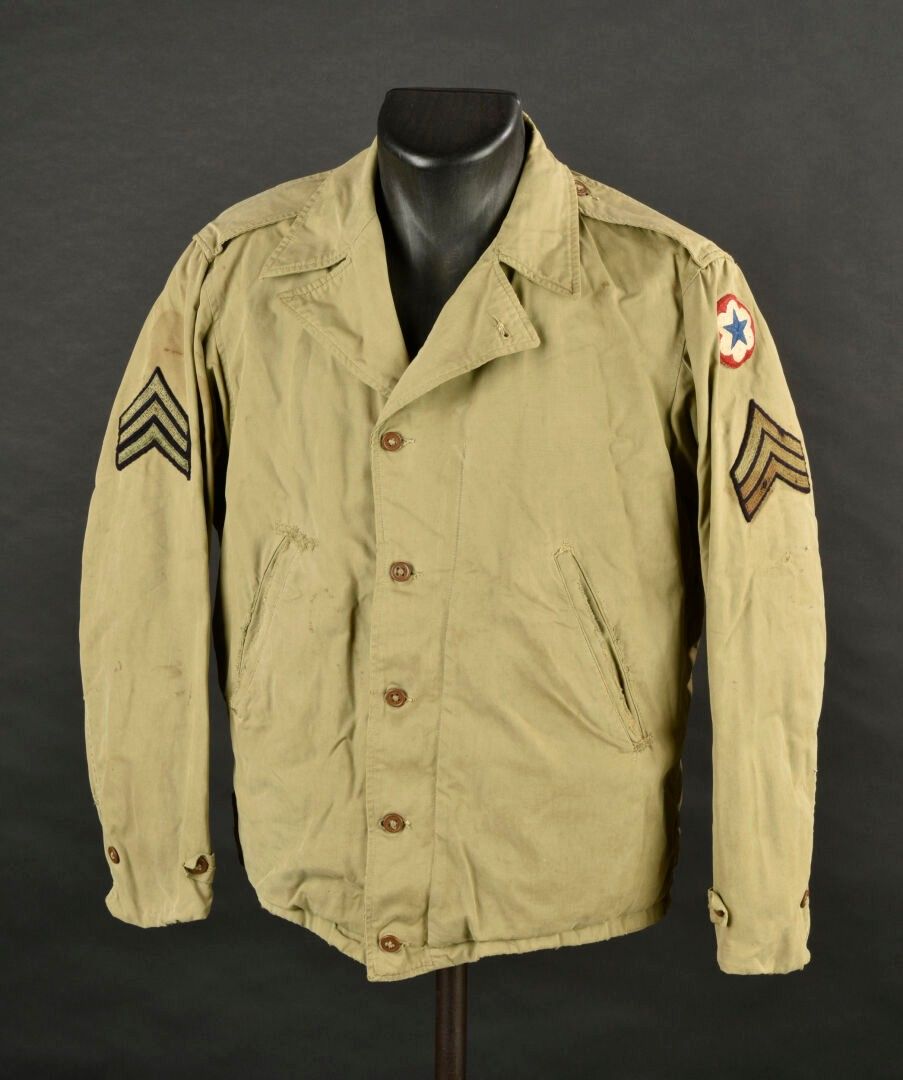 Army Services Forces M-41 jacket. Khaki poplin. Most of the buttons are present. Functional zip, made by Talon. Morris name tag on bottom of jacket. Sergeant's rank hand-stitched on sleeves. Army Services Forces badge, also hand-stitched on left sleeve. Unbleached cloth lining. Numerous laundry numbers visible on collar and buttonhole, M-1570. Trace of label on collar. Manufacturer's label missing. Numerous wear marks and stains throughout, as well as period repairs. Condition II+. 2+