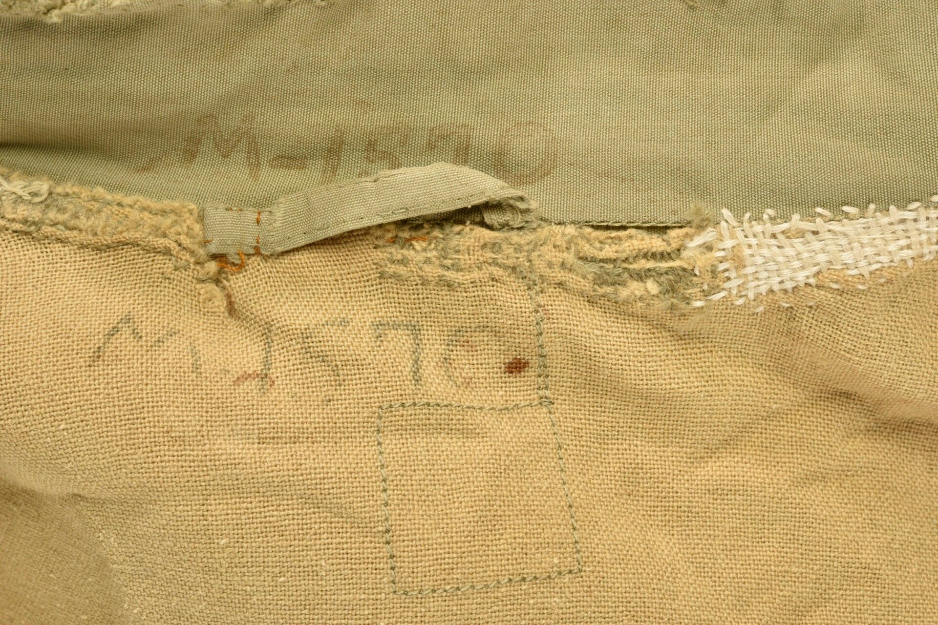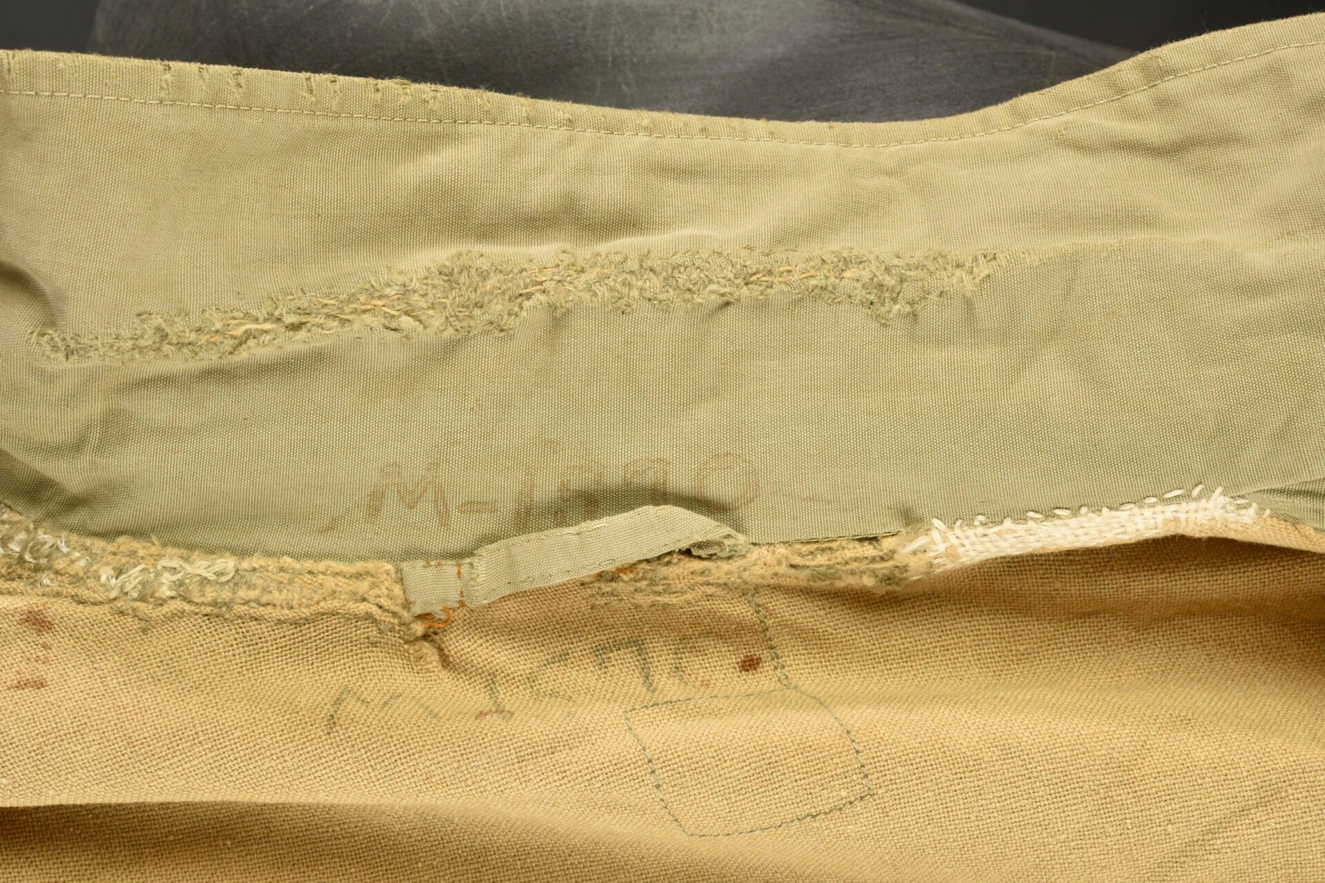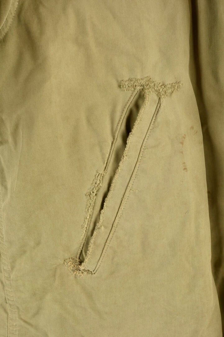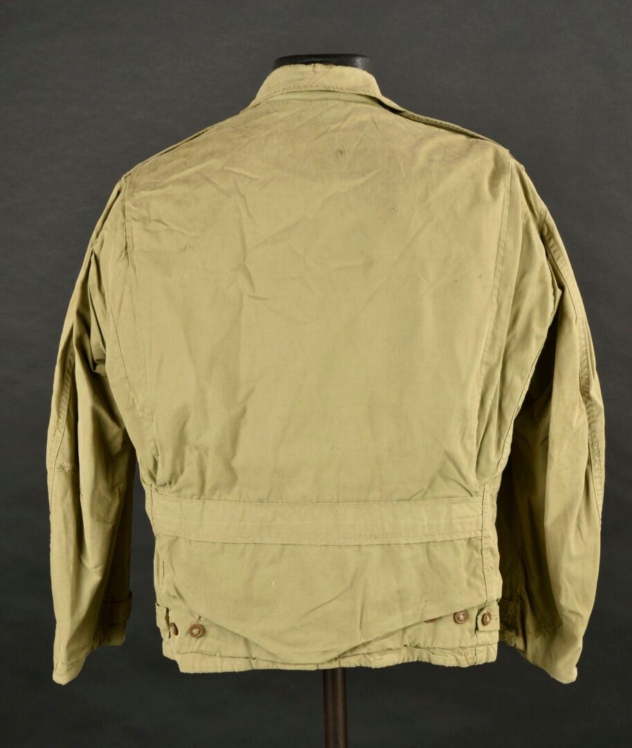Army Services Forces M-41 jacket. Khaki poplin. Most of the buttons are present. Functional zip, made by Talon. Morris name tag on bottom of jacket. Sergeant's rank hand-stitched on sleeves. Army Services Forces badge, also hand-stitched on left sleeve. Unbleached cloth lining. Numerous laundry numbers visible on collar and buttonhole, M-1570. Trace of label on collar. Manufacturer's label missing. Numerous wear marks and stains throughout, as well as period repairs. Condition II+. 2+