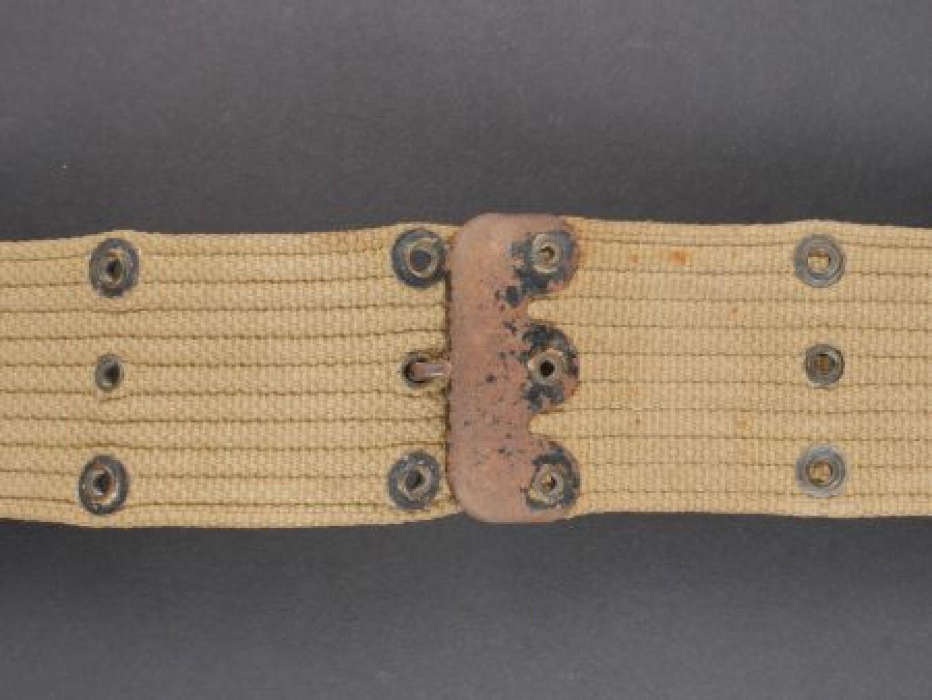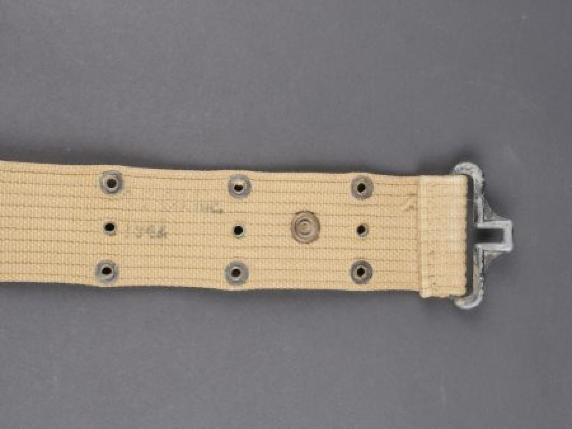 M-36 belt. Heavy OD canvas. Painted metal buckle. Nice US markings on the side of the belt. Manufacturer's markings illegible. Dated 1942. Some of the metal parts are oxidised. Some wear and patina. Condition II+. 2+