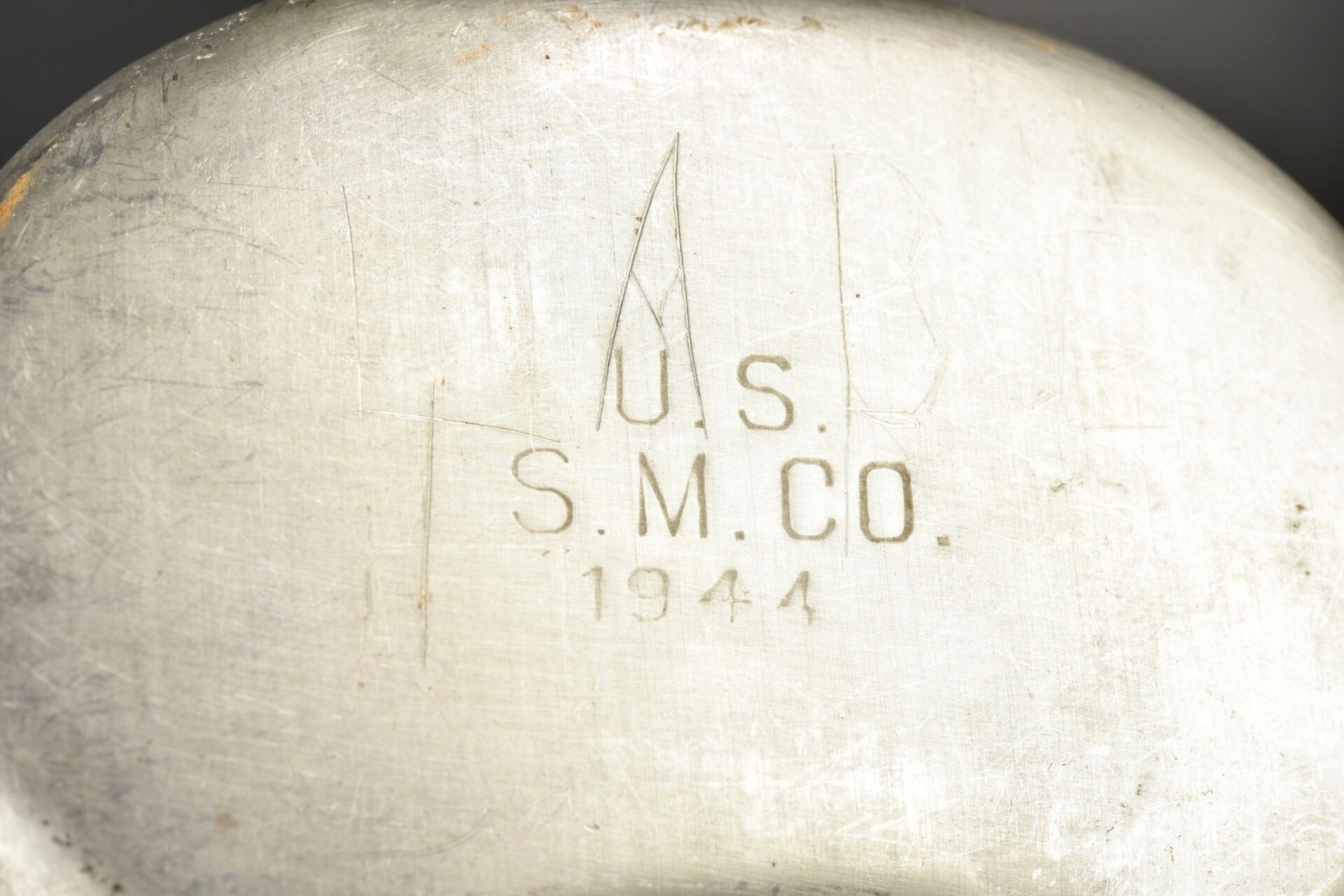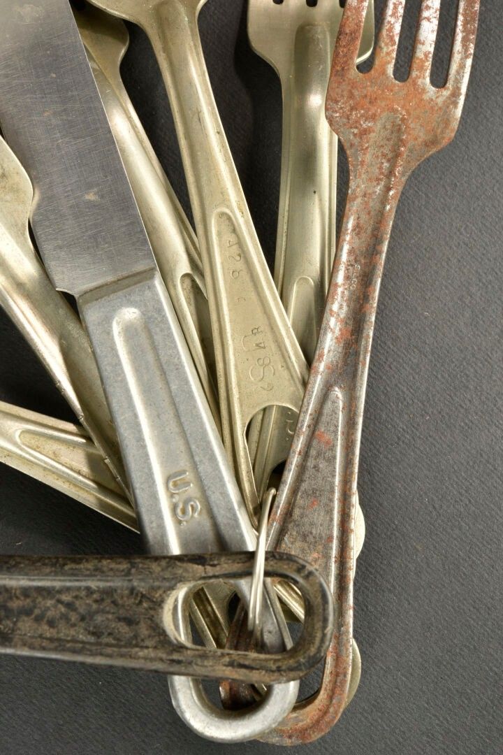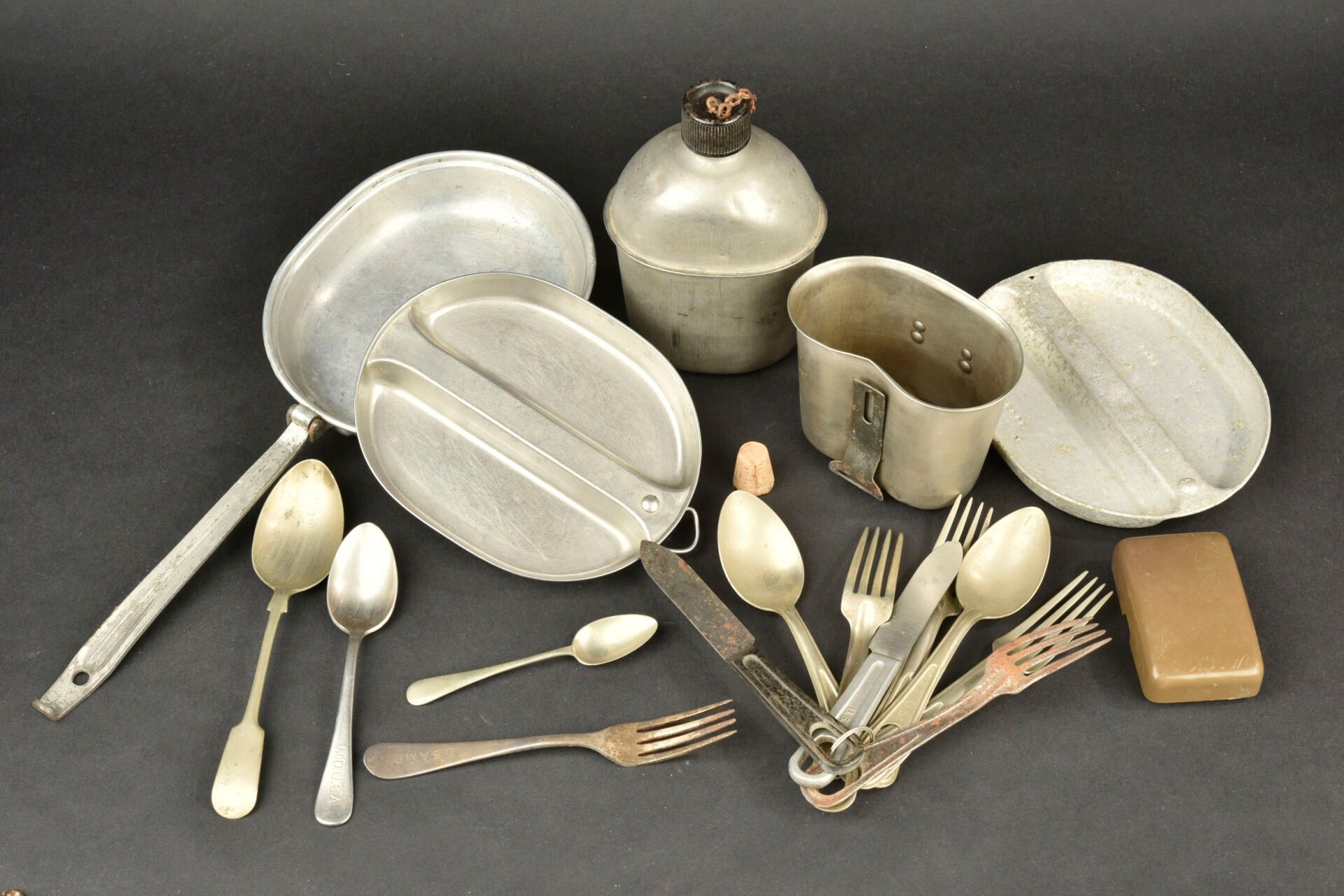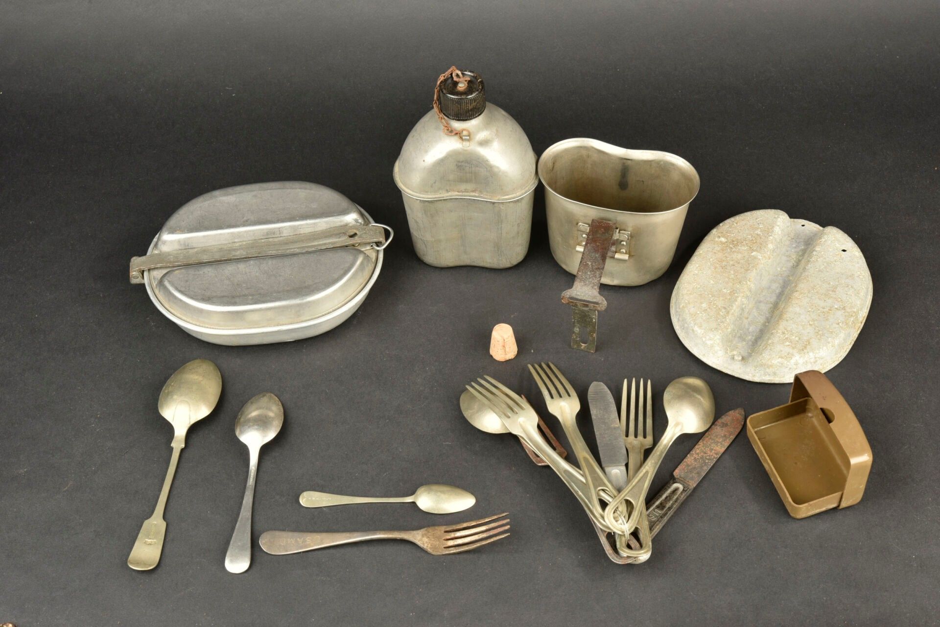 US mess kit. Comprising a khaki bakelite soap box, empty, no visible markings. A digging bowl lid, unmarked and incomplete, inscribed HOPE. A complete mess tin, dated 1942. A canteen complete with stopper and chain, US SMCO 1944, some dents visible. A complete US quarter, the markings are illegible due to oxidation of the metal parts. Two large spoons, marked 843 and A28. One fork marked W3524. Three forks, one heavily oxidised. One knife dated 1944. One knife with bakelite handle. A large British spoon. One fork marked USAMD. One large spoon marked MD USA. A small British spoon. Some wear and patina. Condition II+. 2+