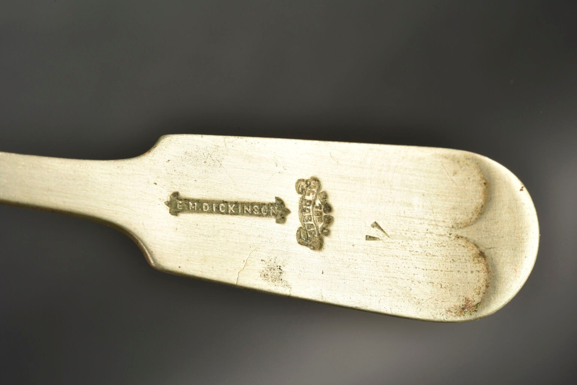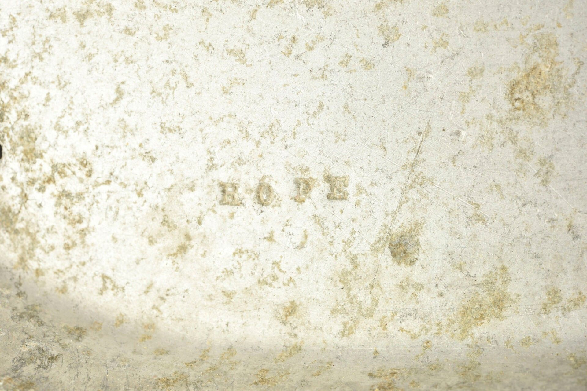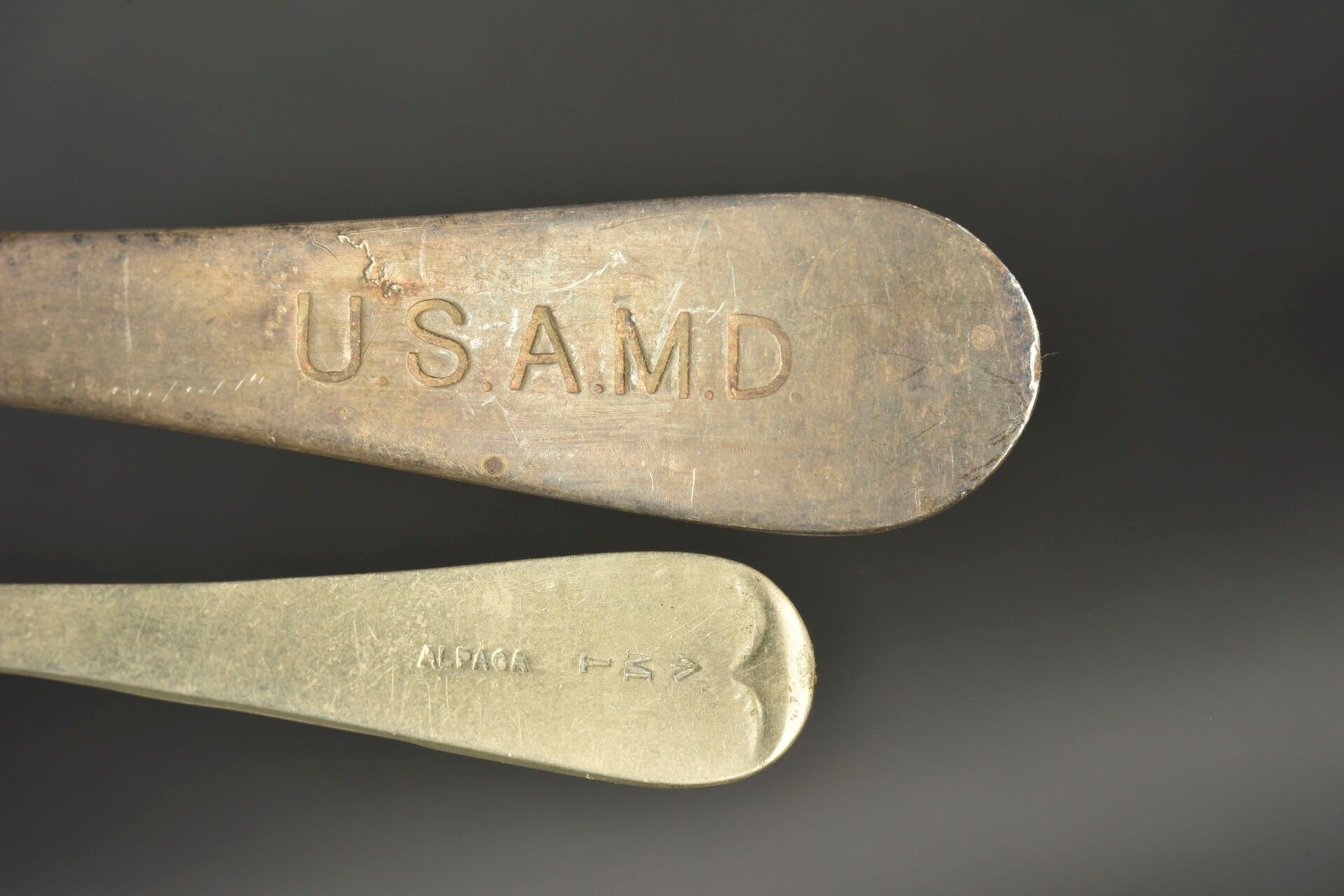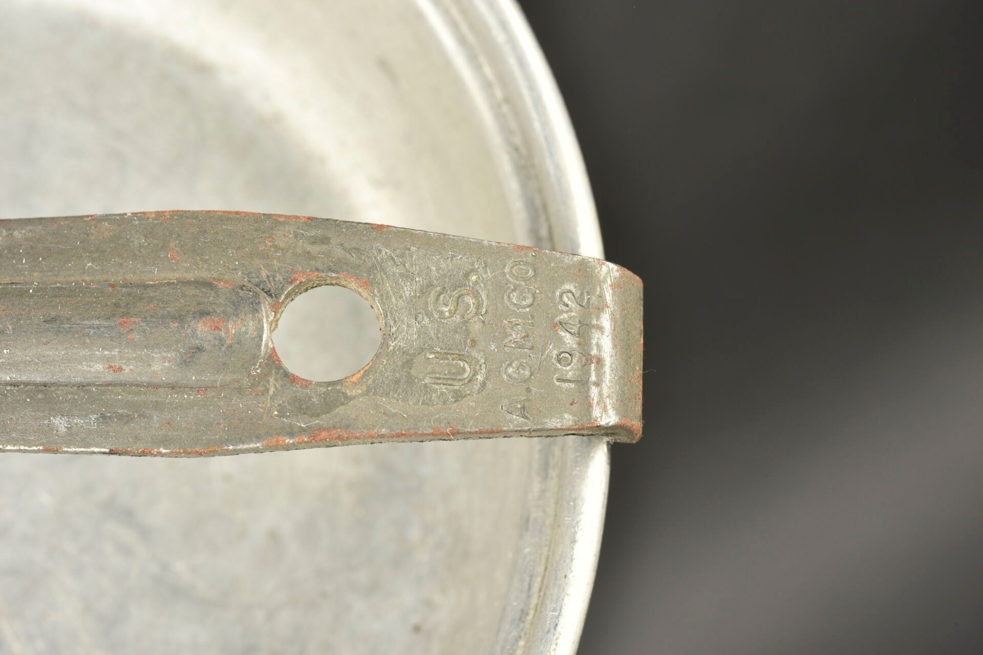 US mess kit. Comprising a khaki bakelite soap box, empty, no visible markings. A digging bowl lid, unmarked and incomplete, inscribed HOPE. A complete mess tin, dated 1942. A canteen complete with stopper and chain, US SMCO 1944, some dents visible. A complete US quarter, the markings are illegible due to oxidation of the metal parts. Two large spoons, marked 843 and A28. One fork marked W3524. Three forks, one heavily oxidised. One knife dated 1944. One knife with bakelite handle. A large British spoon. One fork marked USAMD. One large spoon marked MD USA. A small British spoon. Some wear and patina. Condition II+. 2+