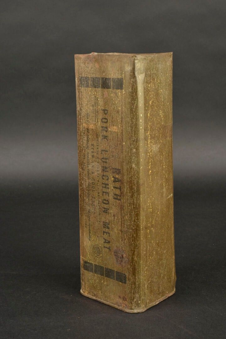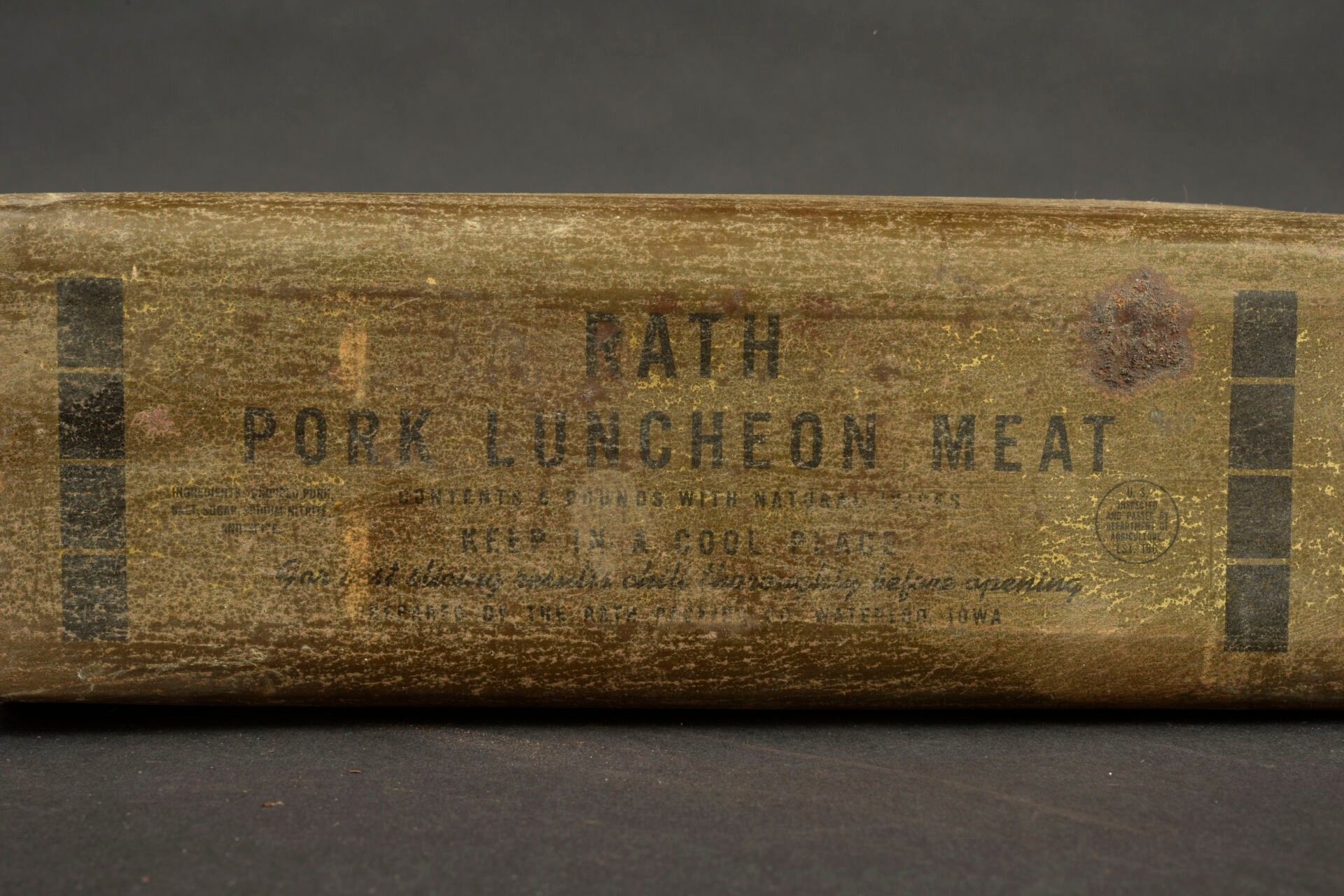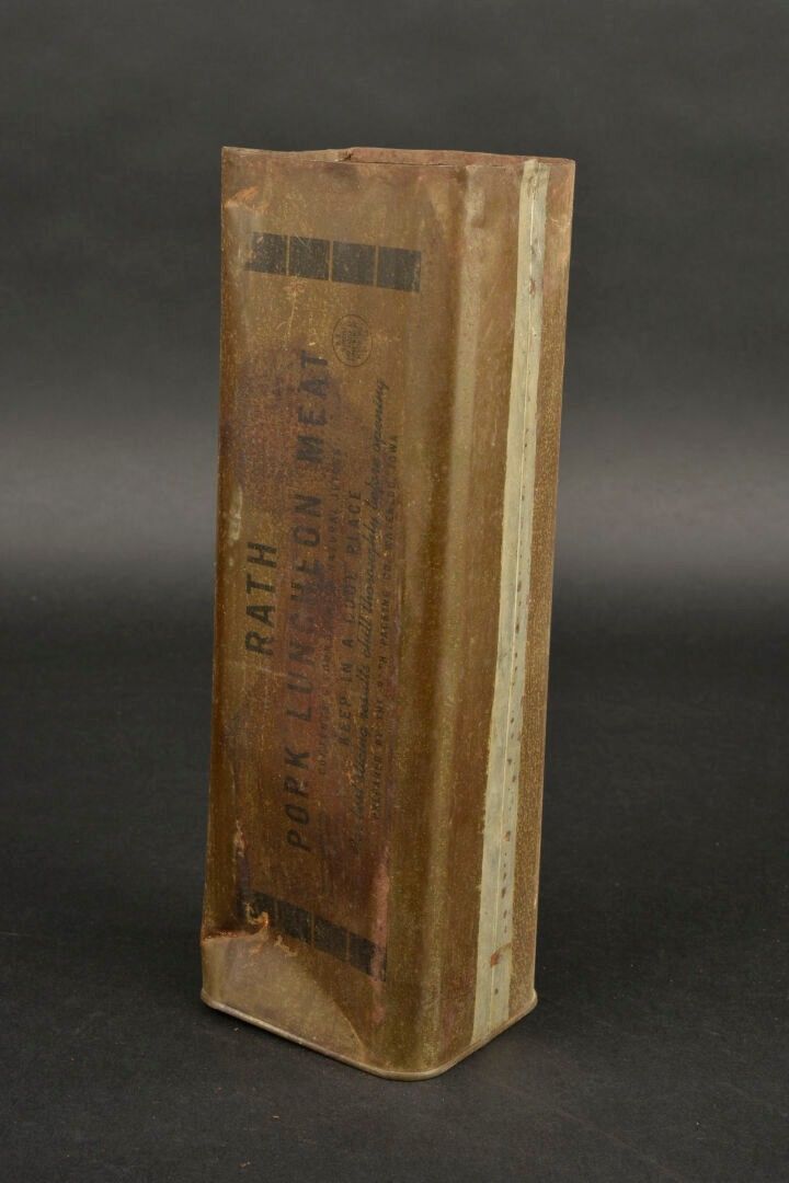 US ration box. Metal. Open and empty. One lid is missing. Markings Rath Pork Luncheon Meat. Manufactured by Rath Packing Co Waterloo Iowa. Some wear and oxidation. Condition II+. 2+