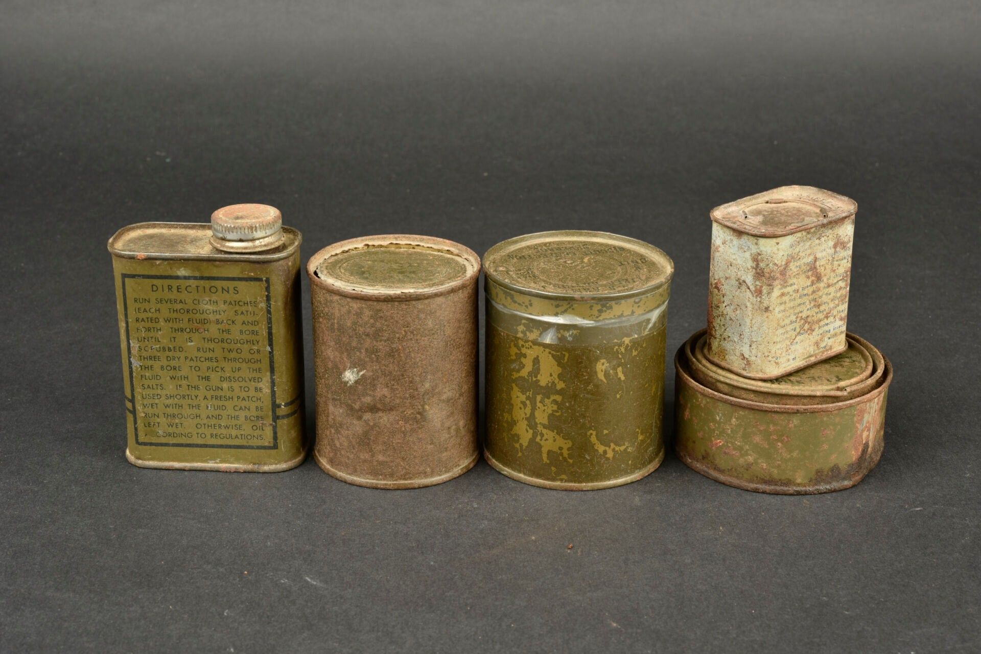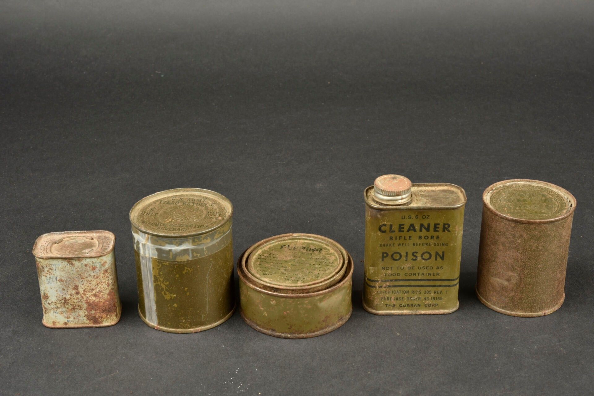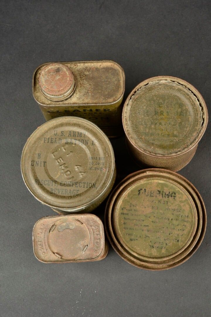 US ration tins. Comprising one metal can, empty, lid marked US Army Field Ration C B Unit Biscuit confection Beverage, Lemon L1-44. A tin of insecticide powder, complete but badly damaged. A ration tin, empty and open, markings illegible. A metal can with its cap, weapon cleaning product. Manufactured by The Curran Corps. Visibly half full. A complete box, marked Rubbing, badly damaged. To note a certain wear and patina of the parts. Condition II+. 2+