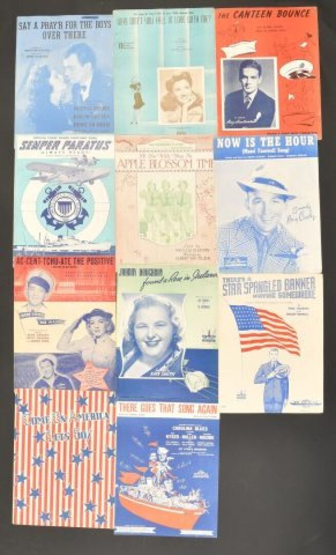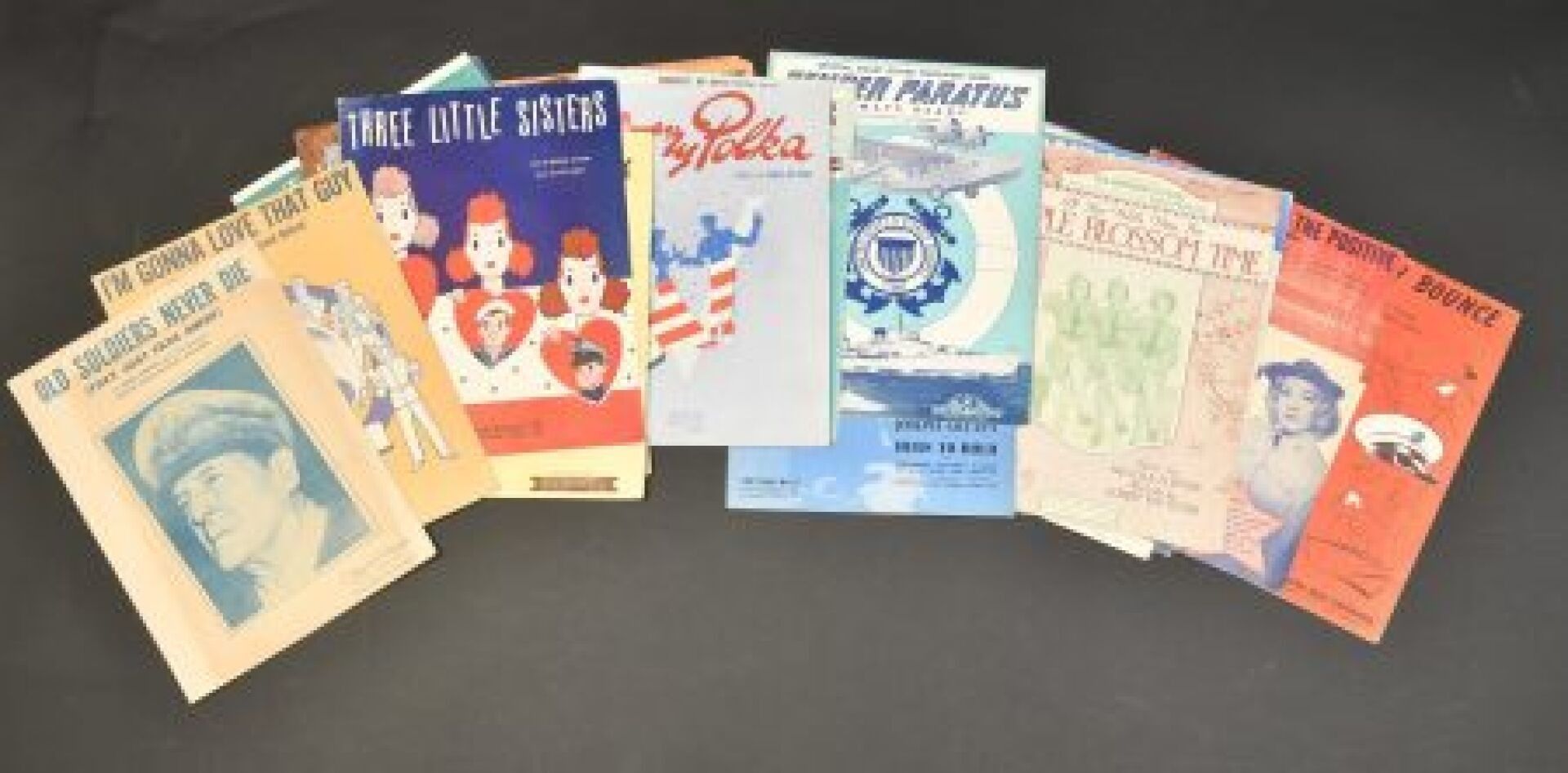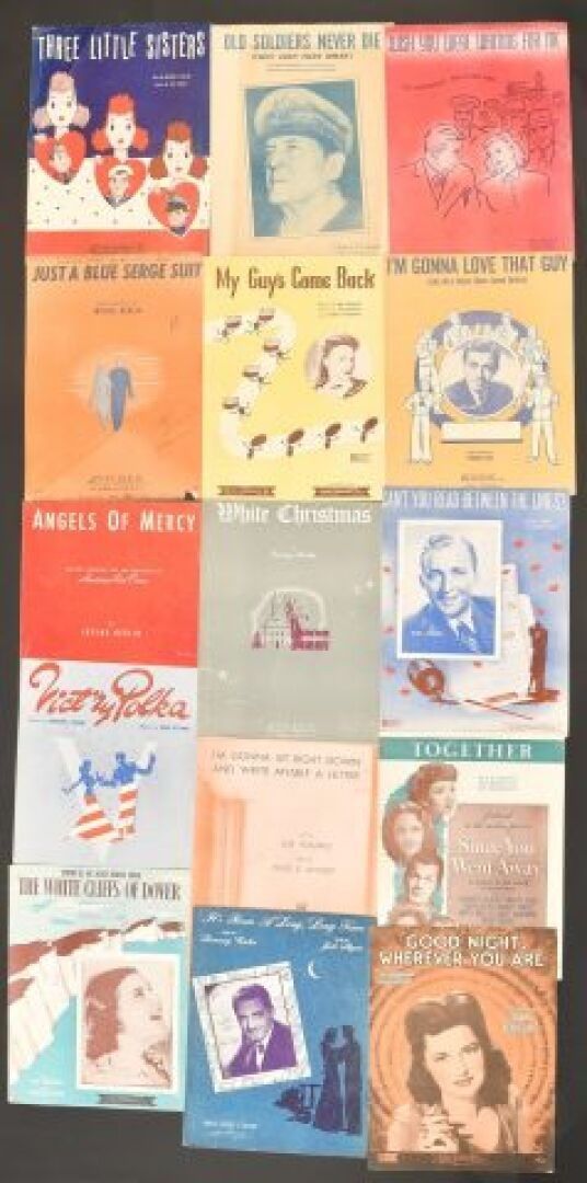 US songbooks. Including a copy entitled There's a star spangled banner wiwing somewhere, Now is the Hour, The Canteen Bounce, There Goes That Song Again, Johnny Doughboy found a Rose in Ireland, Apple Blossom Time, Why don't you fall in love with me, Come on America Let's Go, A Cent Tchu Ate The Positive, Semper Paratus, Say A Pray'r for the boys over there, Good Night Wherever You Are, Together, Can't you Read between the lines, i'm gonna love that guy, wish you were waiting for me, i'm gonna sit right down and write myself a letter, white christmas, my guy's come back, old soldiers never die, The white cliffs of dover, Vict ry Polka, Angels of Mercy, Just a blue Serge suit, it's been a long long time, and three little sisters. Some wear and patina to be noted. Condition II+. 2+