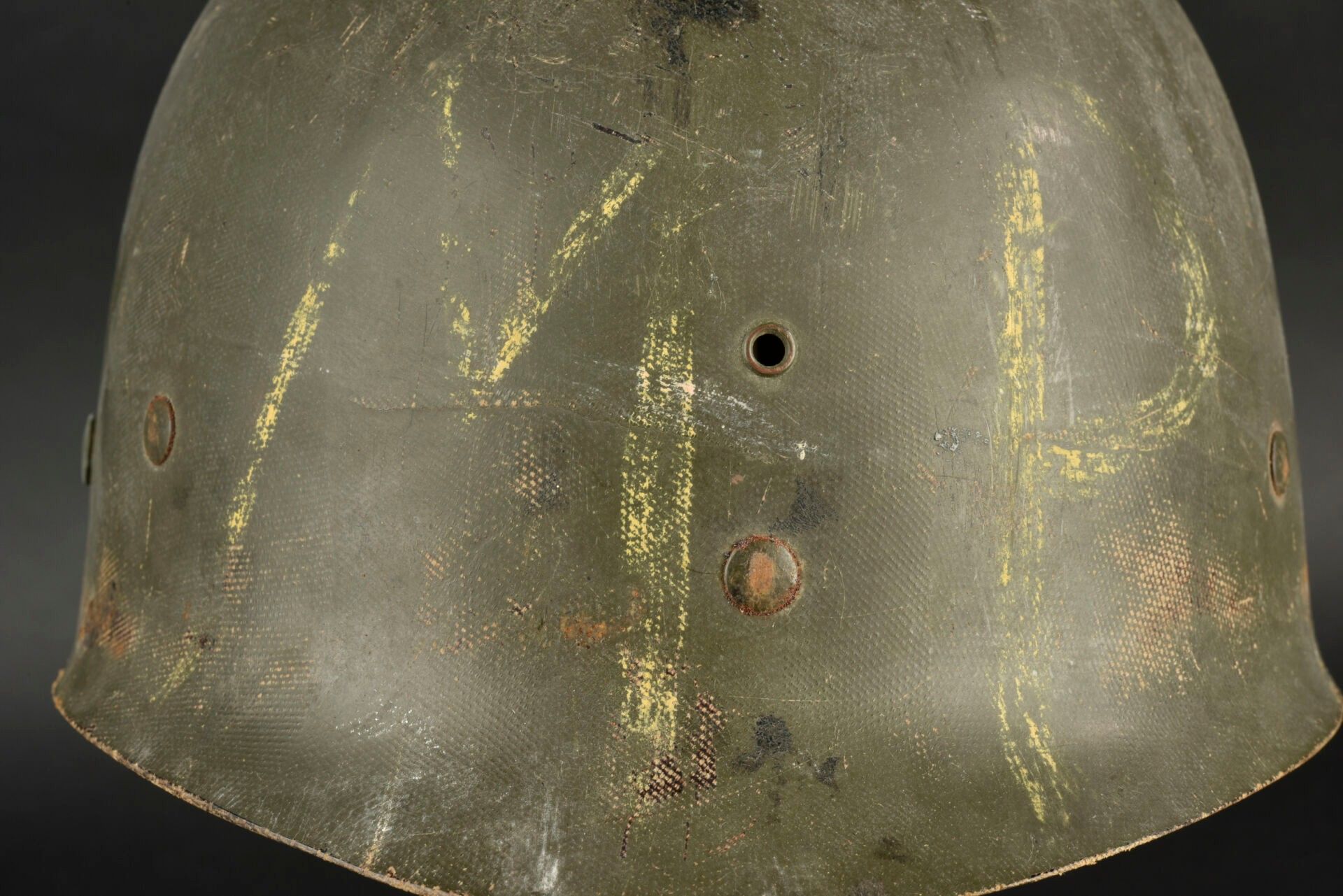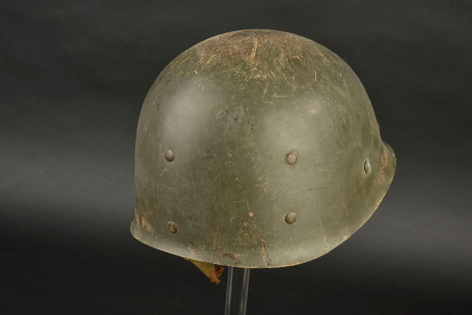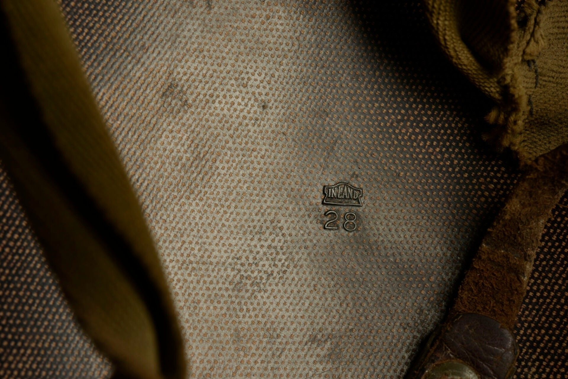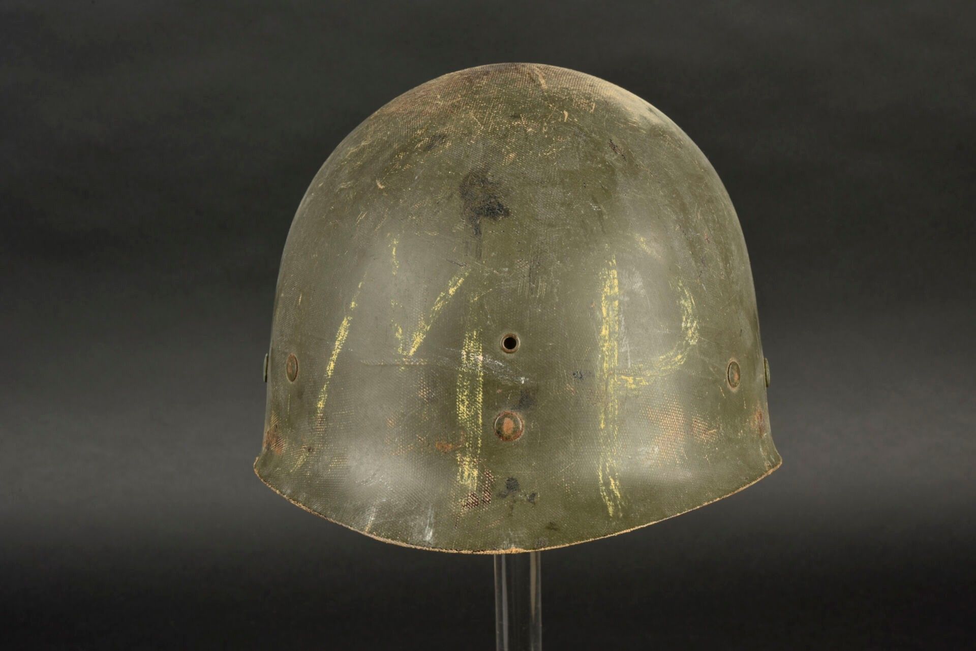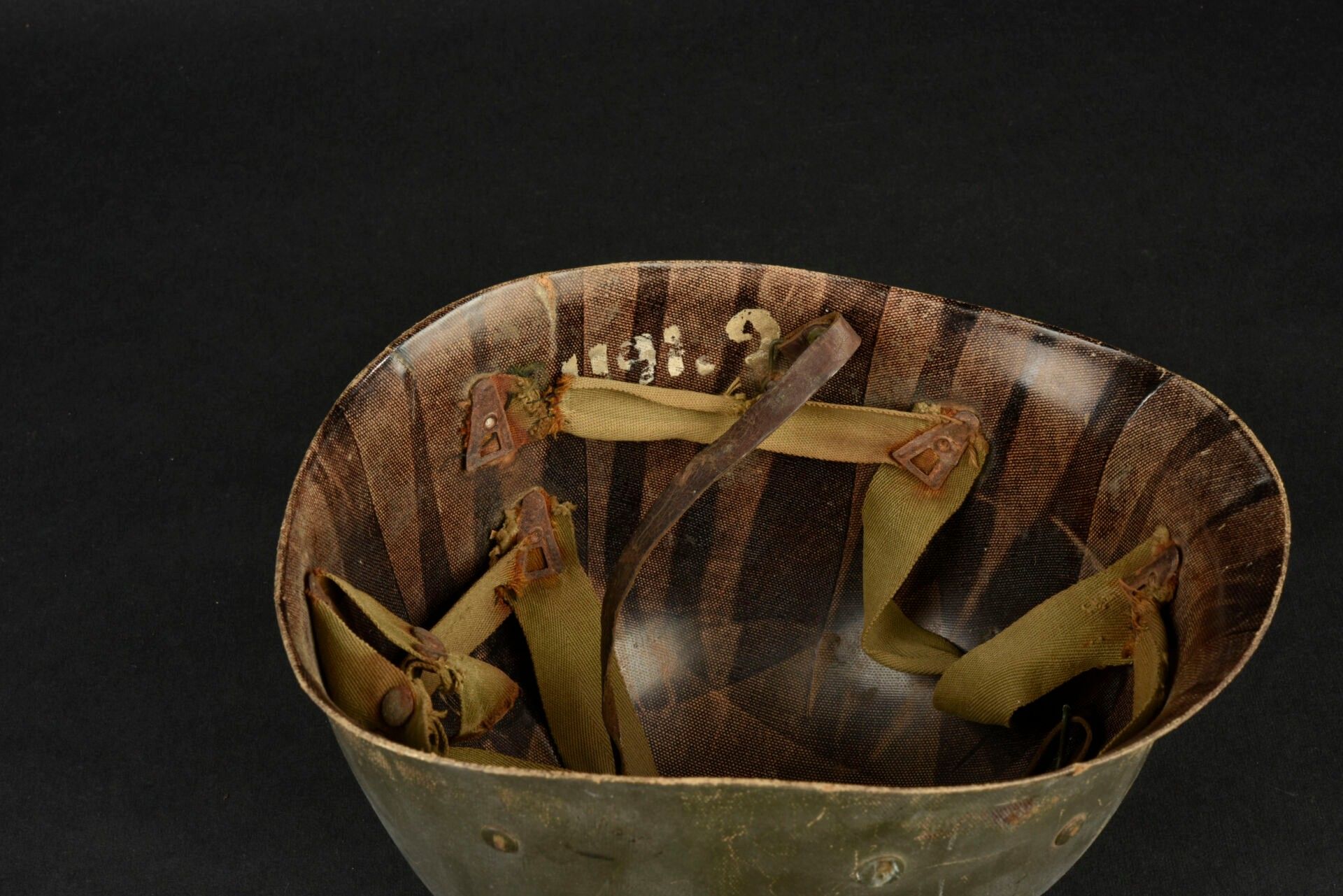 US Military Police liner. High-pressure composite liner. Inland manufacture. Cap present but incomplete. Some straps are cut or torn. The neck strap is present. The drawstring and sweatband are missing. Complete leather chinstrap with no visible markings. Laundry number G-1611, painted in white on the inside of the shell. All metal parts heavily oxidised. 70% OD7 exterior paintwork. MP lettering on the front of the hull, painted in yellow by hand. Some wear and patina. Condition II+. 2+