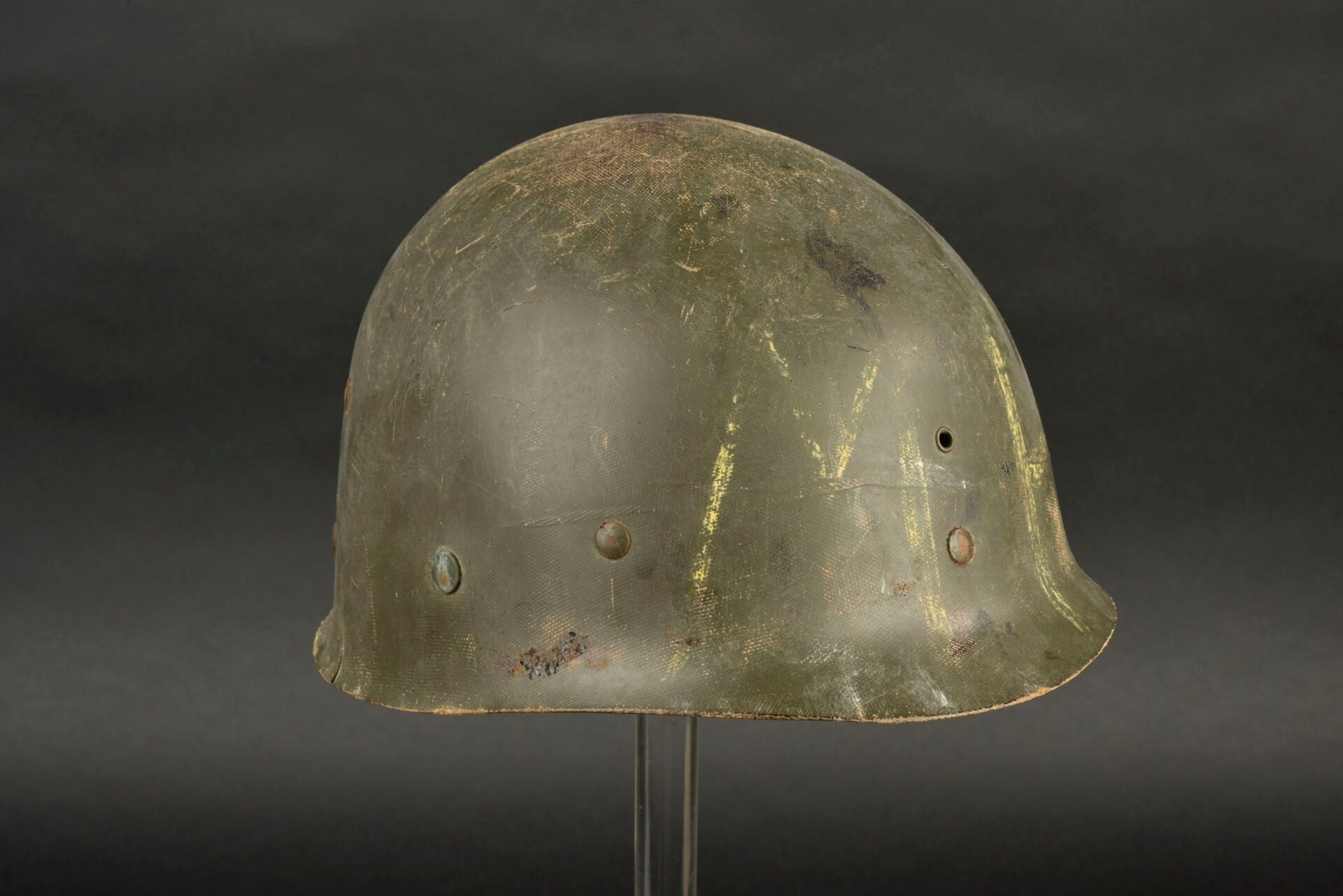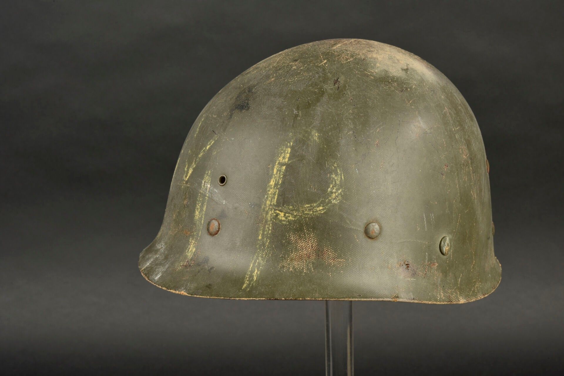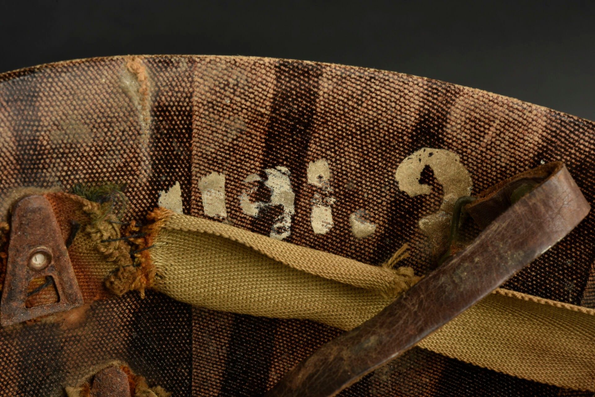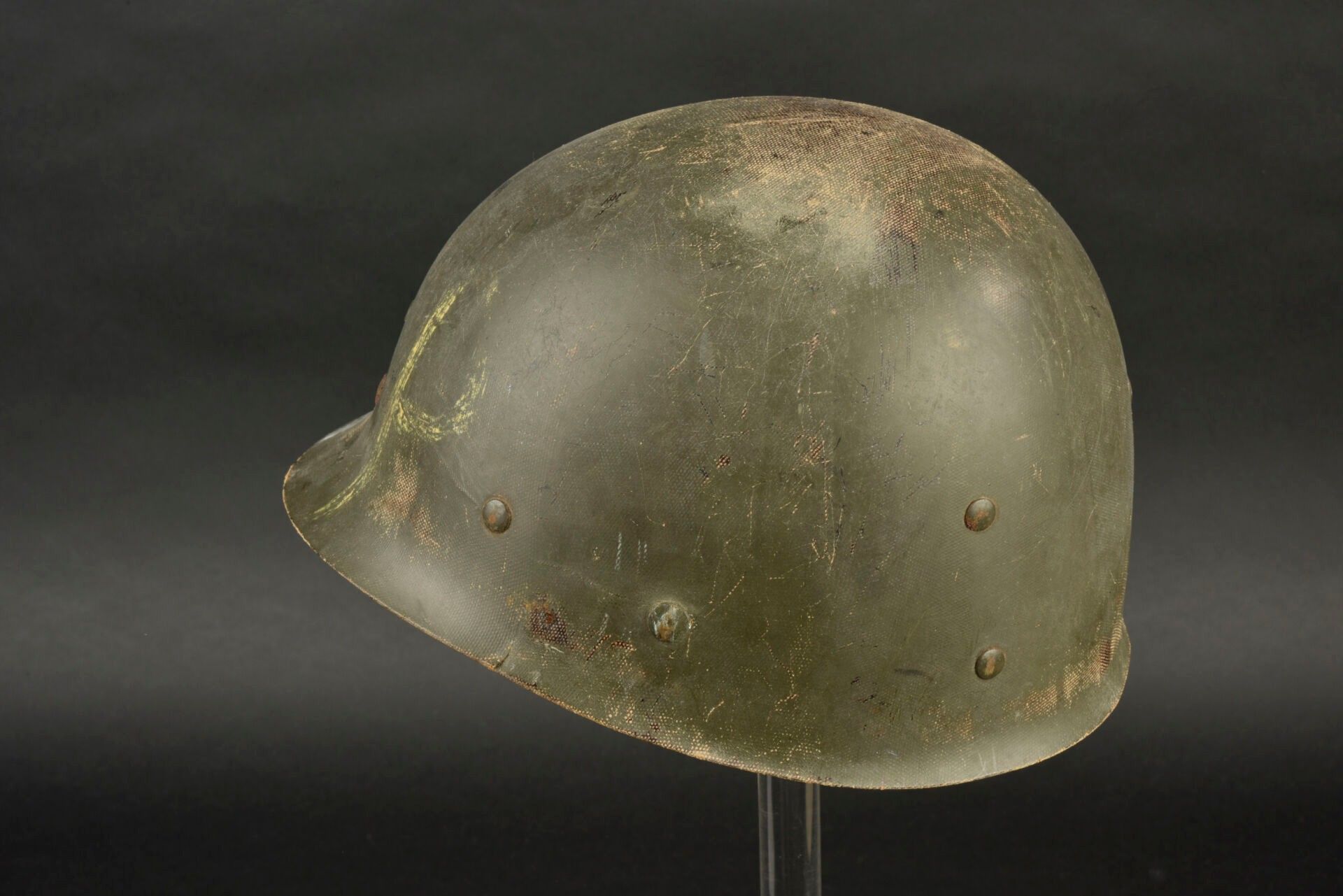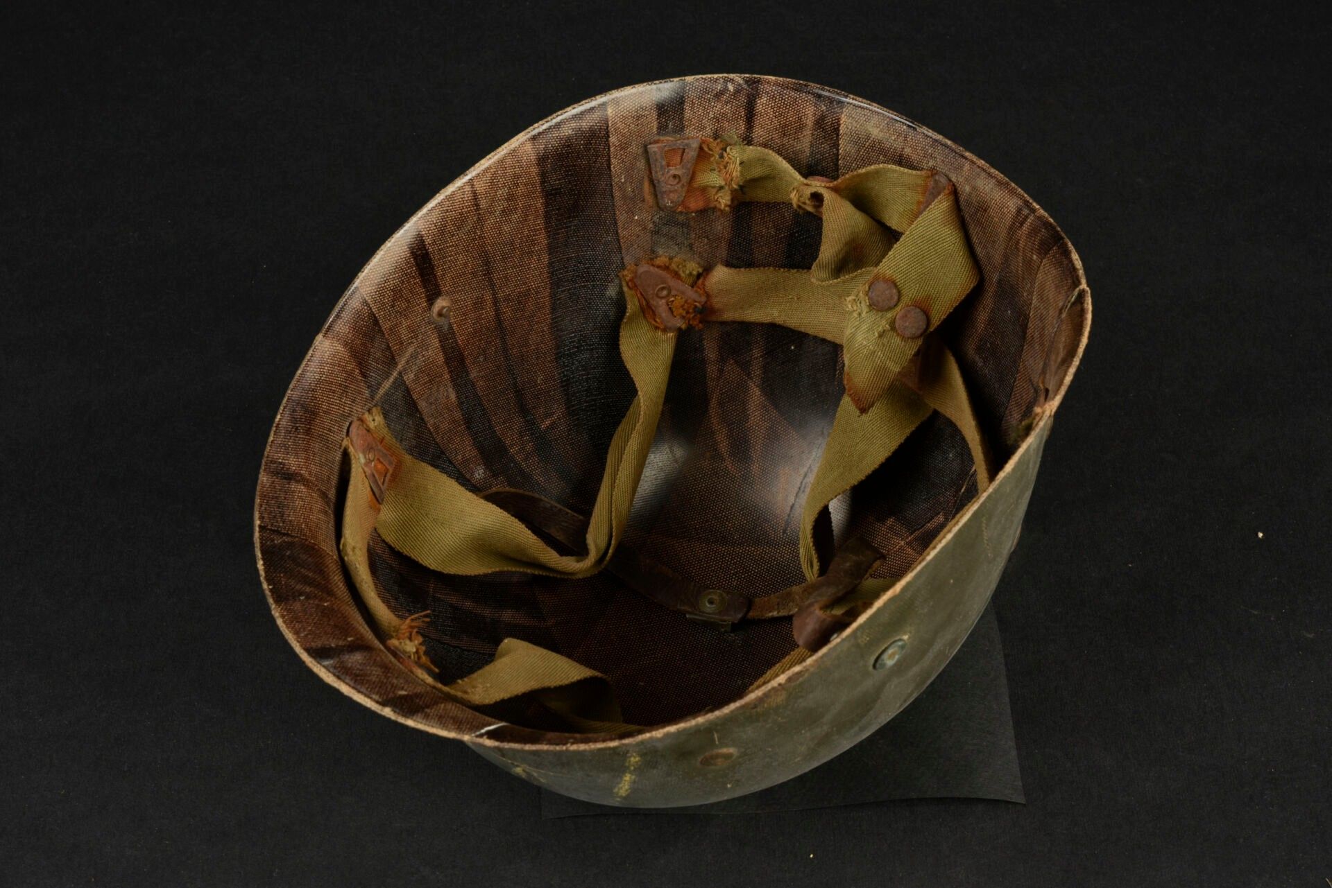 US Military Police liner. High-pressure composite liner. Inland manufacture. Cap present but incomplete. Some straps are cut or torn. The neck strap is present. The drawstring and sweatband are missing. Complete leather chinstrap with no visible markings. Laundry number G-1611, painted in white on the inside of the shell. All metal parts heavily oxidised. 70% OD7 exterior paintwork. MP lettering on the front of the hull, painted in yellow by hand. Some wear and patina. Condition II+. 2+
