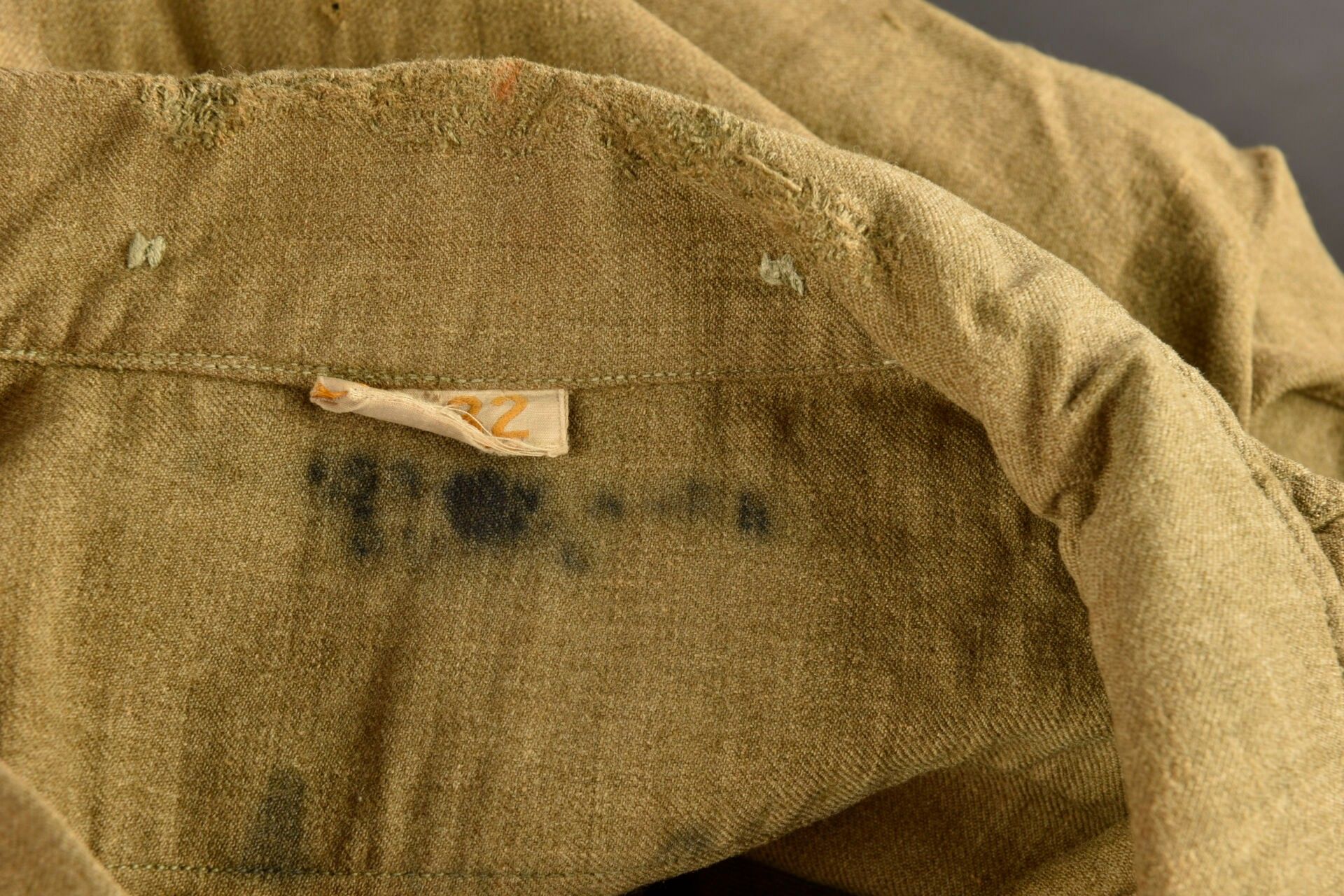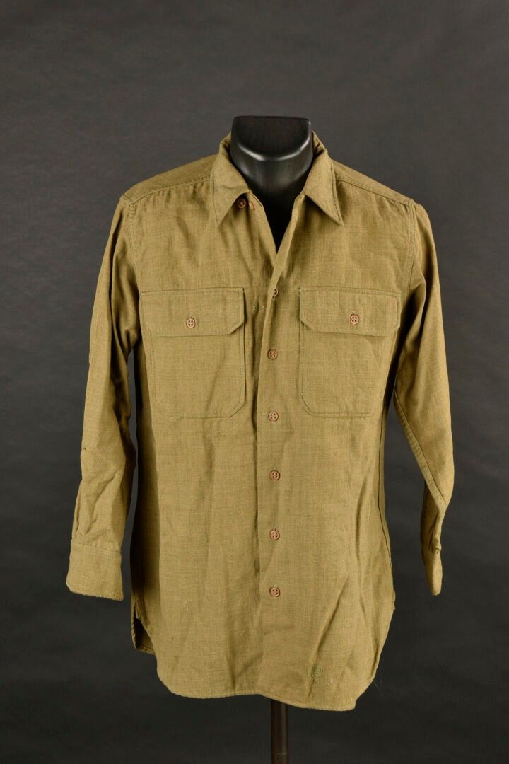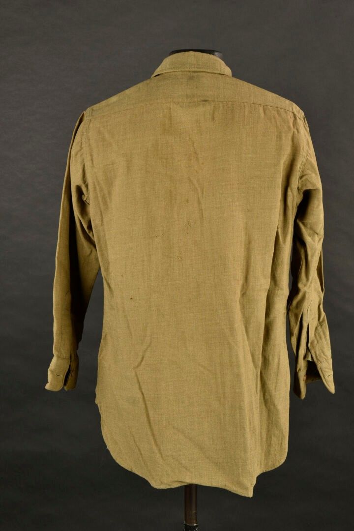 Mustard shirt. In mustard cloth. All buttons are present. Label in the collar indicating a size 15-32. Remains of laundry numbers illegible. Model without gas flap. Manufacturer's label missing. There is some wear and patina to the garment, as well as snags, repairs and stains. Condition II+. 2+
