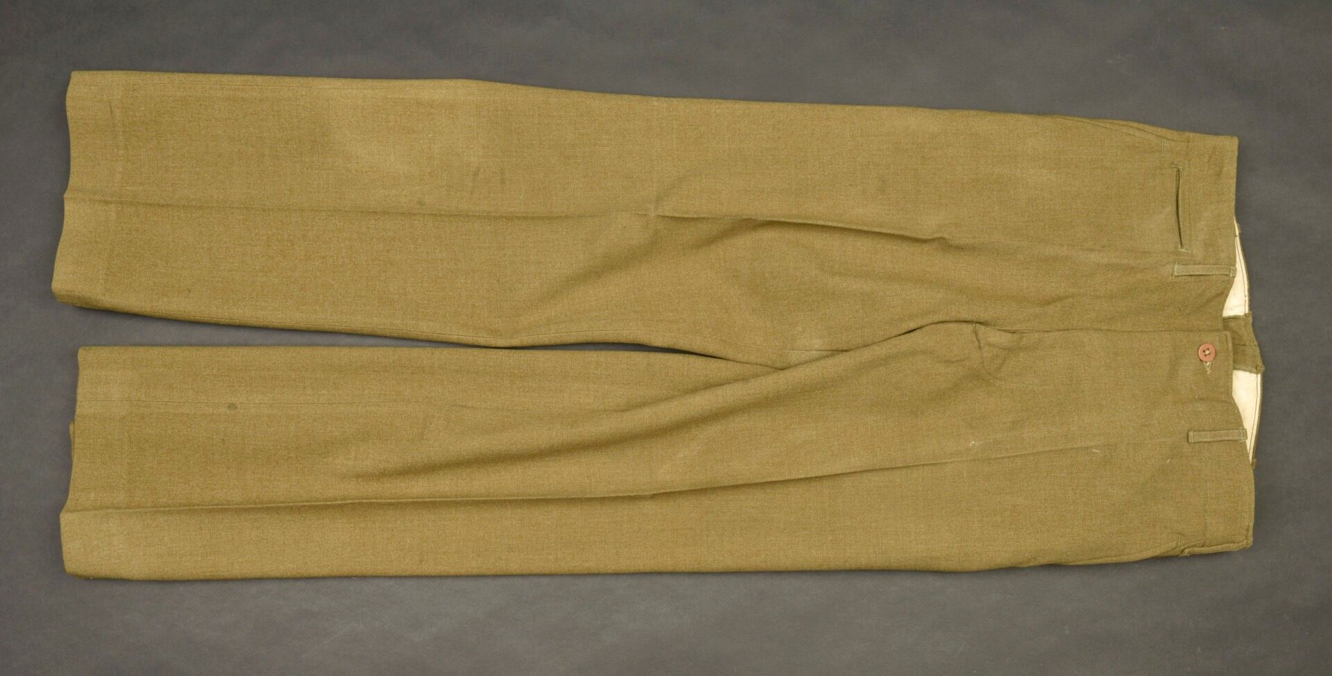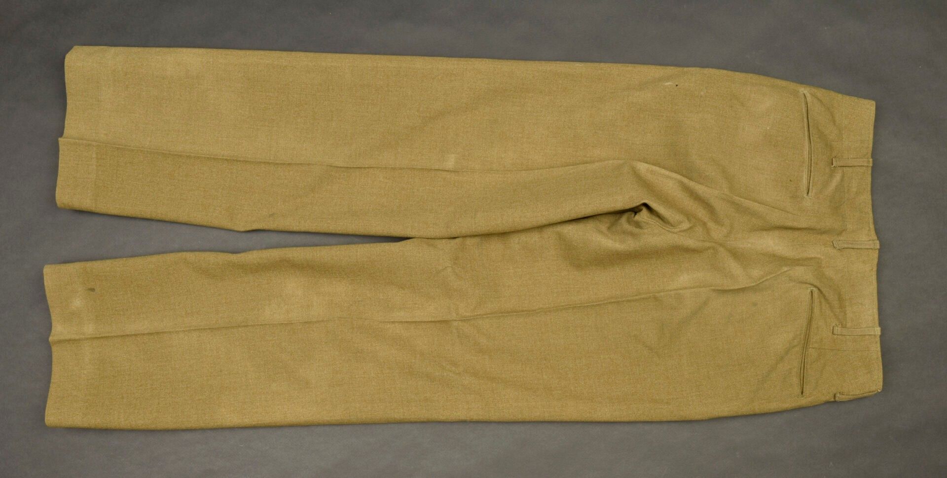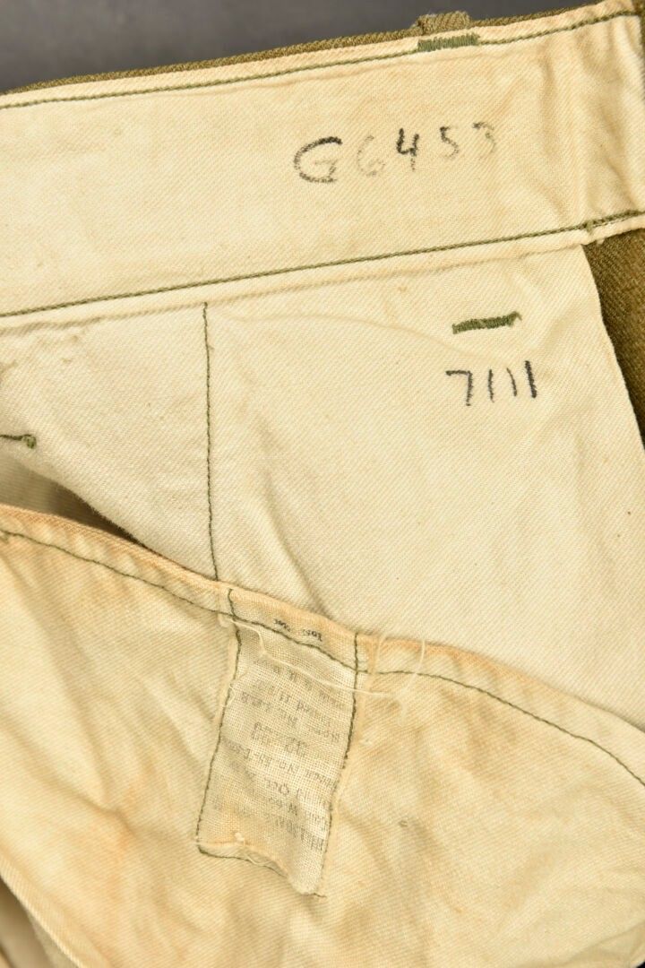 US mustard trousers. In mustard-coloured cloth. All buttons are present. Model without gas flap. White cotton lining. Laundry number G-6453. Manufacturer's label present, but illegible. Some wear and patina, as well as stains and tears. Condition II+. 2+