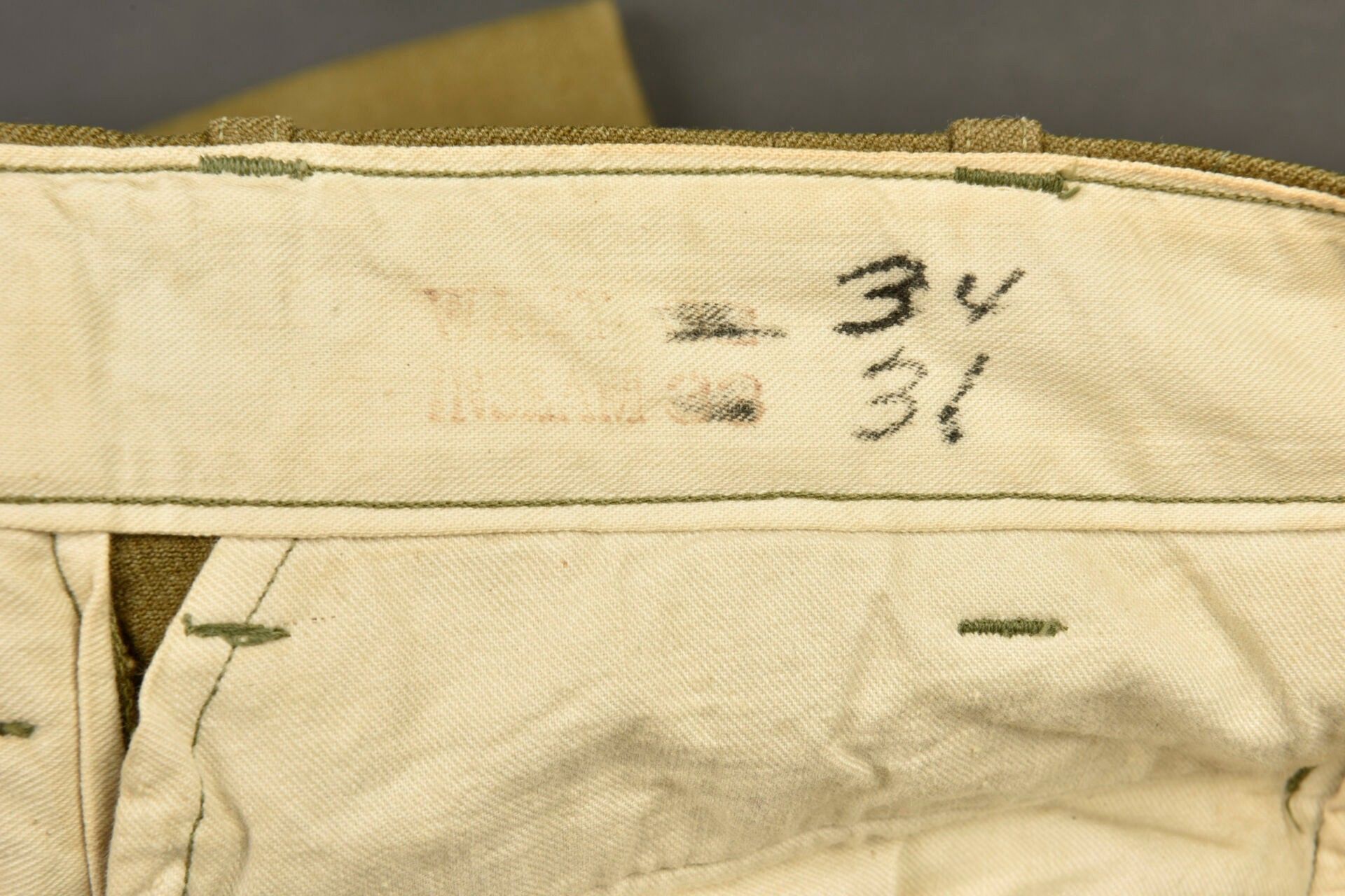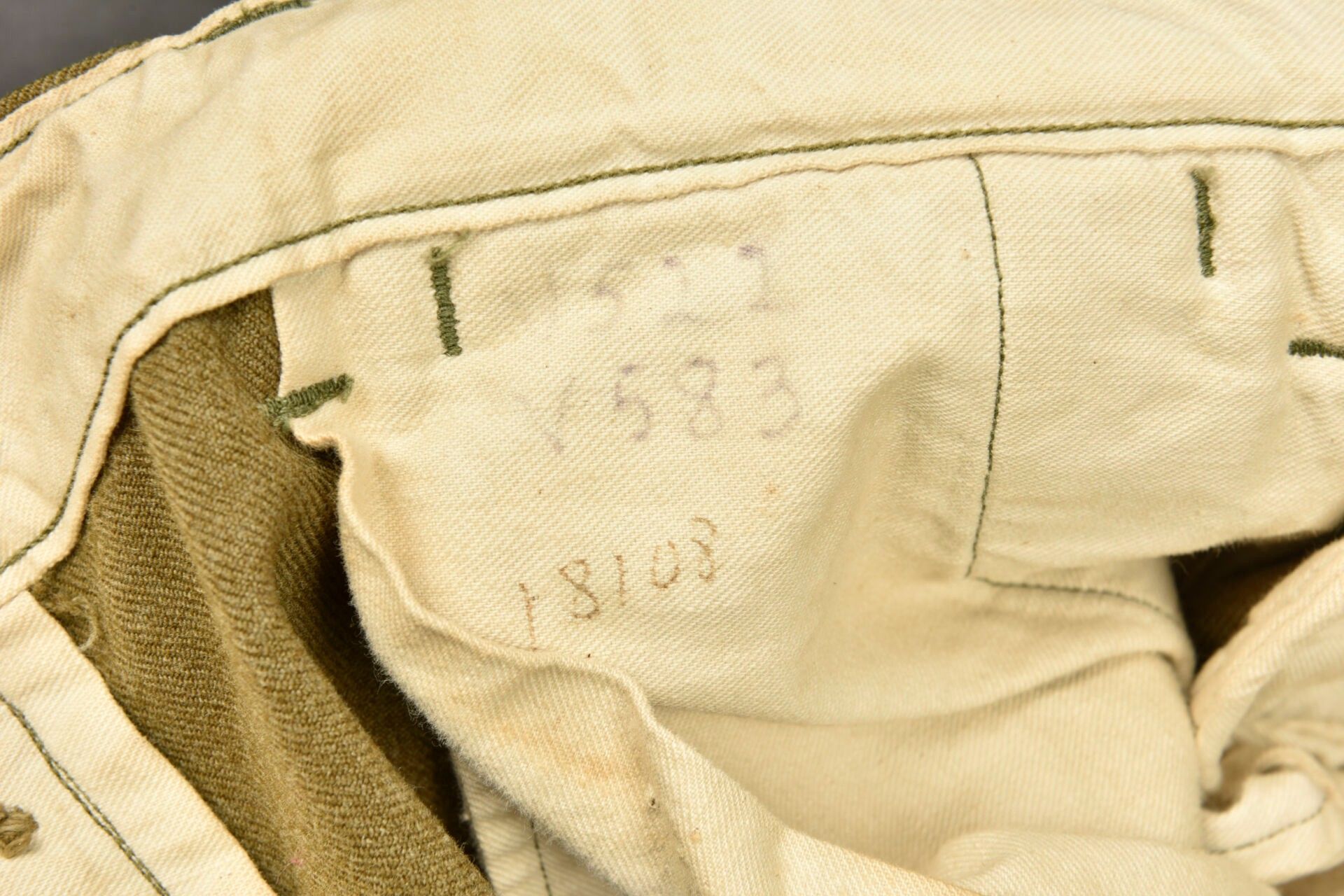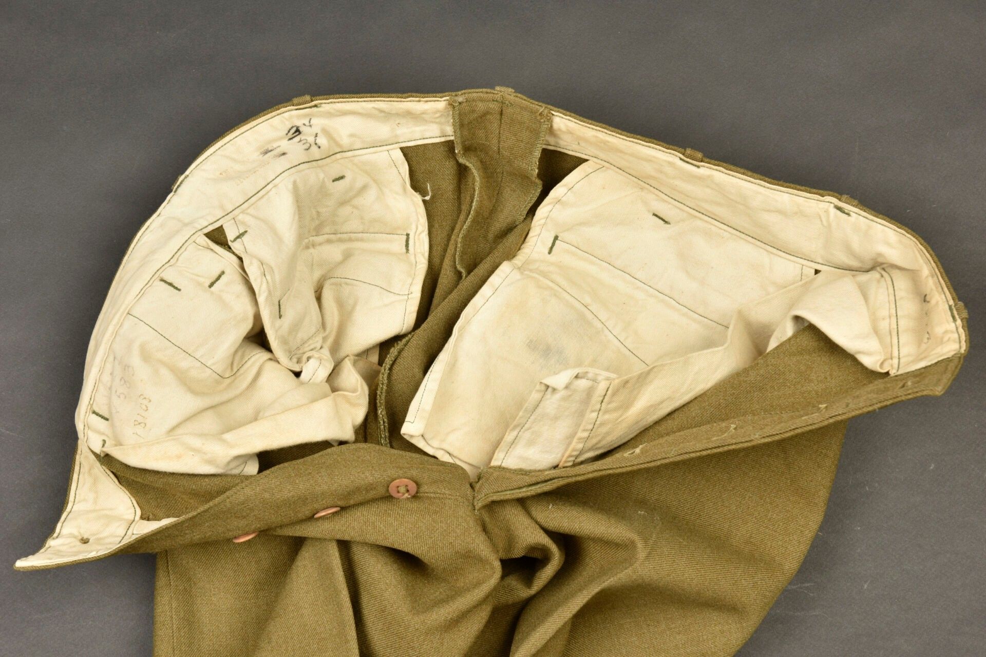 US mustard trousers. In mustard-coloured cloth. All buttons are present. Model without gas flap. White cotton lining. Laundry number G-6453. Manufacturer's label present, but illegible. Some wear and patina, as well as stains and tears. Condition II+. 2+