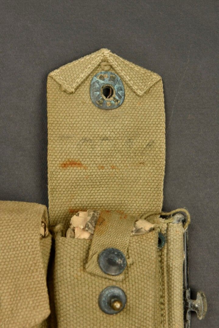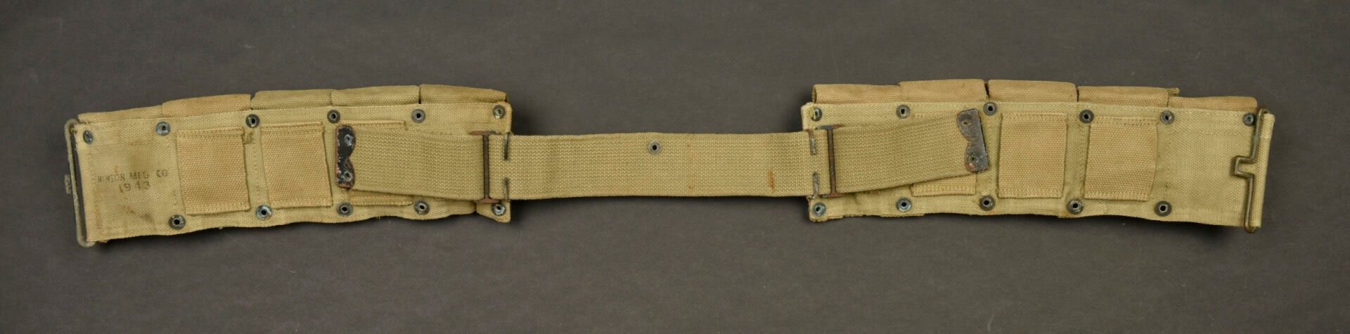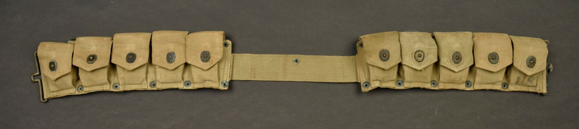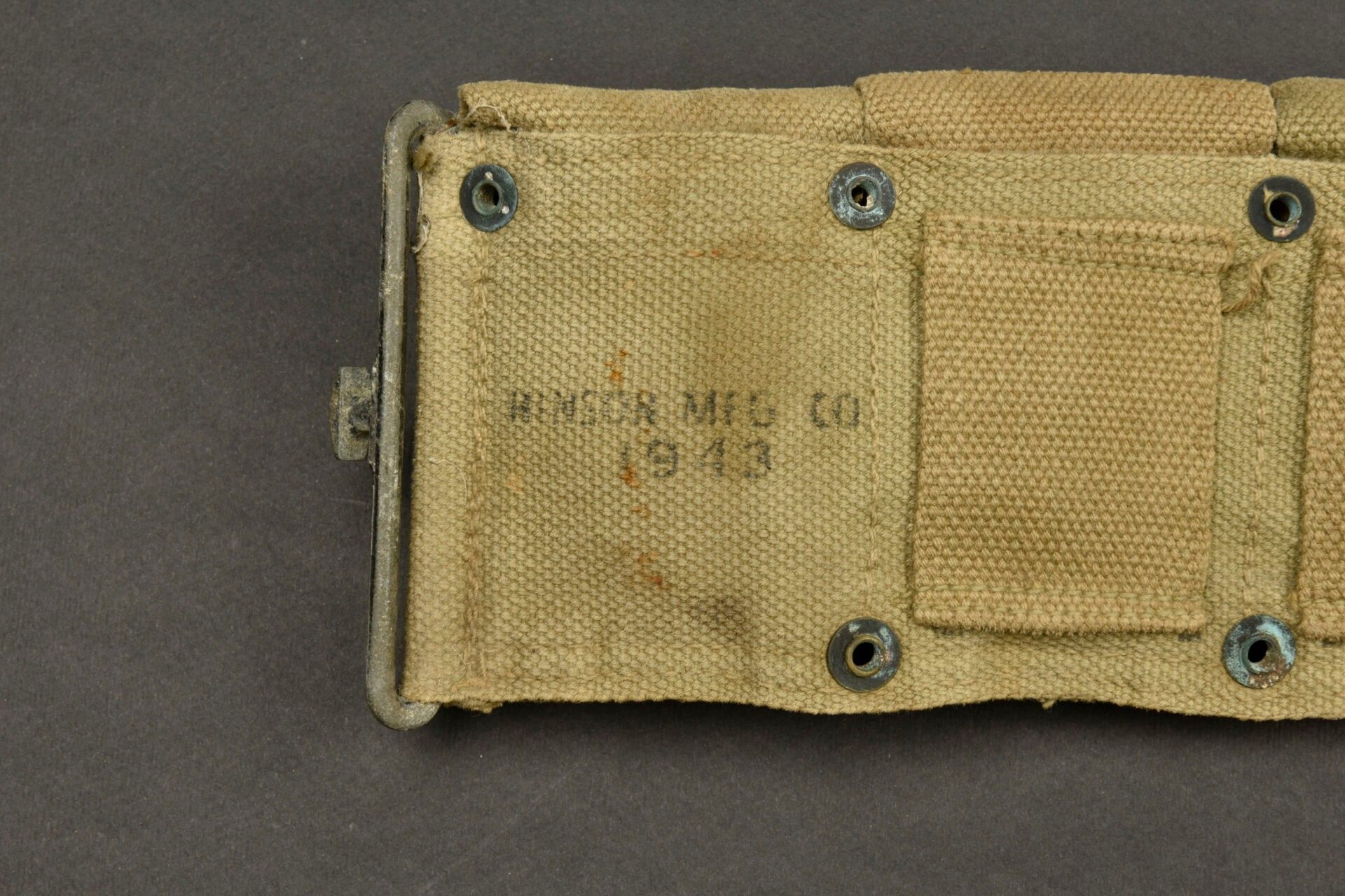 Garand belt. Heavy OD canvas. All flaps are present. The press studs are functional. Brass buckle. Remainder of US marking on first pocket. Dated 1943. Some wear, patina and stains. Condition II+. 2+