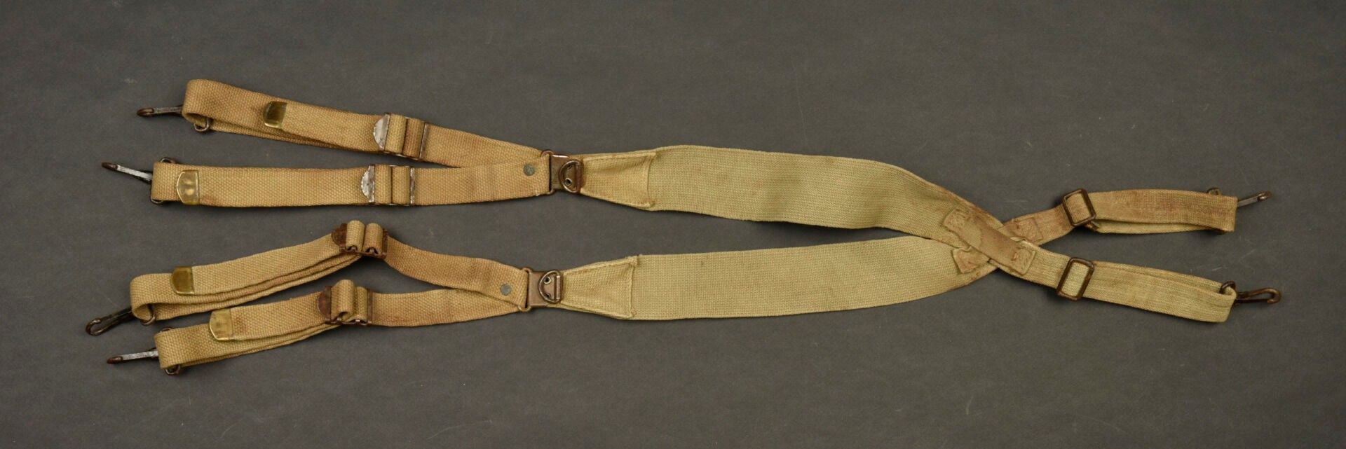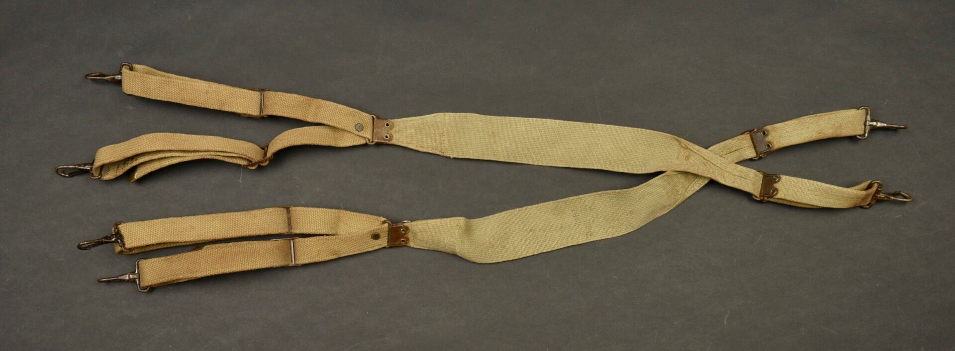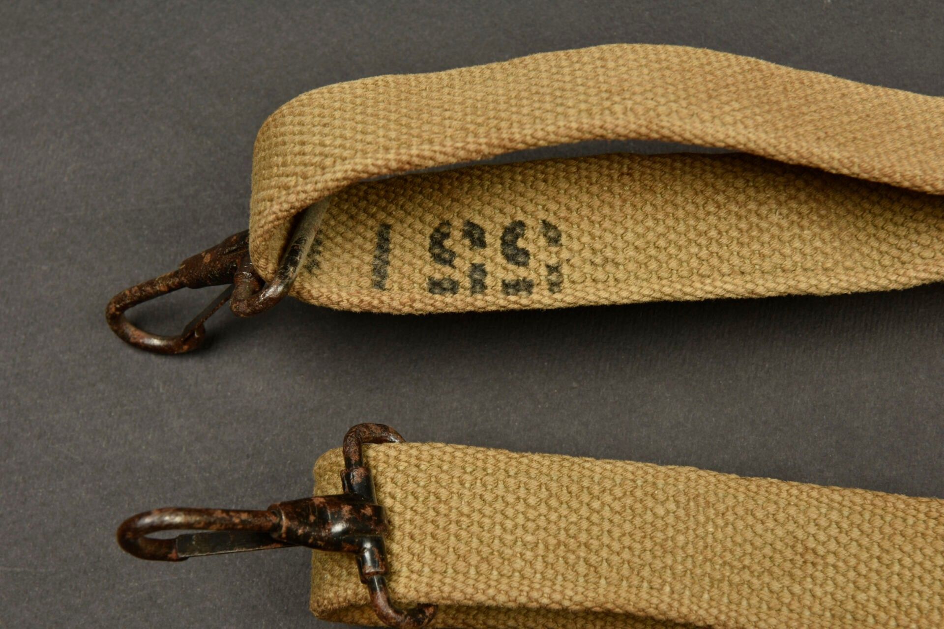 M-36 Brelage. Heavy OD canvas. All snap hooks are present and complete. Manufacturer's markings are illegible. Metal parts are oxidised. Remainder of Laundry Number illegible. Some wear, patina and stains. Condition II+. 2+