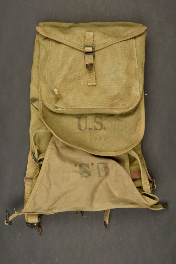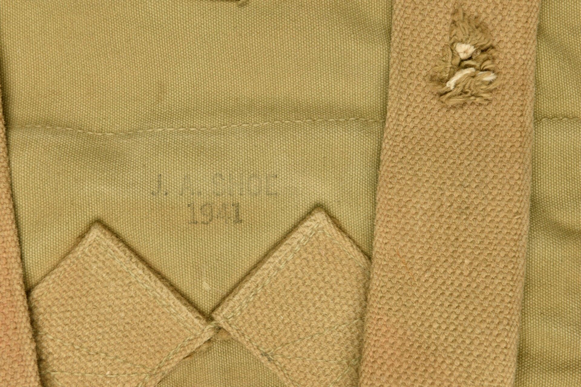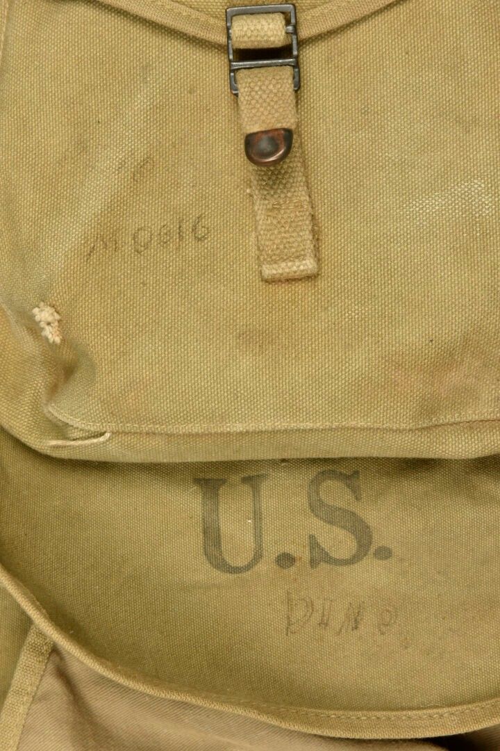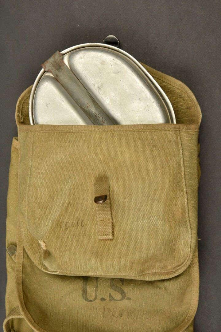 M-28 US bag. Heavy OD canvas. All straps are present. Carabiners are functional and complete. The triangle is present, with its nice US marking and its leather tab. Made by JA Shoe 1941. Remains of illegible laundry number. Complete mess tin pouch, laundry number M-0616. Complete mess tin, dated 1944. Some wear and patina, as well as stains and tears. Condition II+. 2+