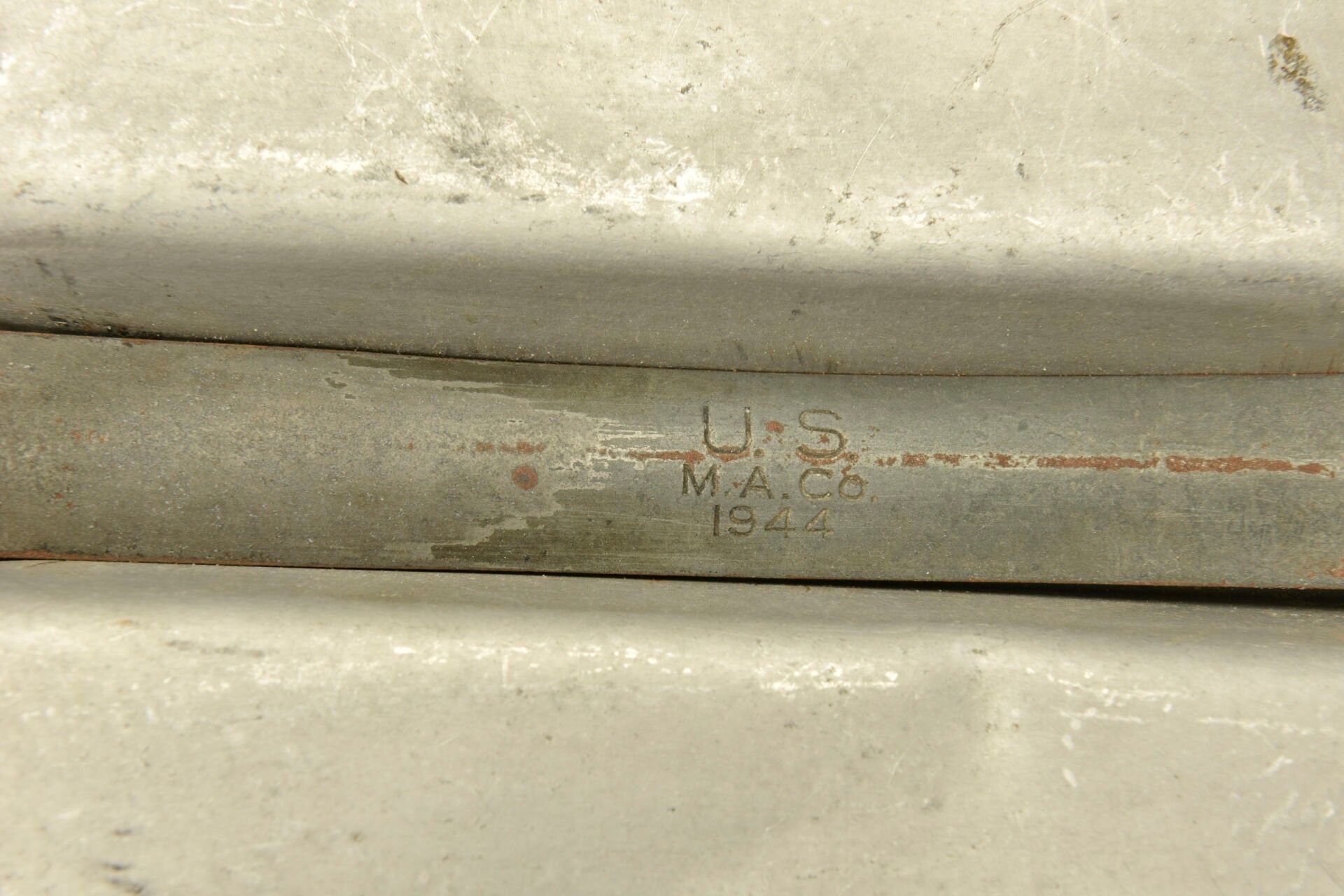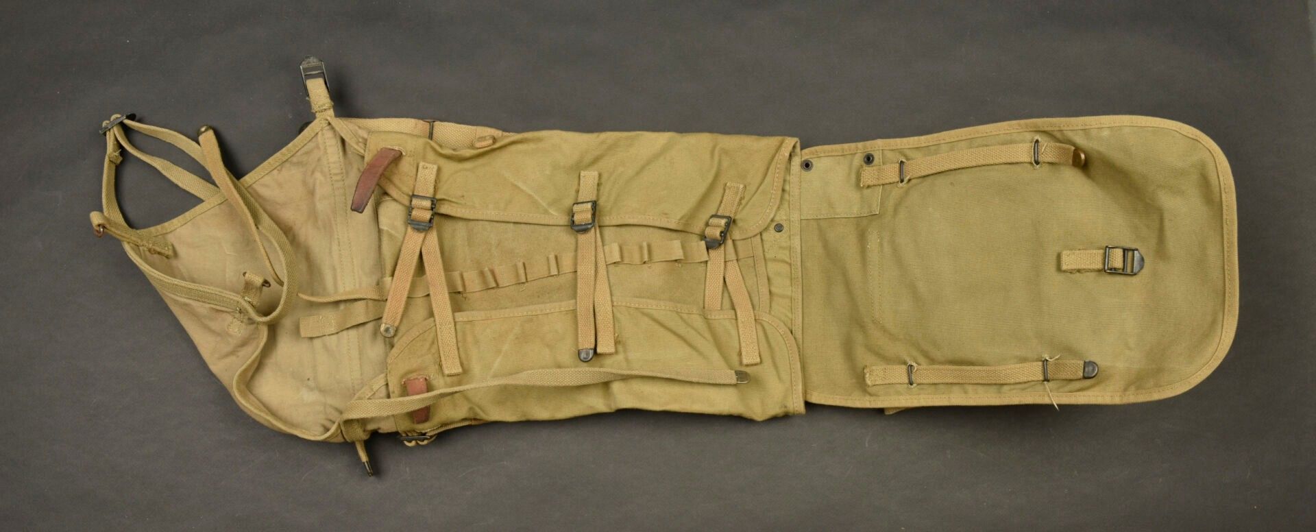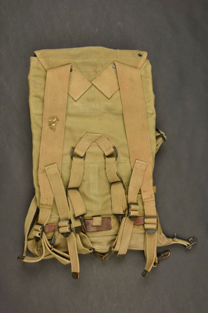 M-28 US bag. Heavy OD canvas. All straps are present. Carabiners are functional and complete. The triangle is present, with its nice US marking and its leather tab. Made by JA Shoe 1941. Remains of illegible laundry number. Complete mess tin pouch, laundry number M-0616. Complete mess tin, dated 1944. Some wear and patina, as well as stains and tears. Condition II+. 2+