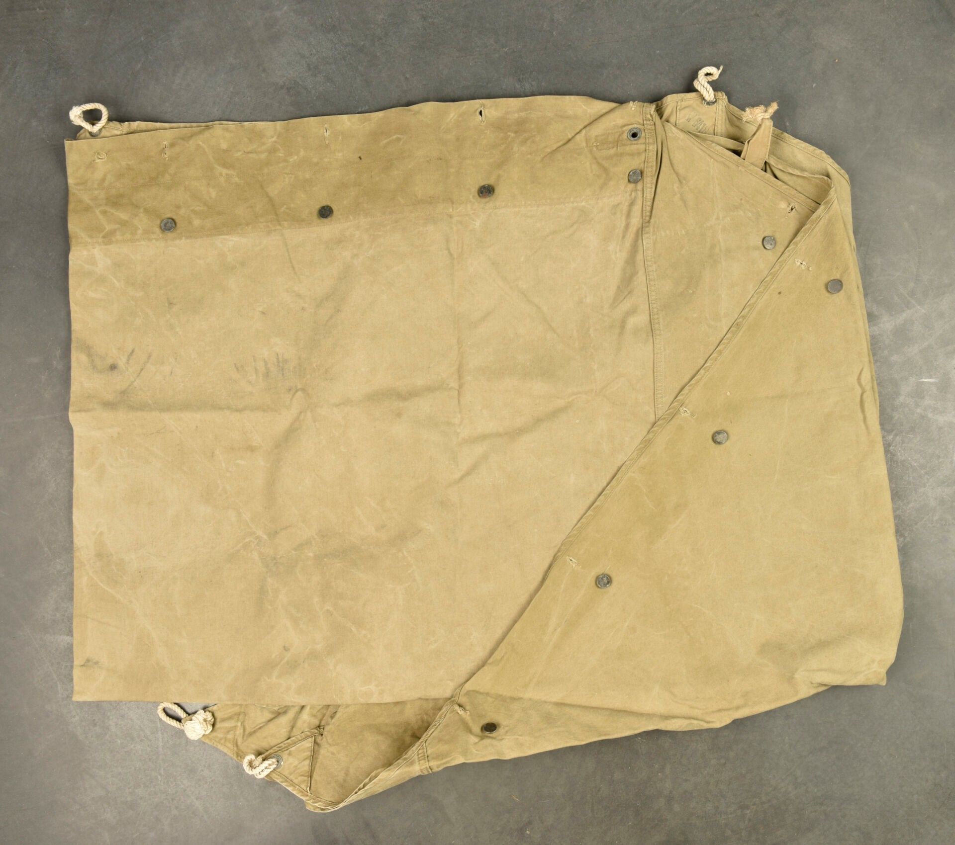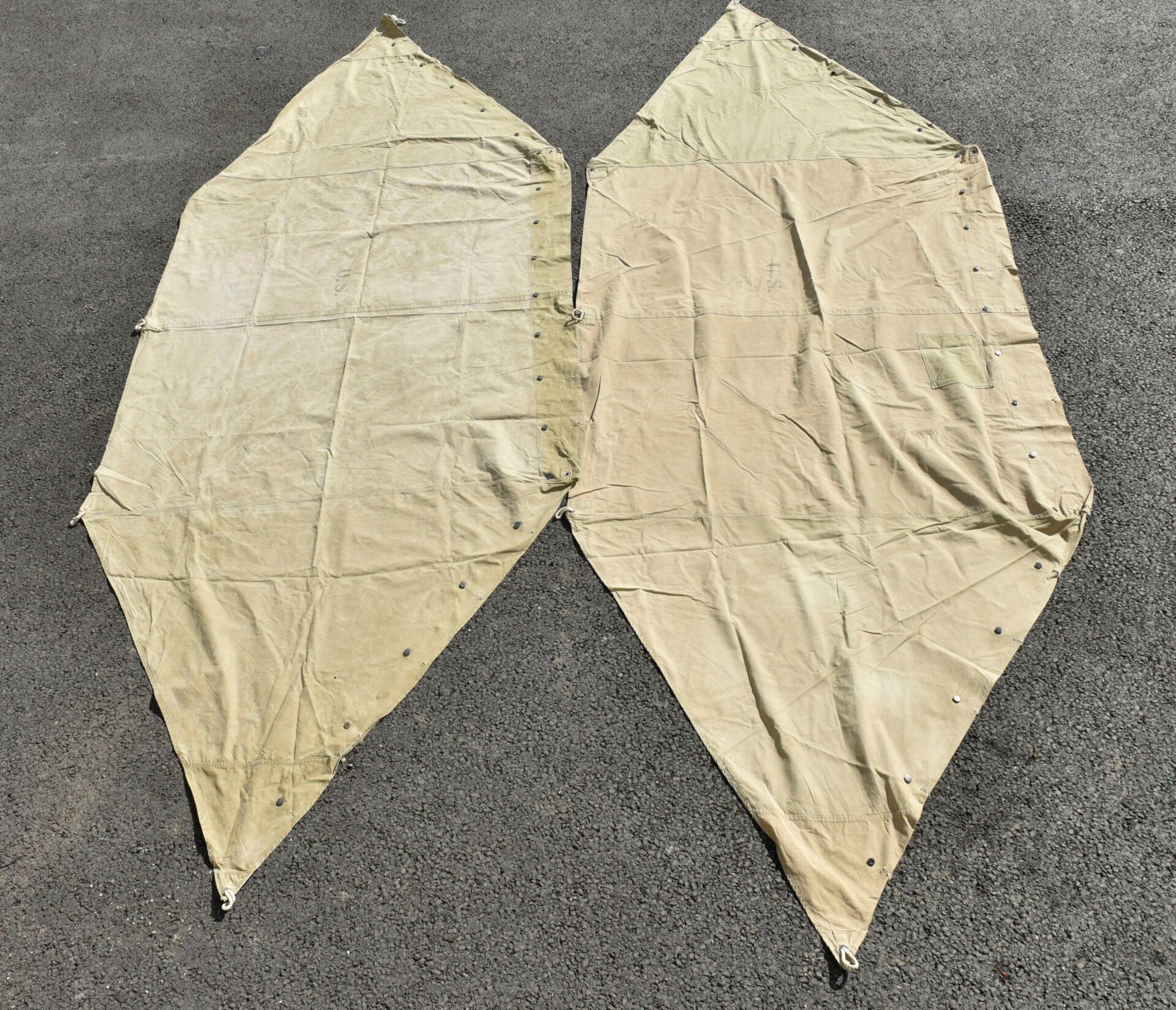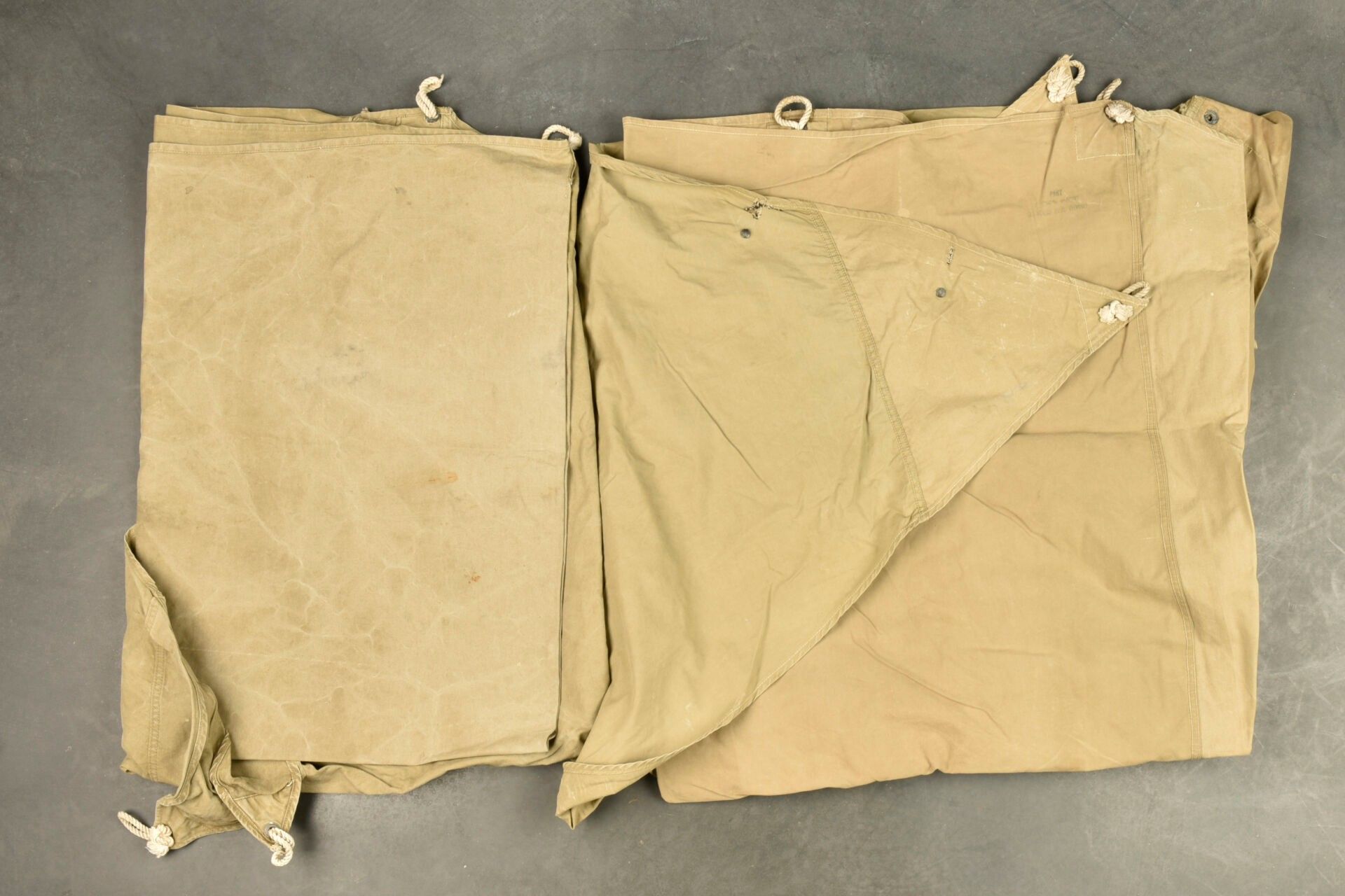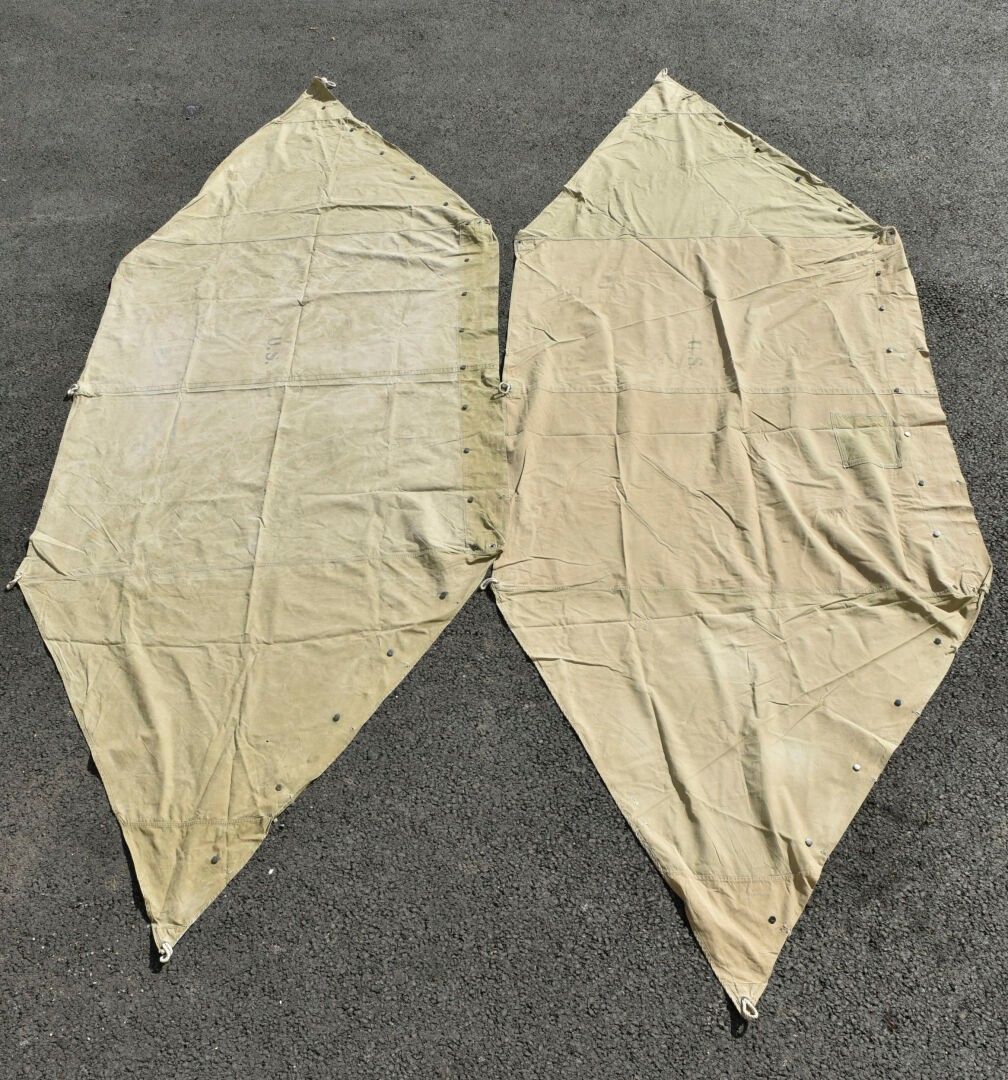 US tent fabrics. Two half-tents in strong OD canvas. Most of the buttons are present. Remains of US markings in the centre of the pieces. Some cords are present. The markings are illegible. Some wear, patina and stains. Condition II+. 2+