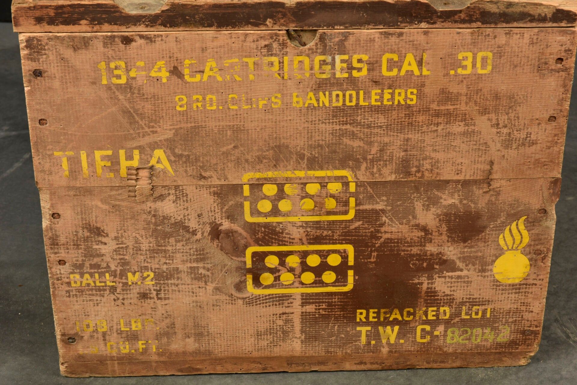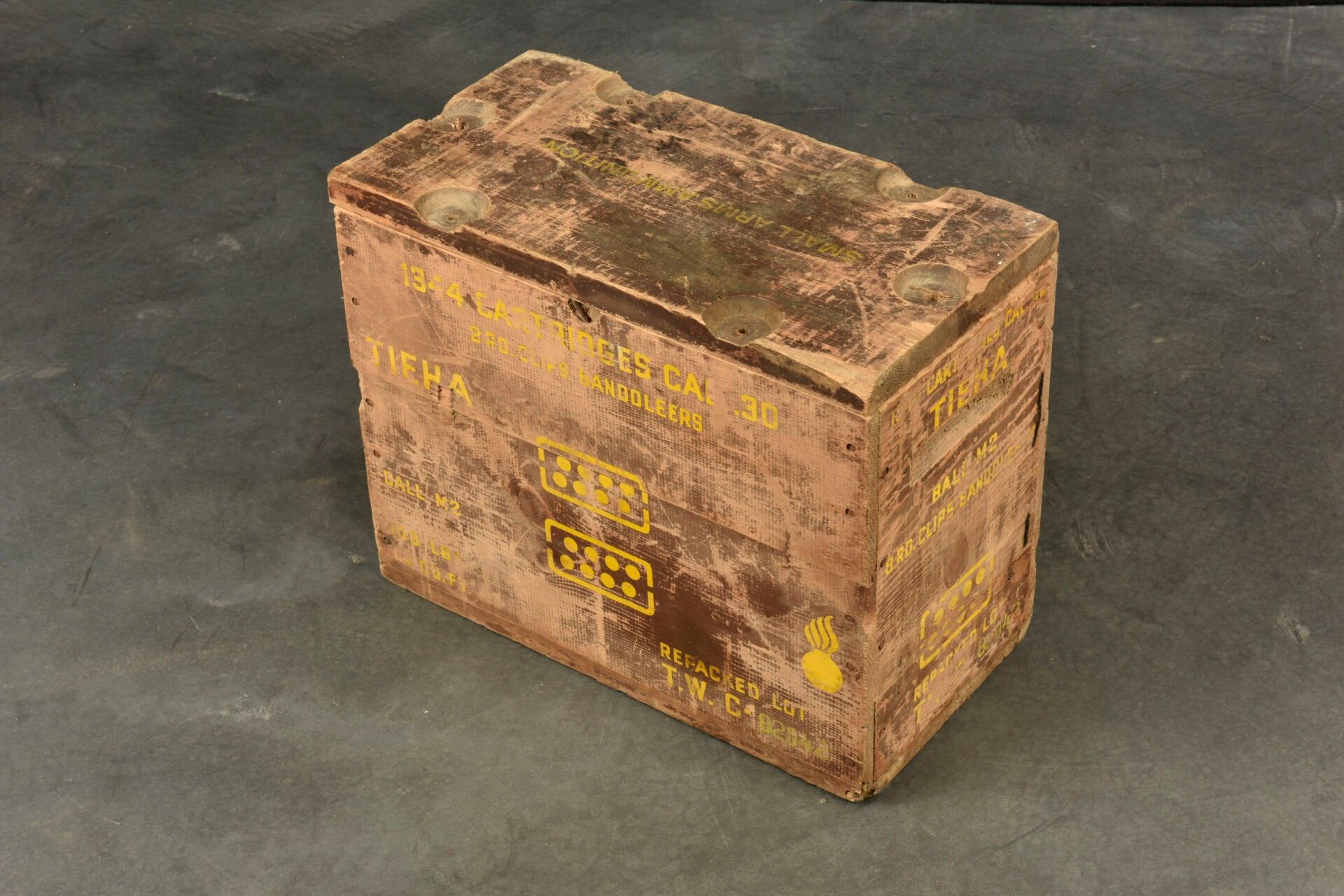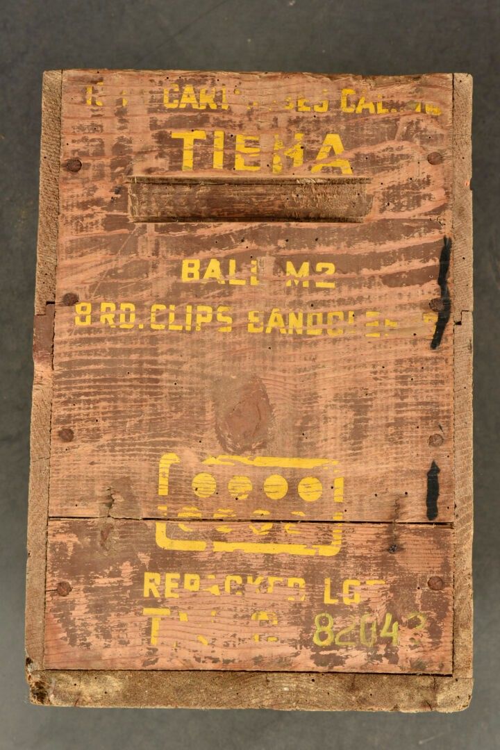30 US ammunition box. Wooden, complete with lid, empty. The closing screws are missing. Markings on lid Small Arms Ammunition. Side markings 1344 Cartridges Cal 30 8RD Clips Bandoleers Ball M2. Some wear and patina to be noted. Condition II+. 2+