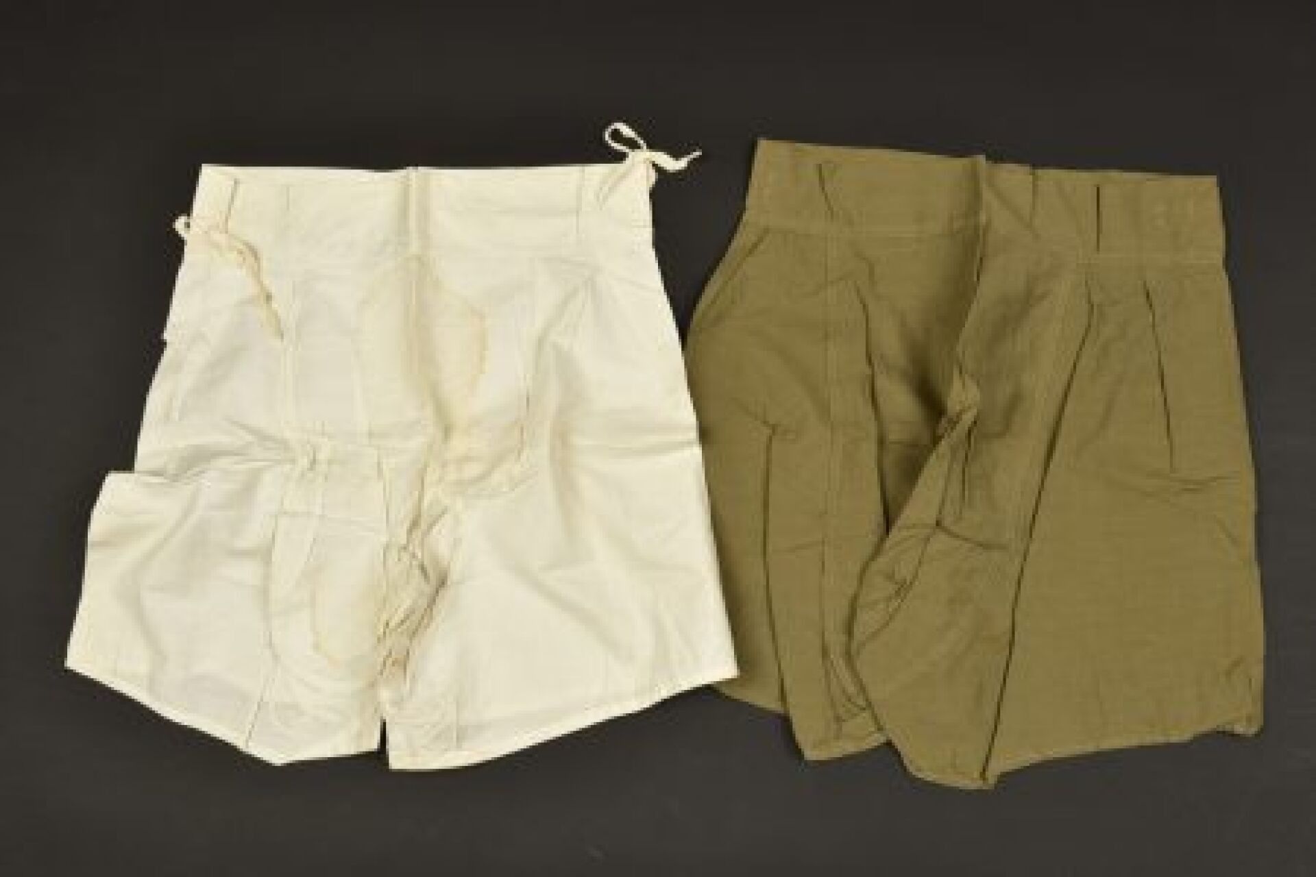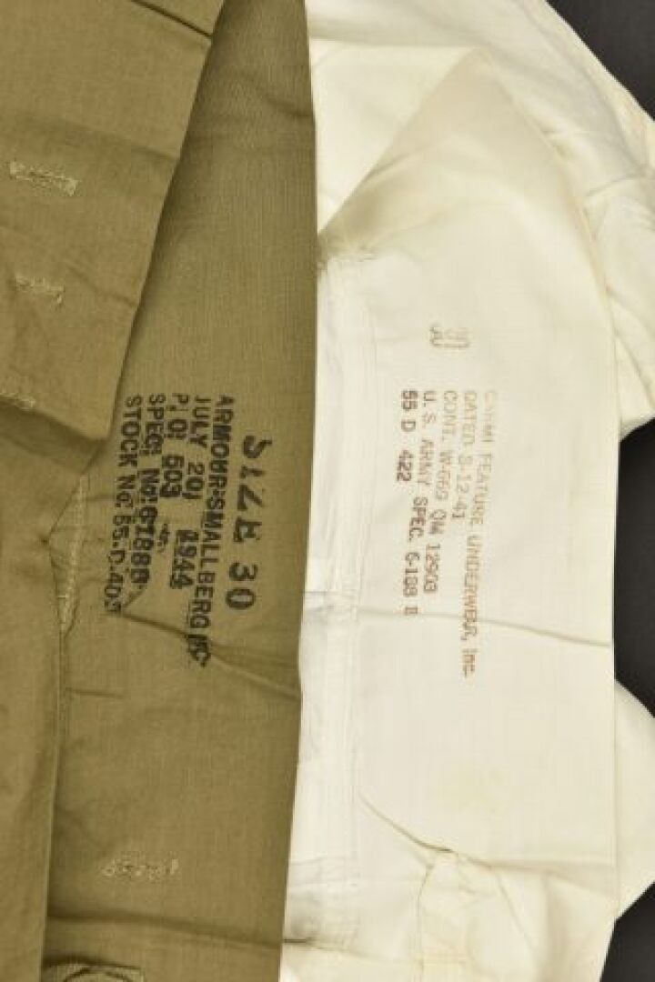 US boxer shorts. Comprising one pair of OD canvas shorts, all buttons and drawstrings present. Manufactured by Armours Smallberg Inc, dated 20 July 1944, size 30. A pair of white cotton cloth boxer shorts, all buttons present and drawstrings. Manufactured by Carmi Feature Underwear Inc, dated 12 December 1941, size 30, some stains present. Some wear and patina to parts, as well as a few stains. Condition II+. 2+