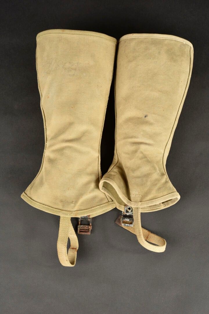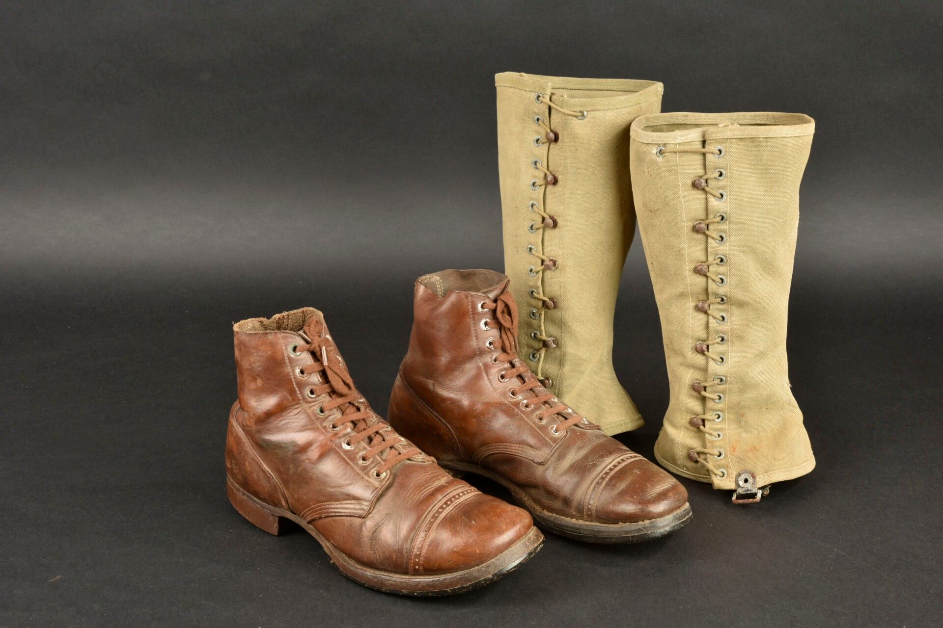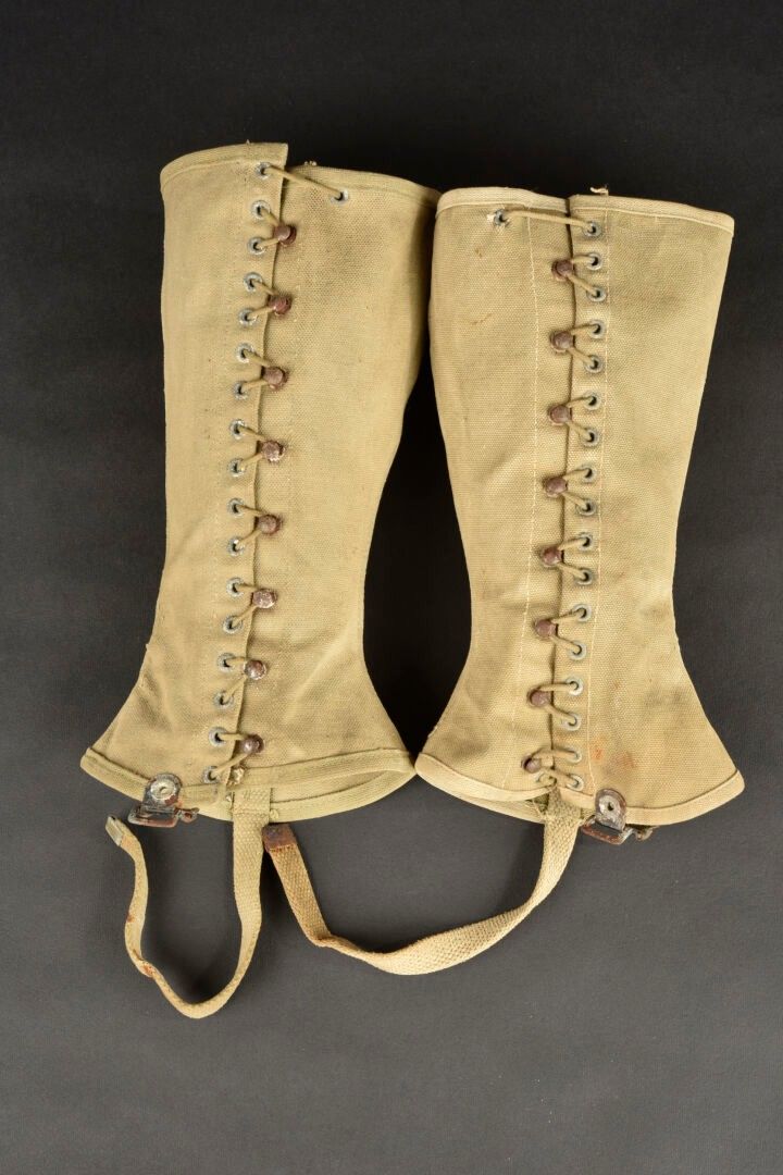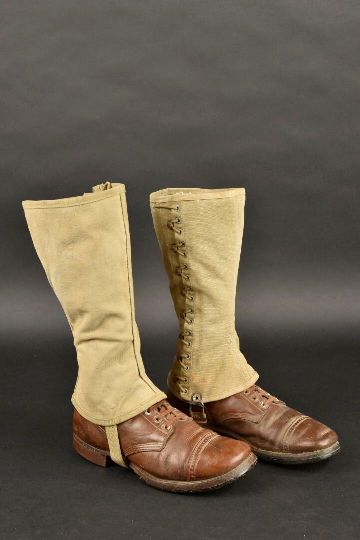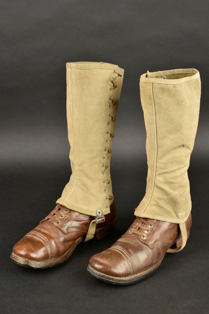 US Brodequins. Homogenous pair in smooth brown leather. Toe caps. Eight lacing eyelets. Laces present. Rubber heels. Leather soles. Markings are illegible. Internal markings are illegible. Attached are a pair of OD heavy canvas gaiters, laces present. All metal parts are oxidised. Markings are illegible. Remainder of manufacturer's markings illegible. Some wear, patina and stains. Condition II+. 2+
