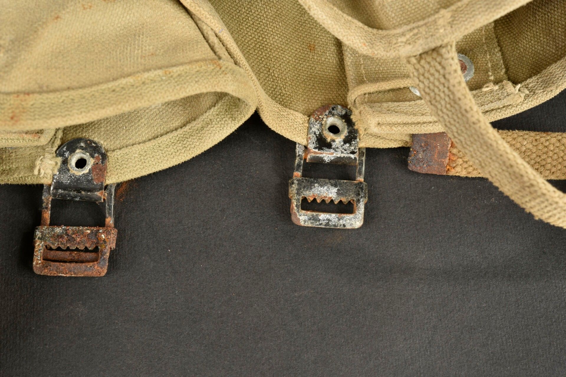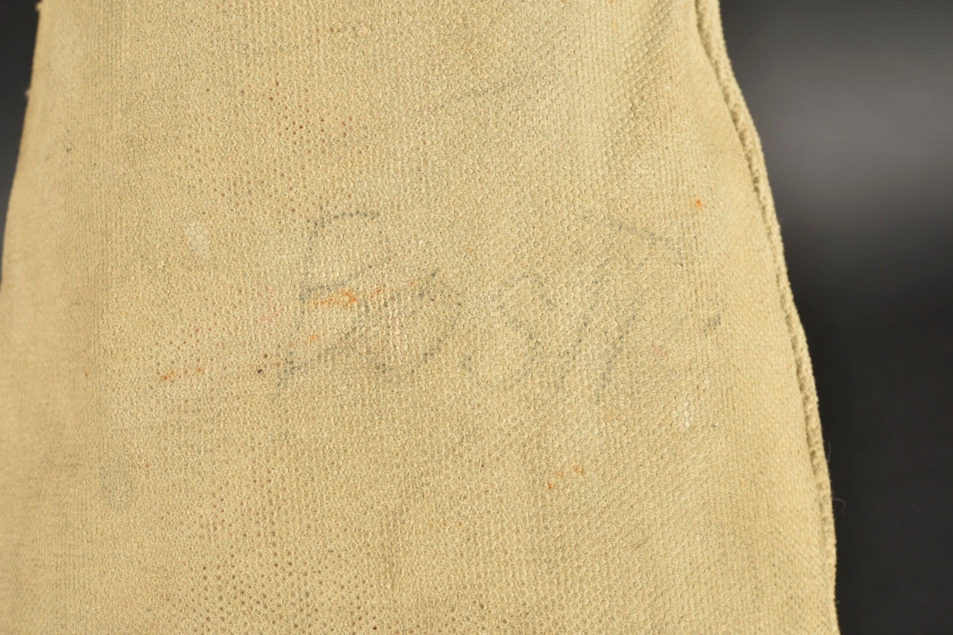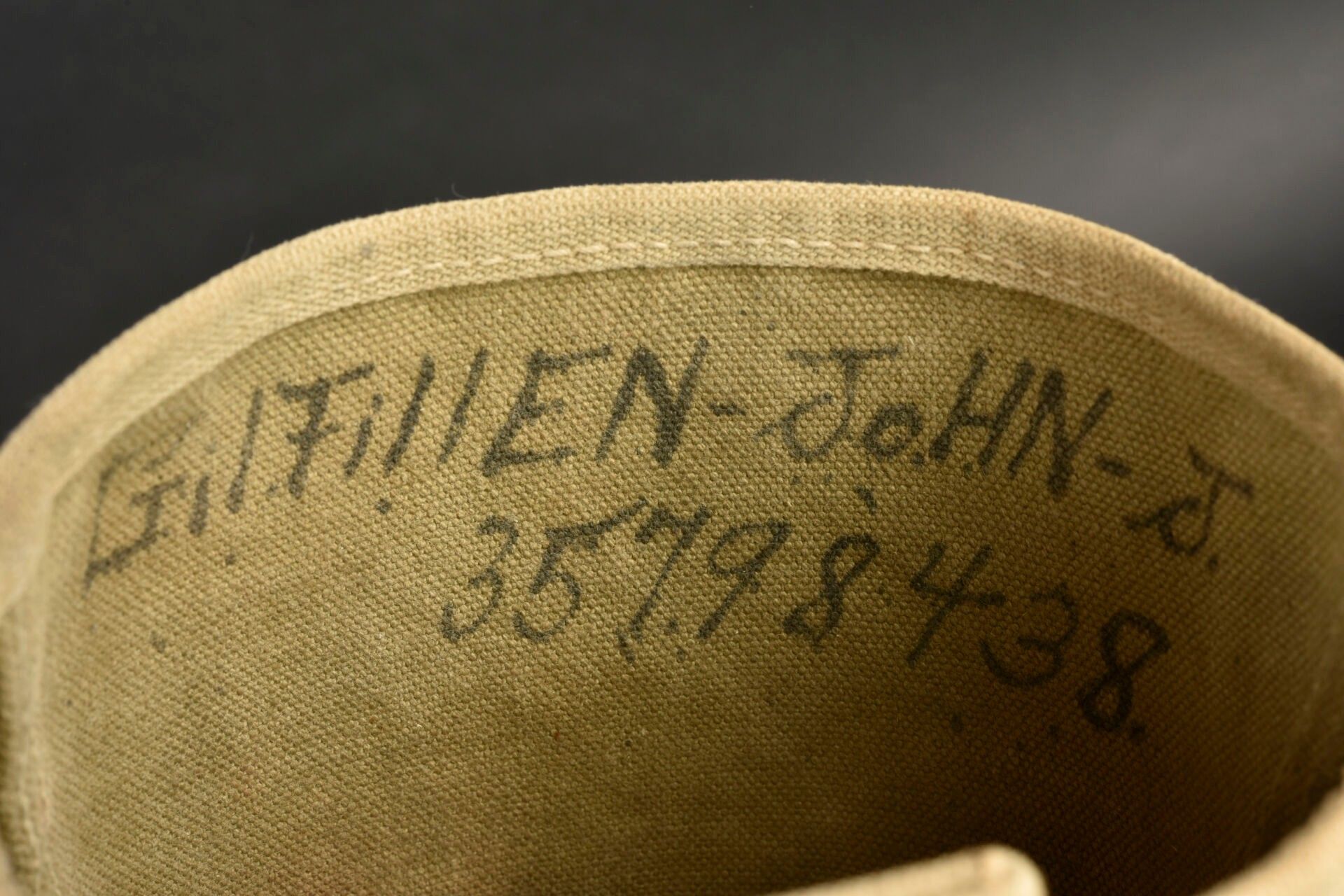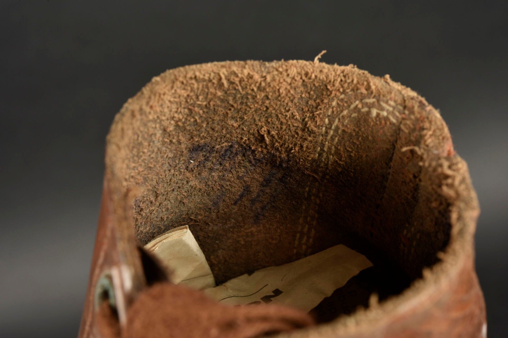 US Brodequins. Homogenous pair in smooth brown leather. Toe caps. Eight lacing eyelets. Laces present. Rubber heels. Leather soles. Markings are illegible. Internal markings are illegible. Attached are a pair of OD heavy canvas gaiters, laces present. All metal parts are oxidised. Markings are illegible. Remainder of manufacturer's markings illegible. Some wear, patina and stains. Condition II+. 2+