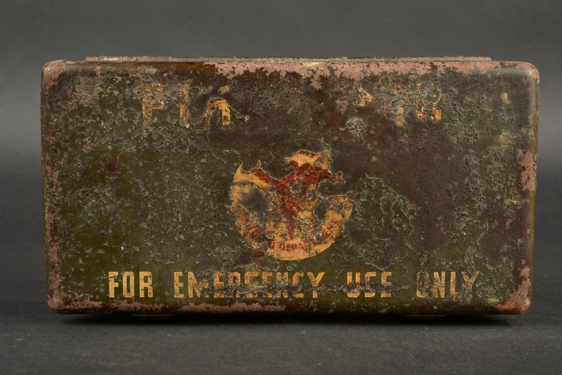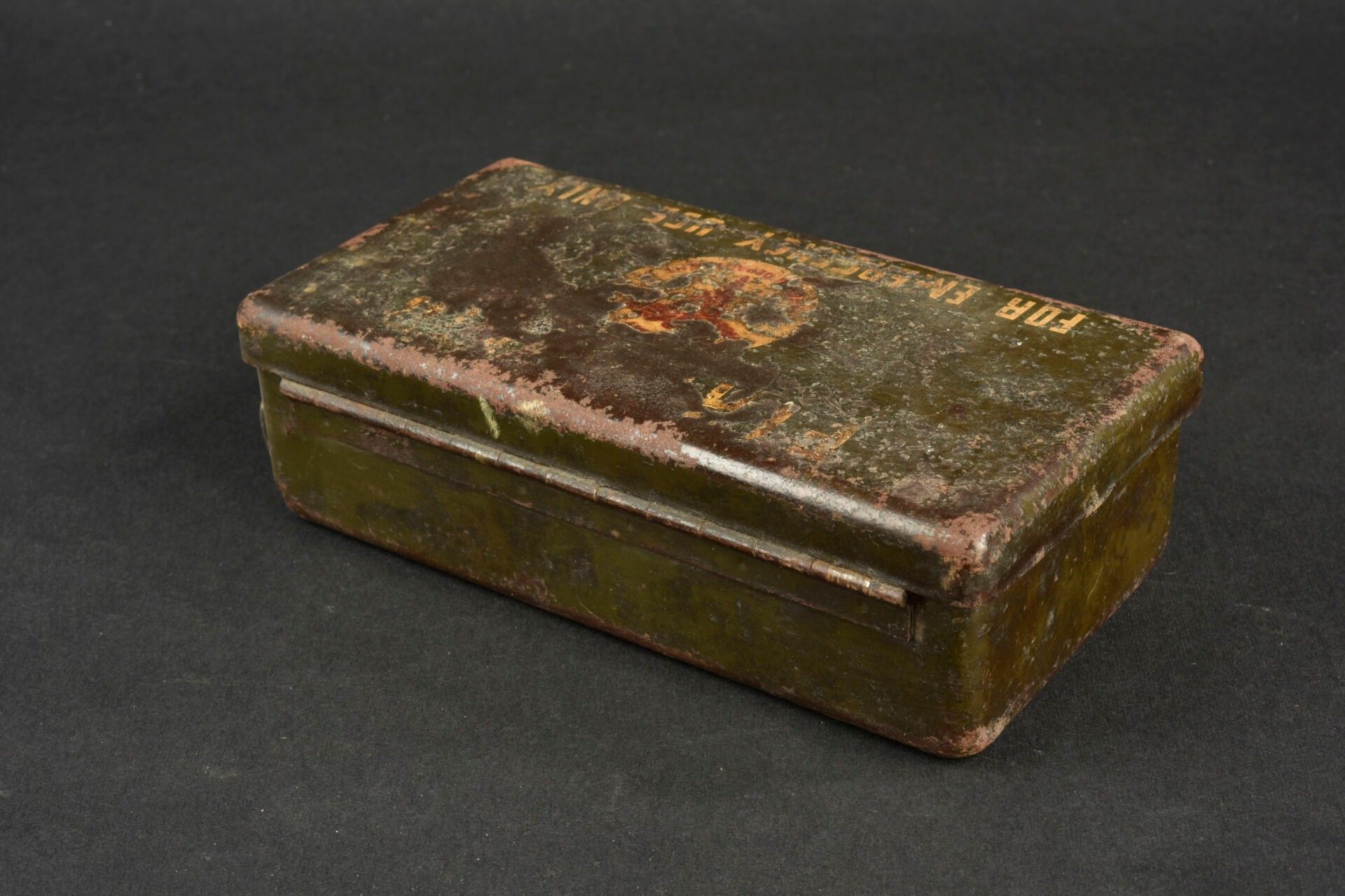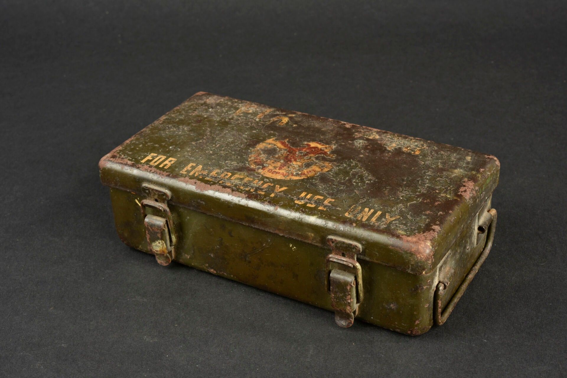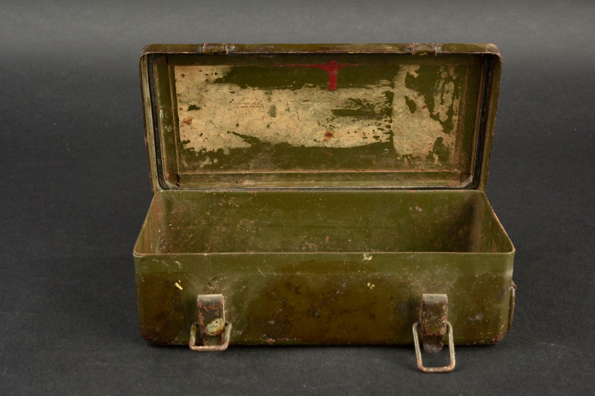 First Aid box. Made of metal. The closing hooks are complete and functional. The carrying handle is present. The markings on the lid are virtually absent. The internal racks and the inventory notice are missing. There is some wear and patina on the piece, as well as marked oxidation on the edges. Condition II+. 2+