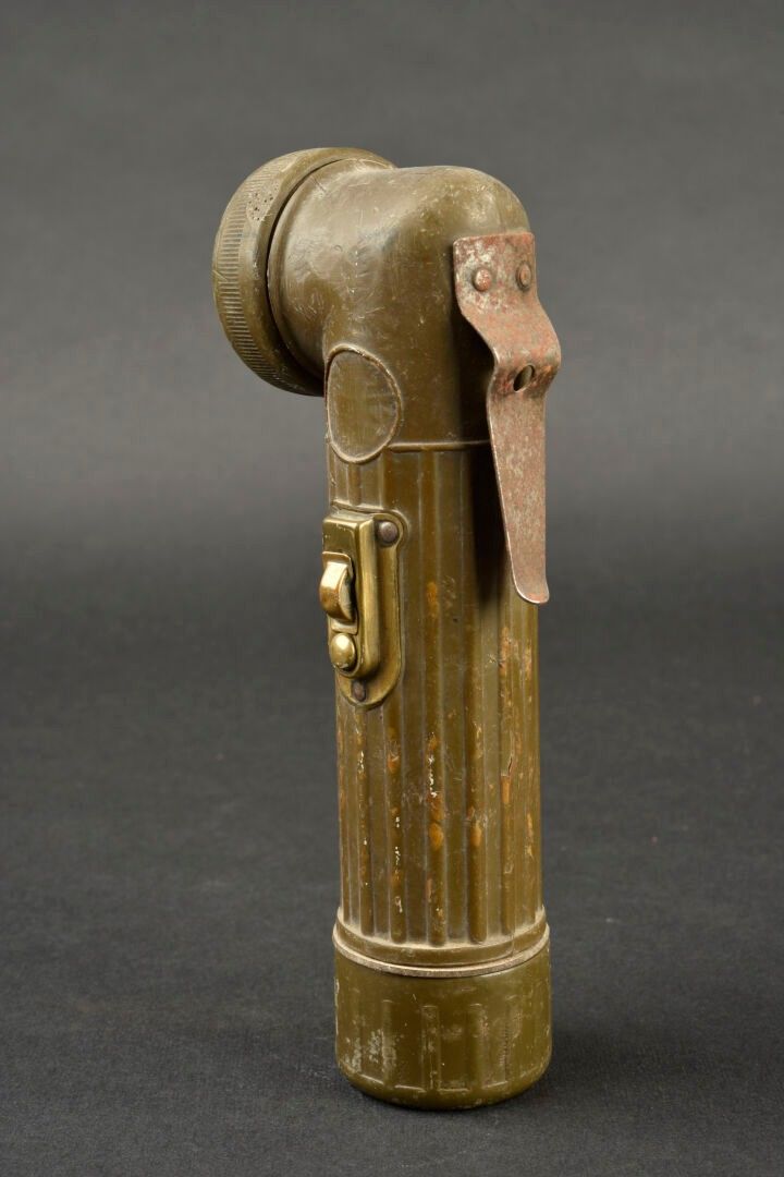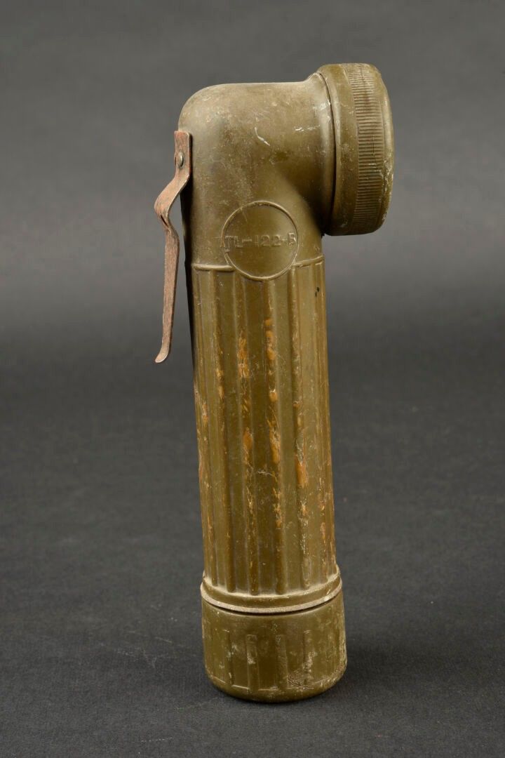 TL 122-B flashlight. In khaki bakelite. The battery compartment is present, as well as the bulb. Glass is complete but has turned yellow with age. Fixing hook is complete. Markings TL-122-B. Some missing edges. All moving parts are functional. Bright Star manufacture. Some wear and patina, as well as stains and scratches. Condition II+. 2+