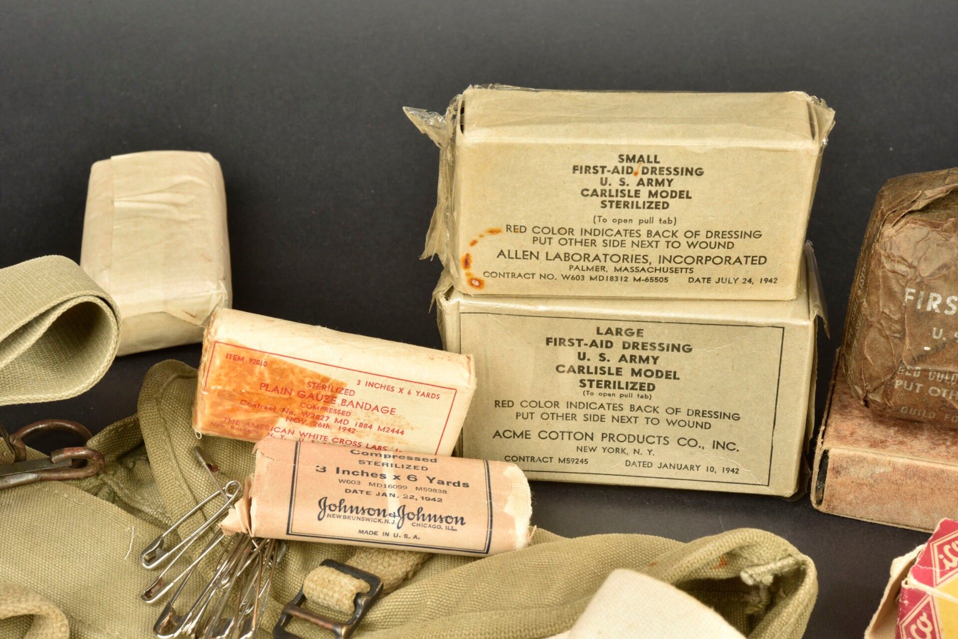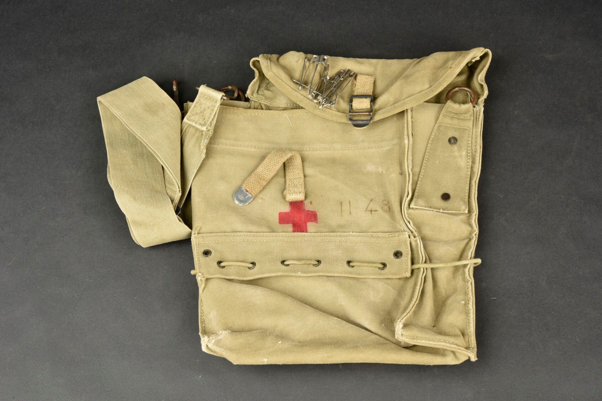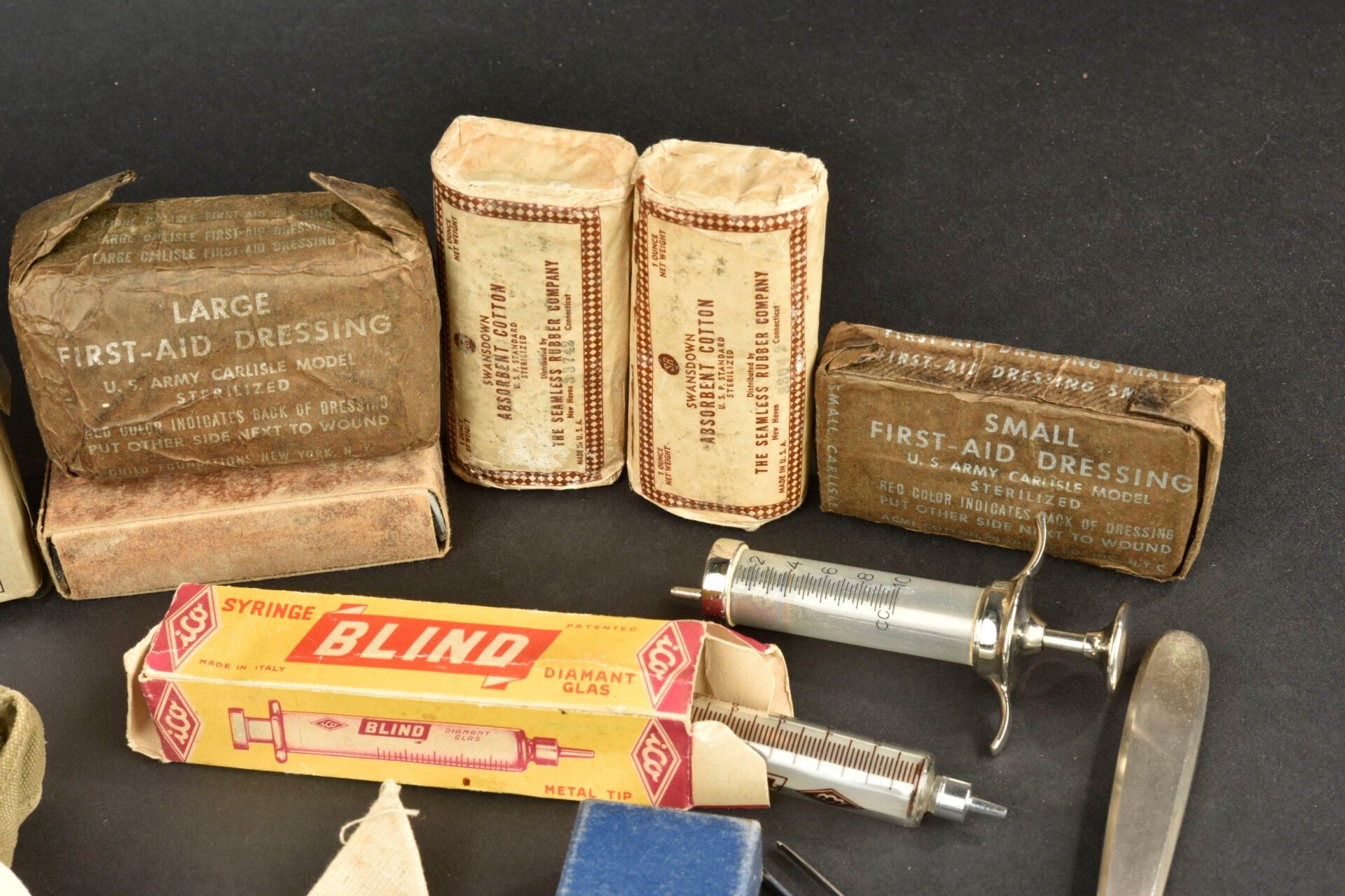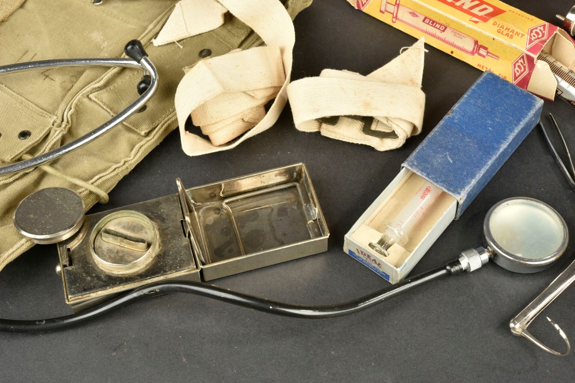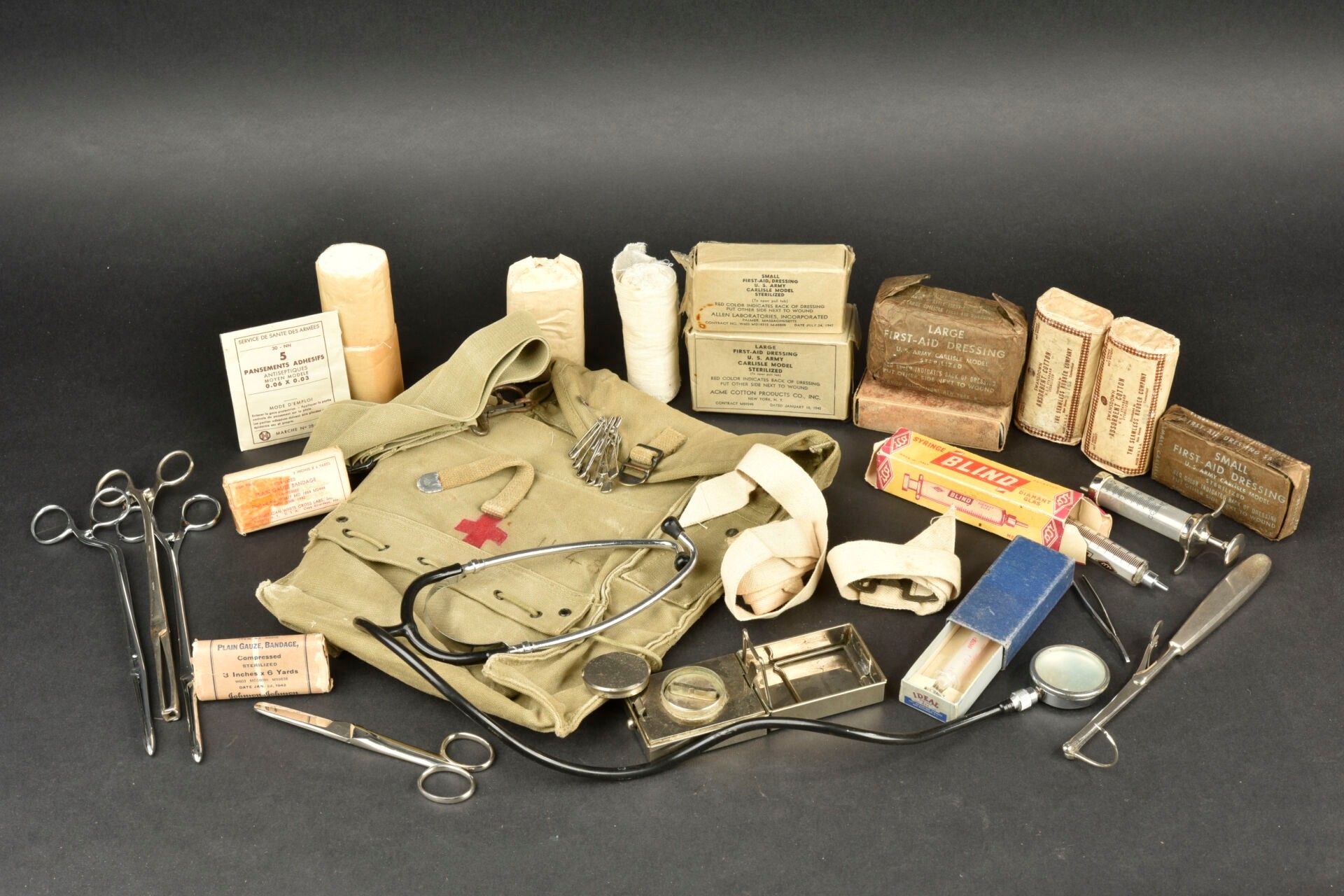 US medical accessories. Comprising an open bandage. A glass and metal syringe. One ideal syringe in original cardboard box. Two Absorbent Cotton bandages. One Plain Gaze Bandage. Two unopened bandages, no visible markings. One Plain Gauze Bandage. One First Aid Small dressing. Some surgical instruments and a stethoscope, all French made. One First Aid Large dressing. One First Aid Small dressing. Two US tourniquets. An individual dressing in its original cardboard box. One metal and glass syringe. Sterilisation box for needles. One Large First Aid dressing. A US medical bag, in strong OD canvas, French reuse. Some wear and patina to be noted. Condition II+. 2+
