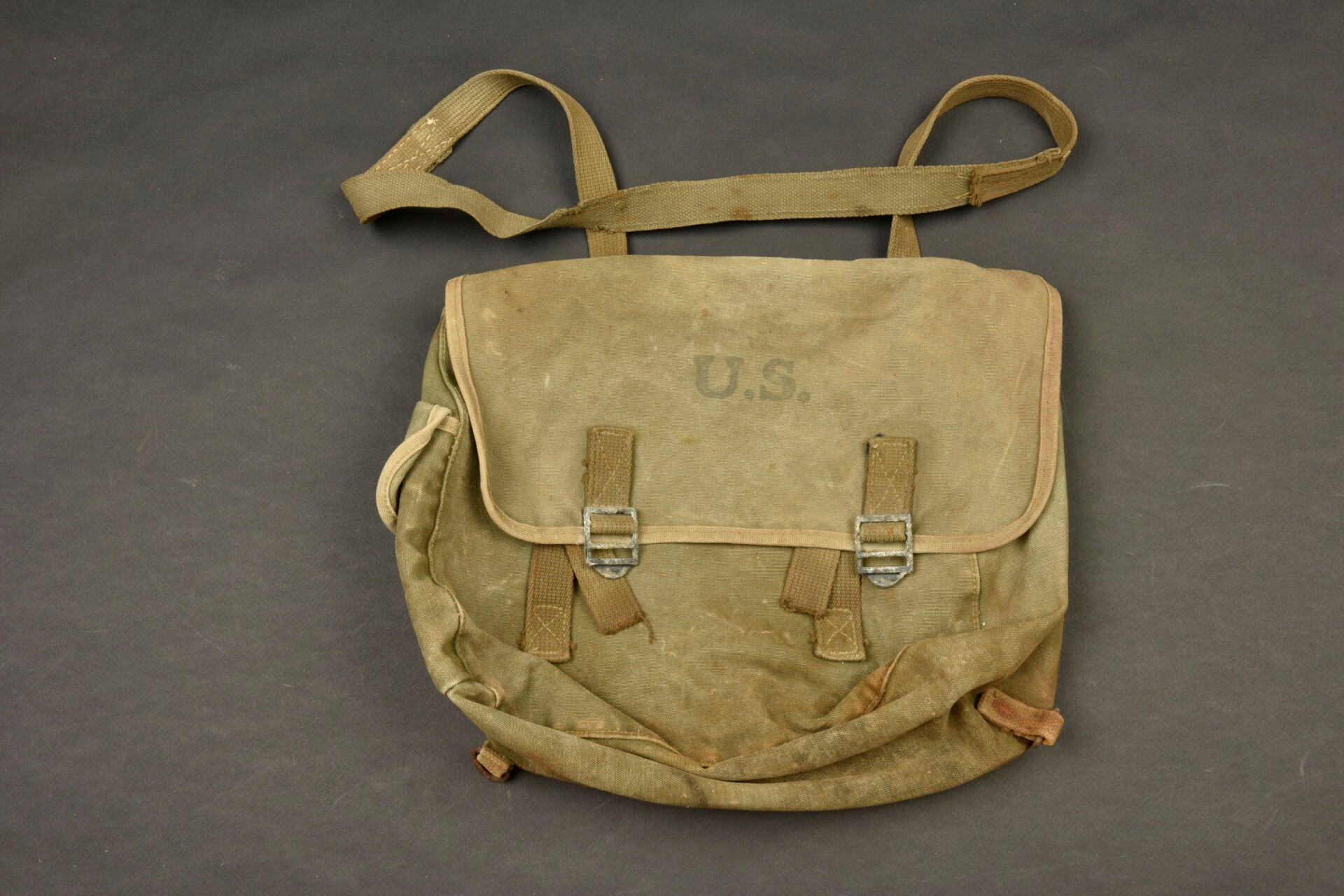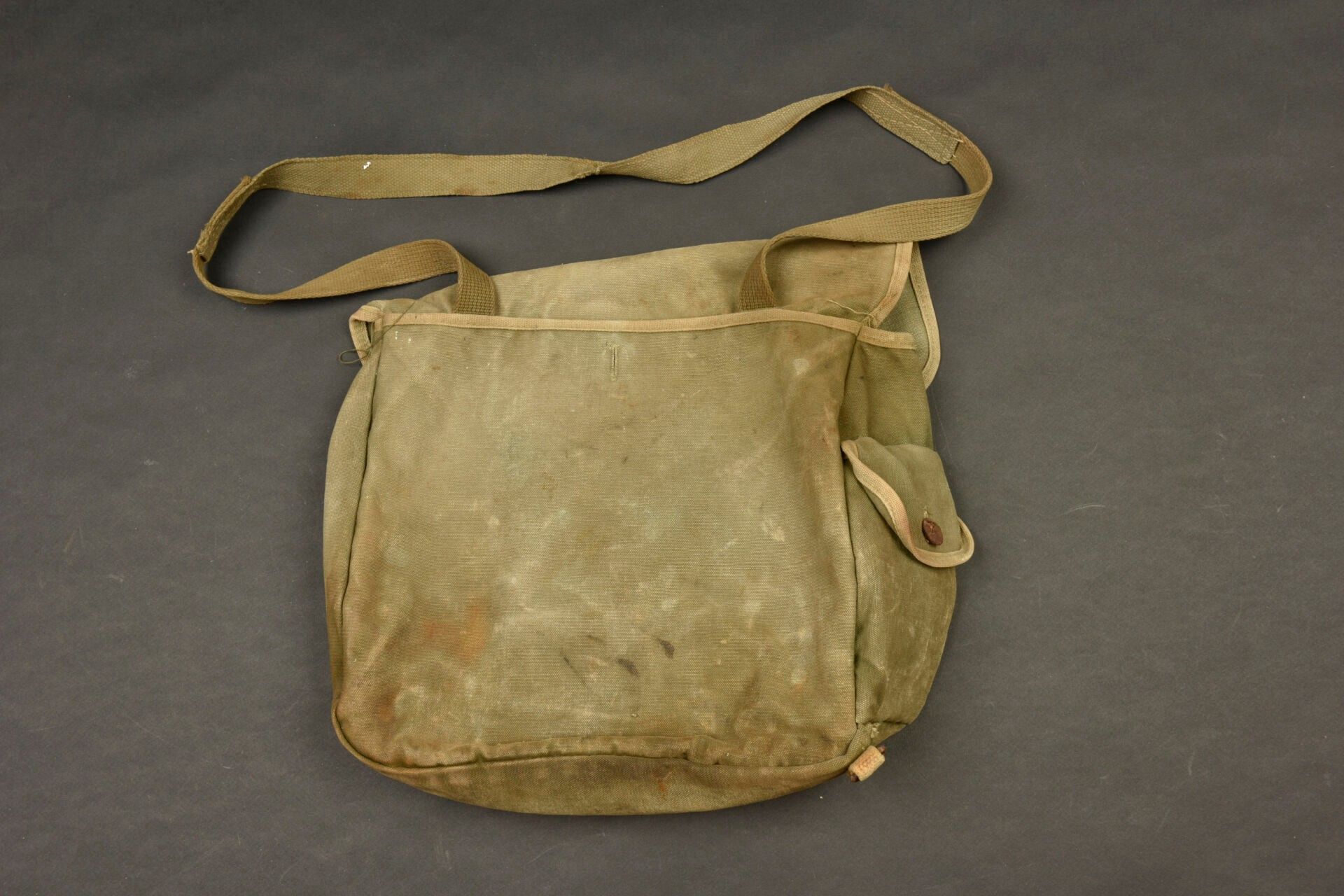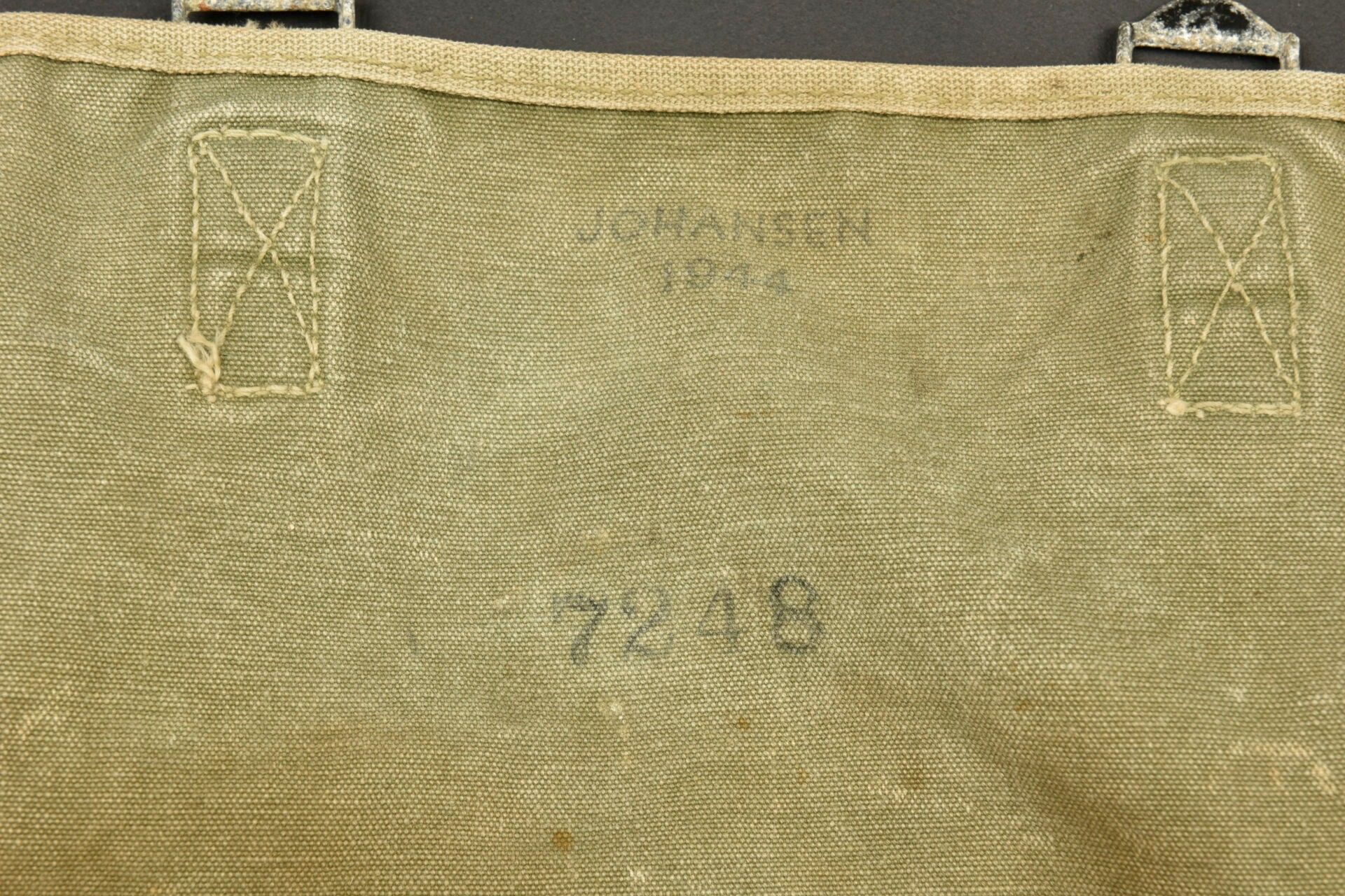 US M-36 musette bag. Heavy OD canvas. All straps are present. The carrying strap has been modified by sewing a strap directly to the back of the bag. Nice US marking on the flap. The closing straps are incomplete. Made by J Chansen 1944. Laundry number 7248. The metal parts are oxidised. Some wear and patina, as well as a few stains. Condition II+. 2+