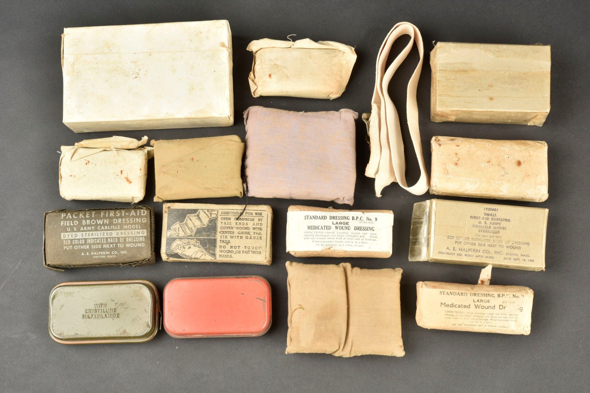 Set of US bandages. Comprising one bandage in khaki metal box, made by Bauer & Black Div of the Kendall co Chicago. A complete British dressing, never opened, made by Arthur Berton Ltd London, dated February 1942. A British Stardard Dressing N15, dated 1943, never opened. An unopened British dressing, made by Arthur Berton Ltd London, 1941. An unopened Standard Dressing BCP NO9, dated April 1944. A bandage in its original box, marked Bandage Gauze Compress, AE Halperin Co Inc Boston Mass. One unopened bandage, Standard Dressing BPC N0 9, dated April 1944. An unopened bandage in original packaging, Large First Aid Dressing, Acme Cotton Products Co Inc, dated January 1942. An unopened dressing, marked Absorbent cotton. One unopened dressing, marked Packet First AId Field Brown Dressing, AE Halpering Co Inc. One unopened dressing, marked Small First AId Dressing, AE Halperin CO Inc, dated 18 September 1942. An unopened dressing marked Large First Aid Dressing, The American White Cross Laboratories Inc, dated 1940. A French individual dressing, unopened, dated 1939. A British First Field Dressing, dated 1942. A bandage in an orange metal box, never opened, made by Bauer & Black Div Of The Kendall Co Chicago. A complete tourniquet. Some wear and patina. Condition II+. 2+