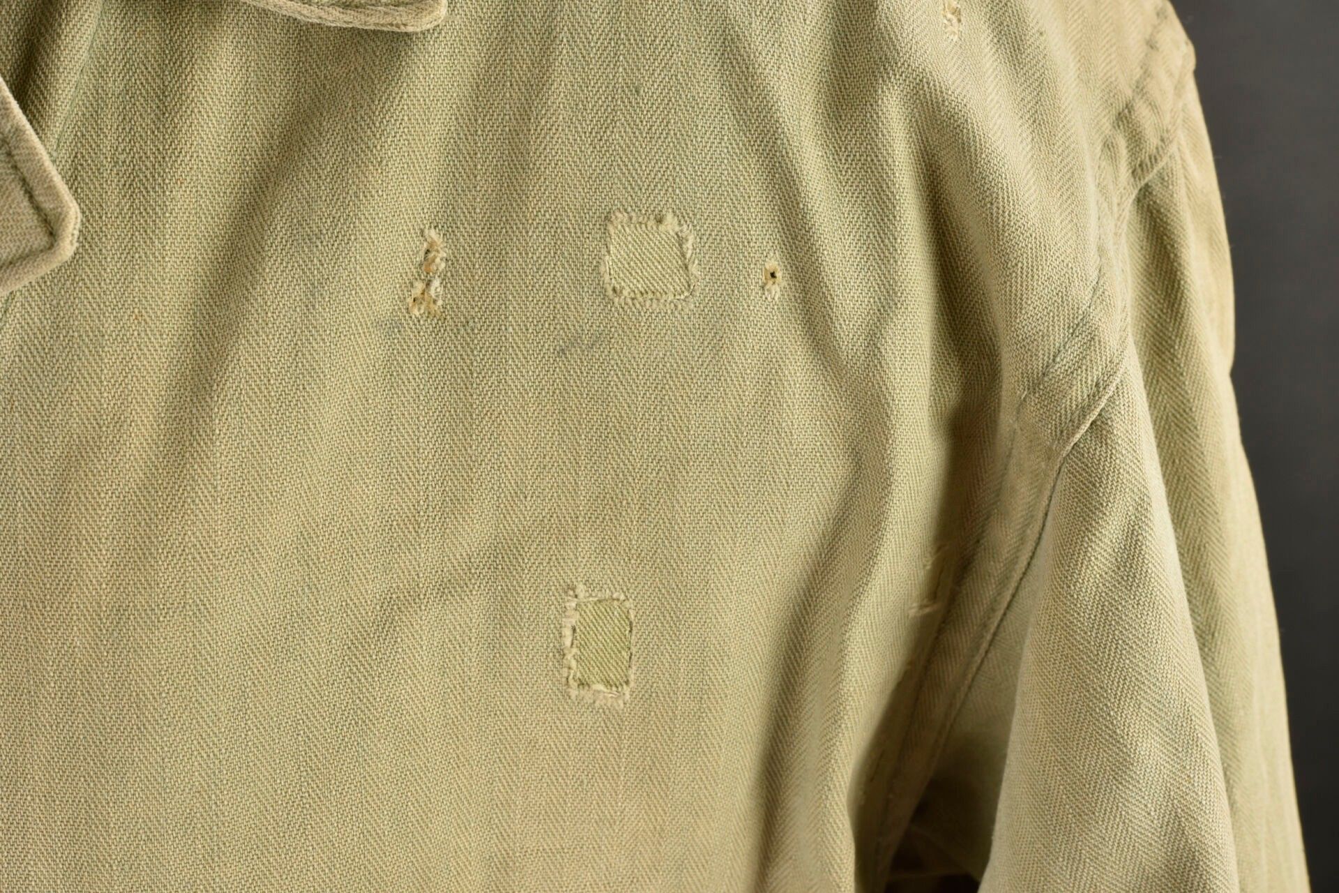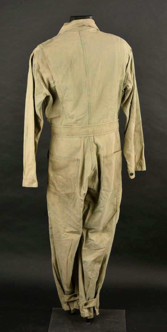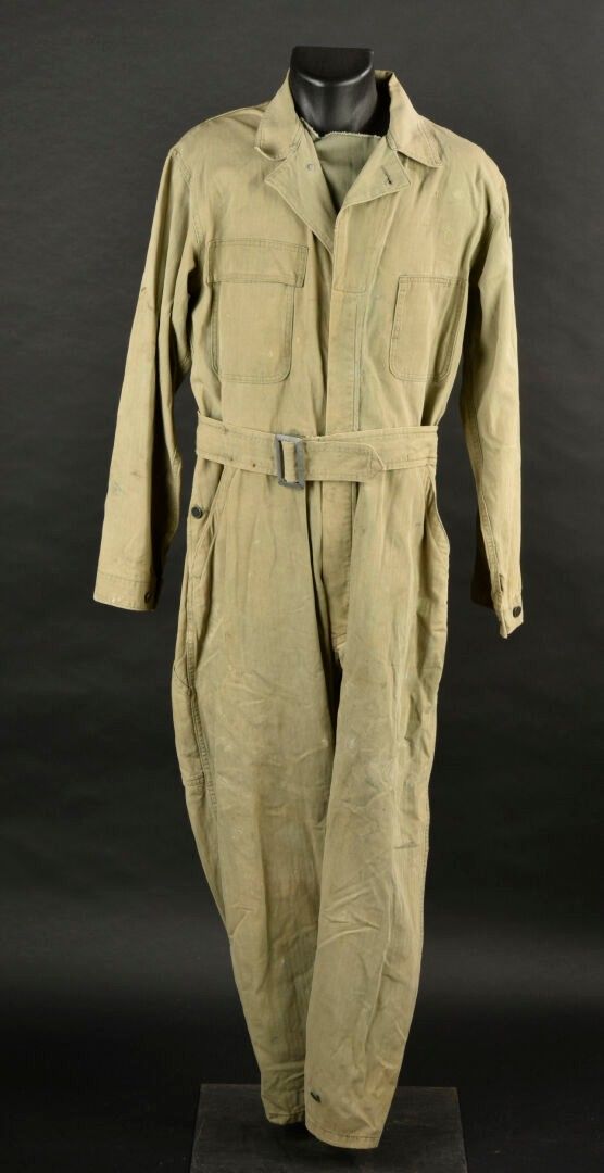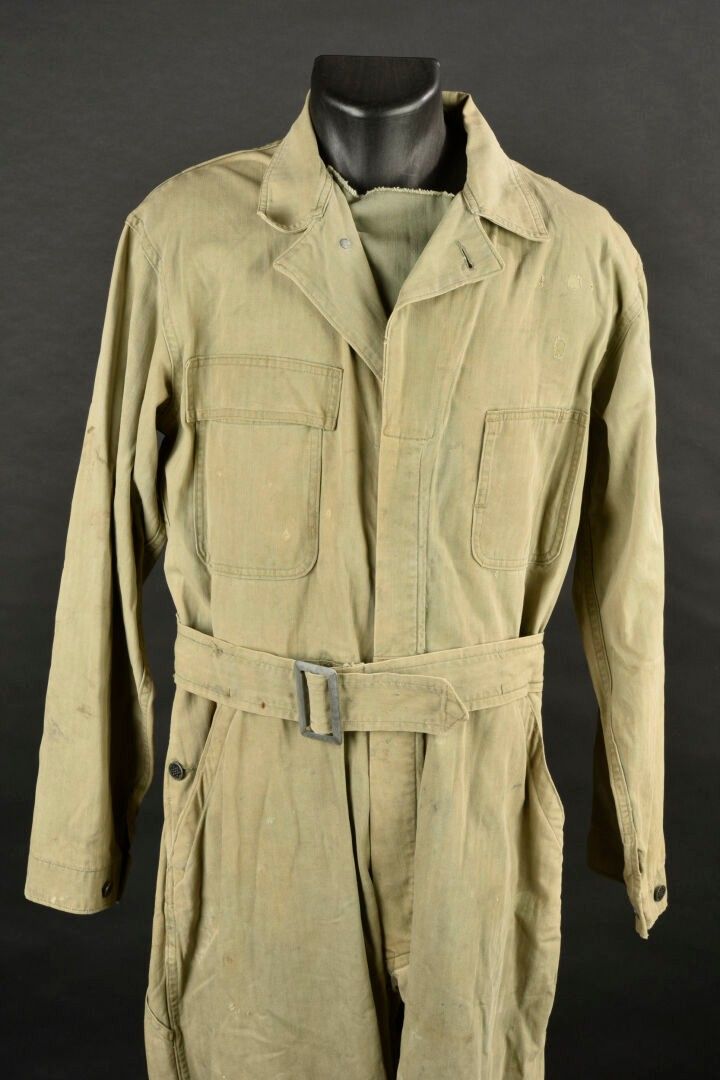 HBT coverall. OD 3 HBT cotton fabric. All buttons present. Colours are sun faded. The gas flap is a different colour to the rest of the uniform. The belt is present. Manufacturer's label is missing. Some wear and patina, as well as stains, dents and repairs. Condition II-. 2-