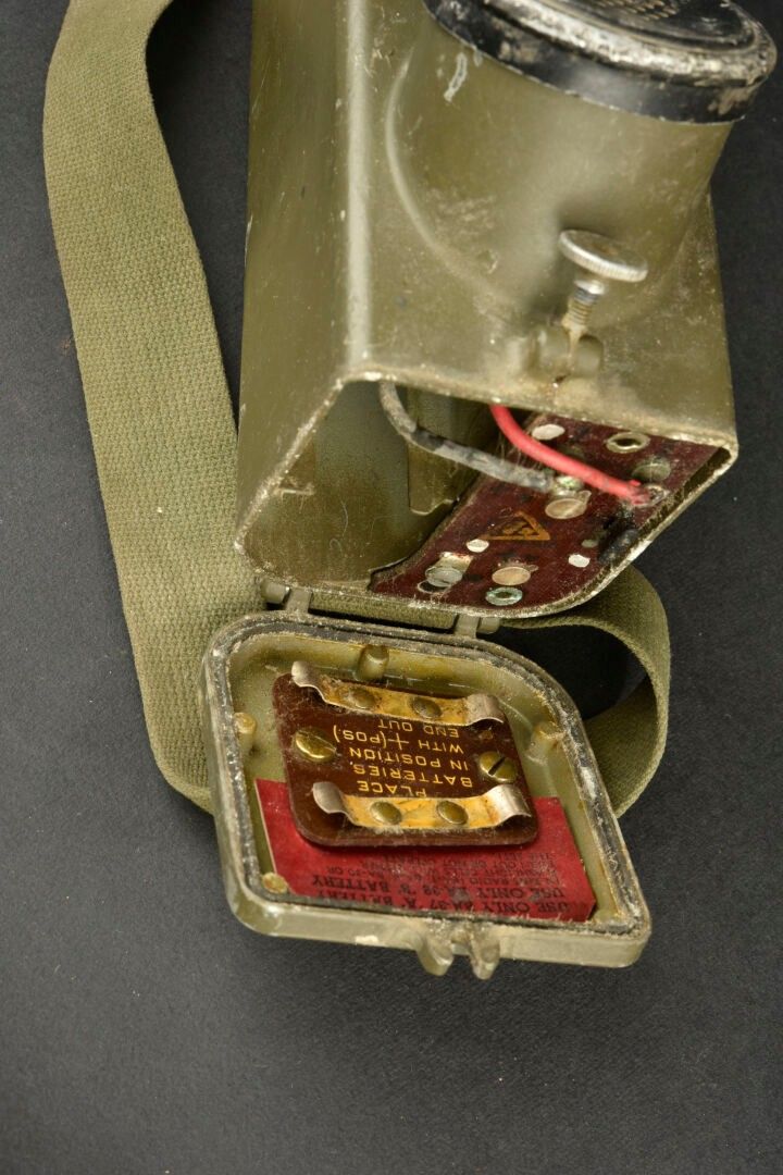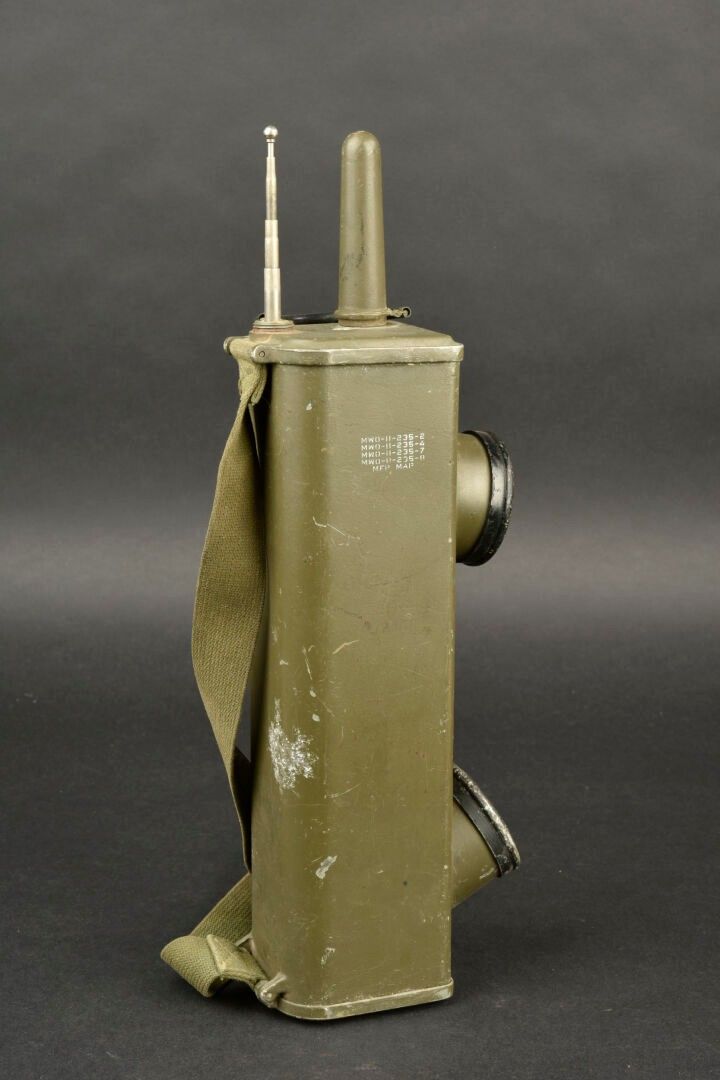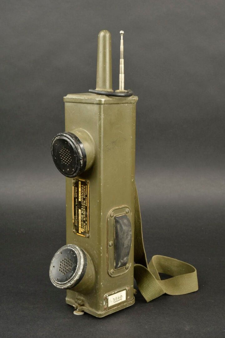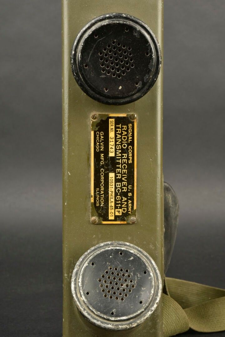 Radio receiver BC-611-F. In metal. Smooth khaki colour (80%). Complete telescopic antenna. All moving parts are functional. Batteries missing. Plaque marked Signal Corps US Army Radio Receiver and Transmitter BC-611-F. Dated 1945. Carrying strap present. Made by Galvin MFG Corporation Chicago Illinois. Some wear and patina. Condition II+. 2+
