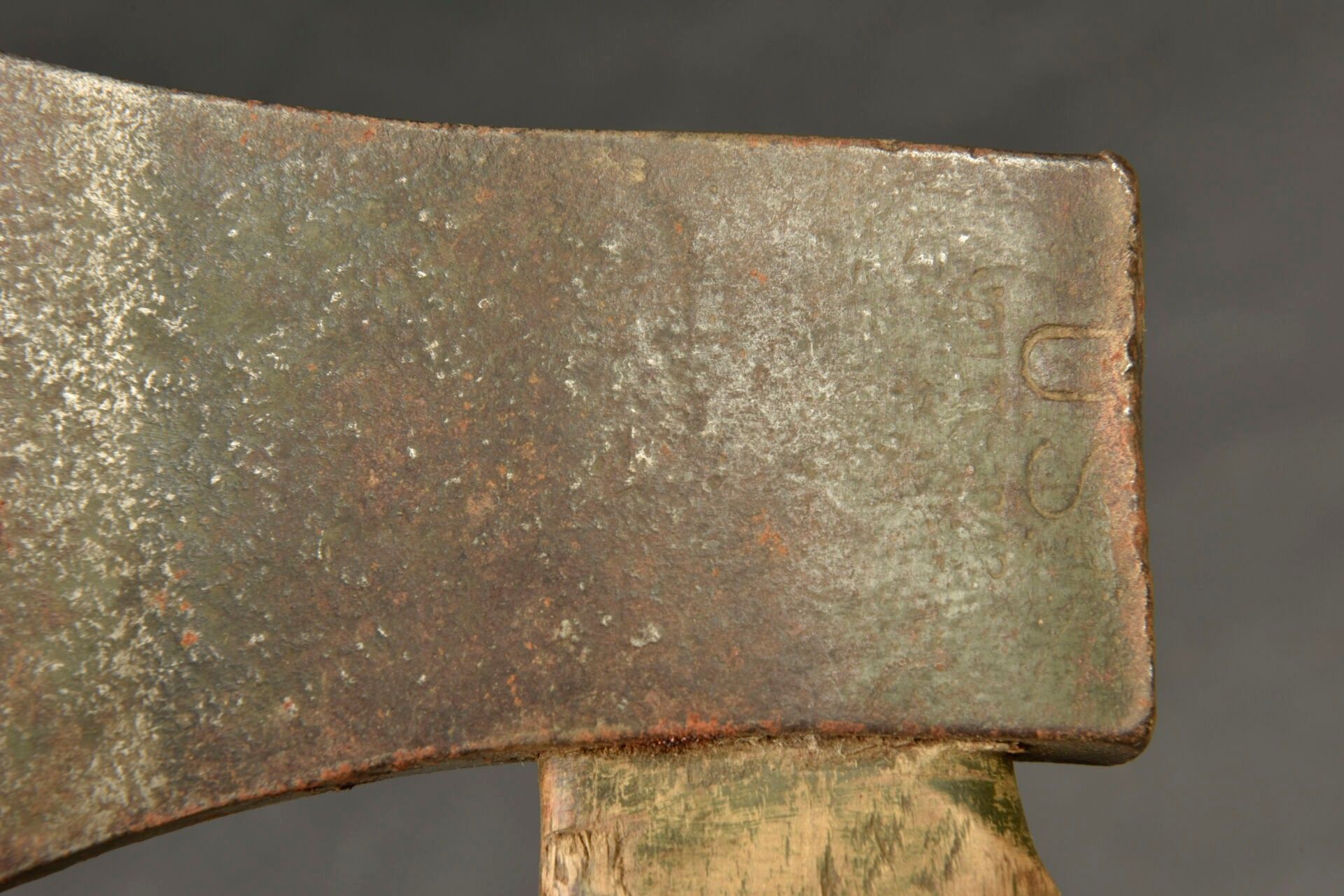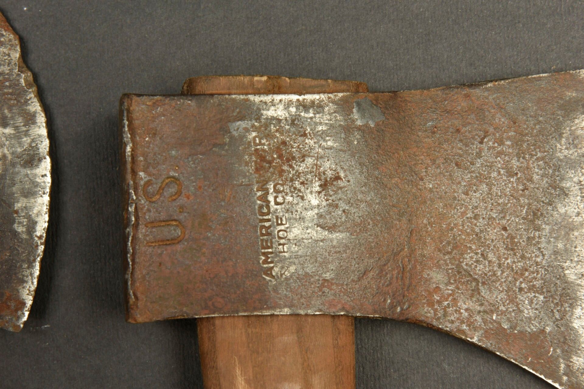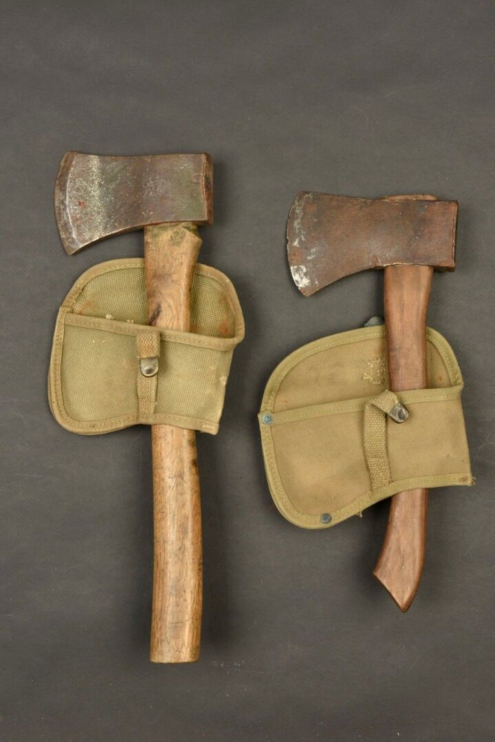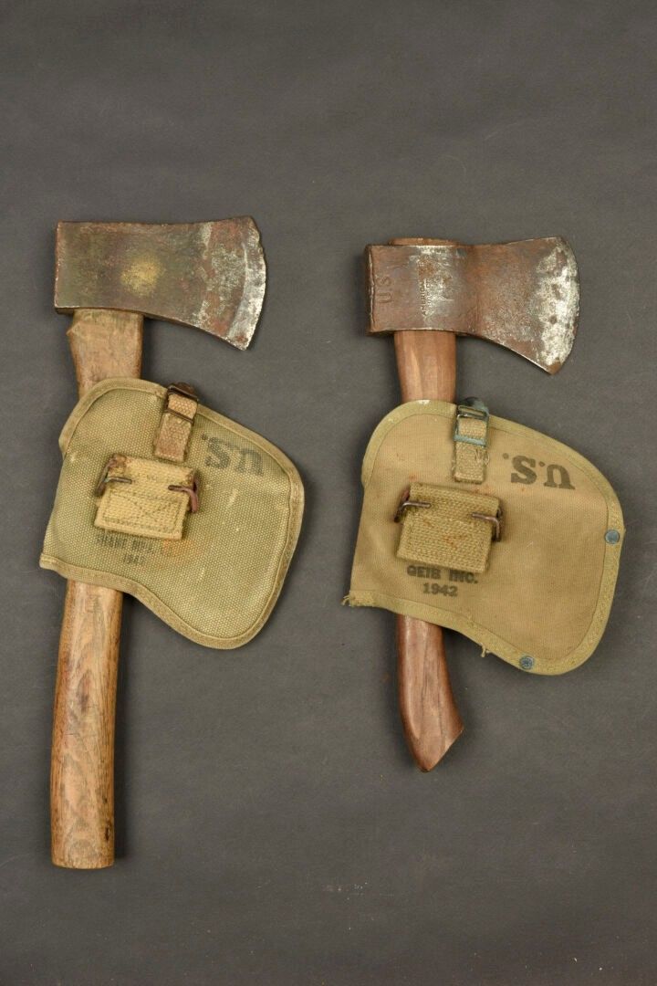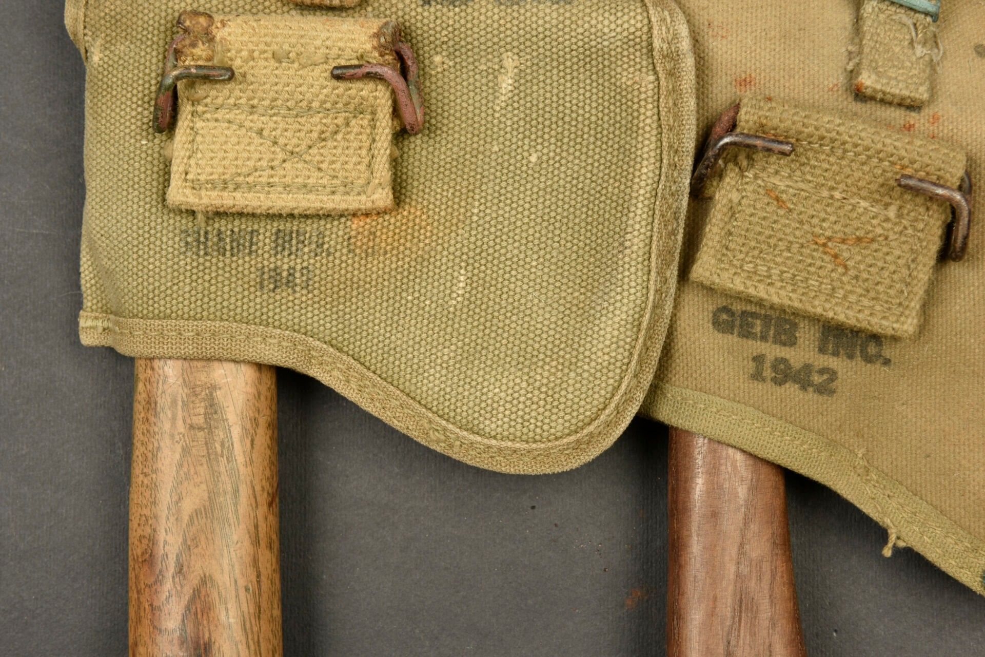 US hatchets. Two individual hatchets. Wooden handles without paint. One handle is a later handmade model. The metal parts are oxidised, and the blade wires have snags. US American Hoe Co and US 1942 markings. OD 3 heavy canvas cover. The belt hooks are present. Fine US markings. Made by Geib Inc 1942 and Shane 1942 or 1943. Some wear, patina and stains. Condition II+. For adults only.