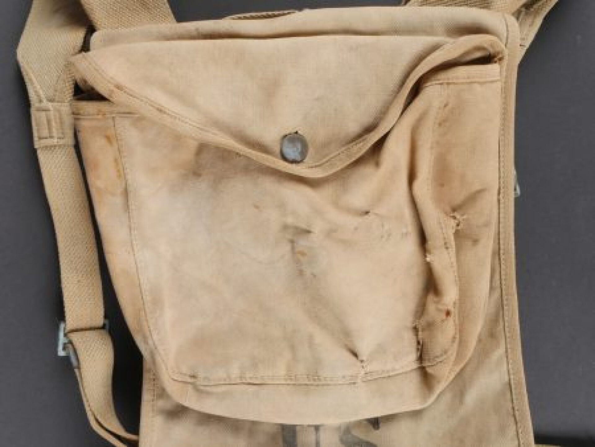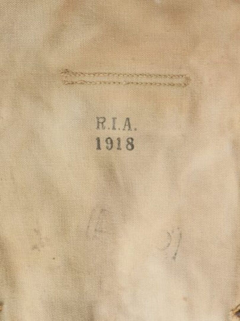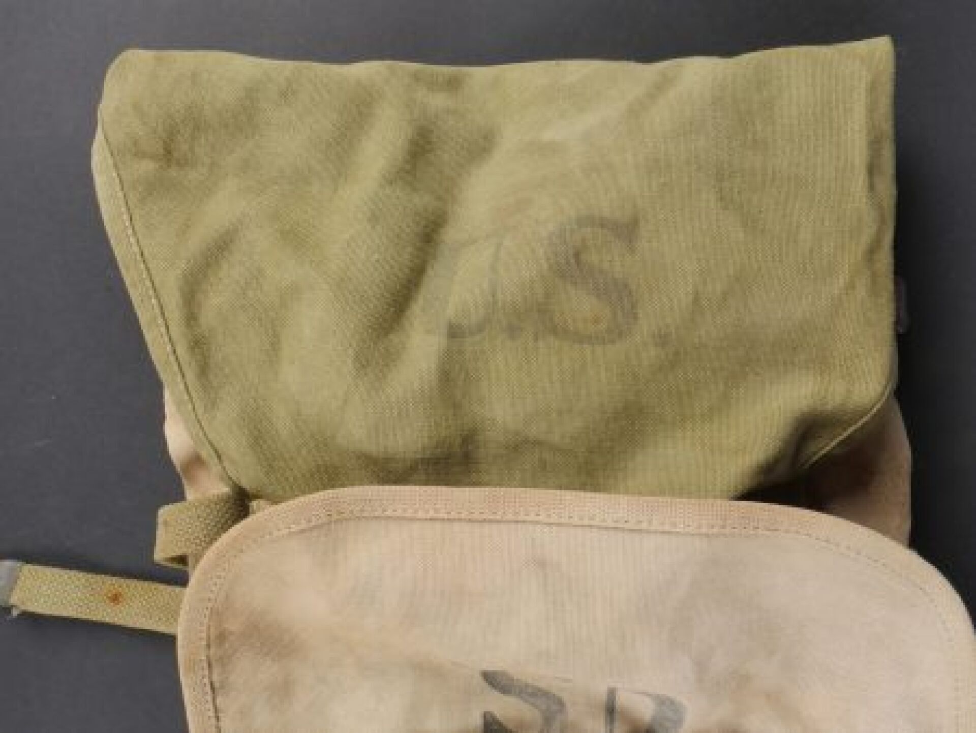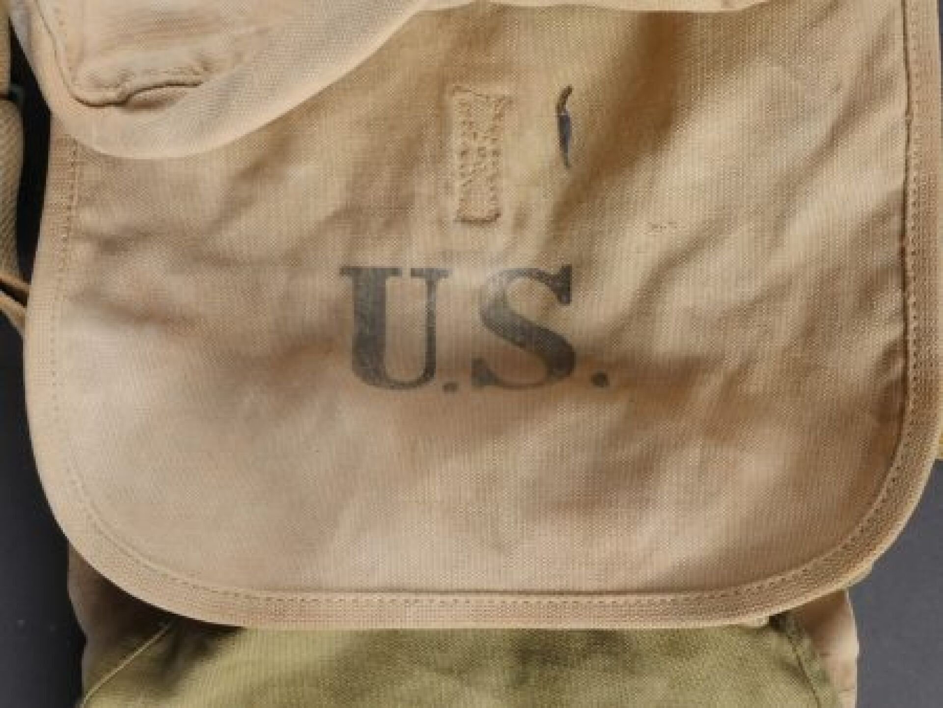 US M-1910 rucksack. Heavy OD canvas, nice US marking on the flap. The triangle is a WWII model, with its leather strap. All straps are present. RIA 1918 manufacture. Canteen pouch complete with button closure. Some wear, patina and stains. Condition II+. 2+