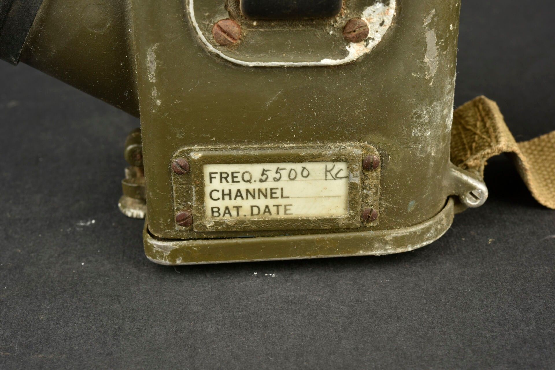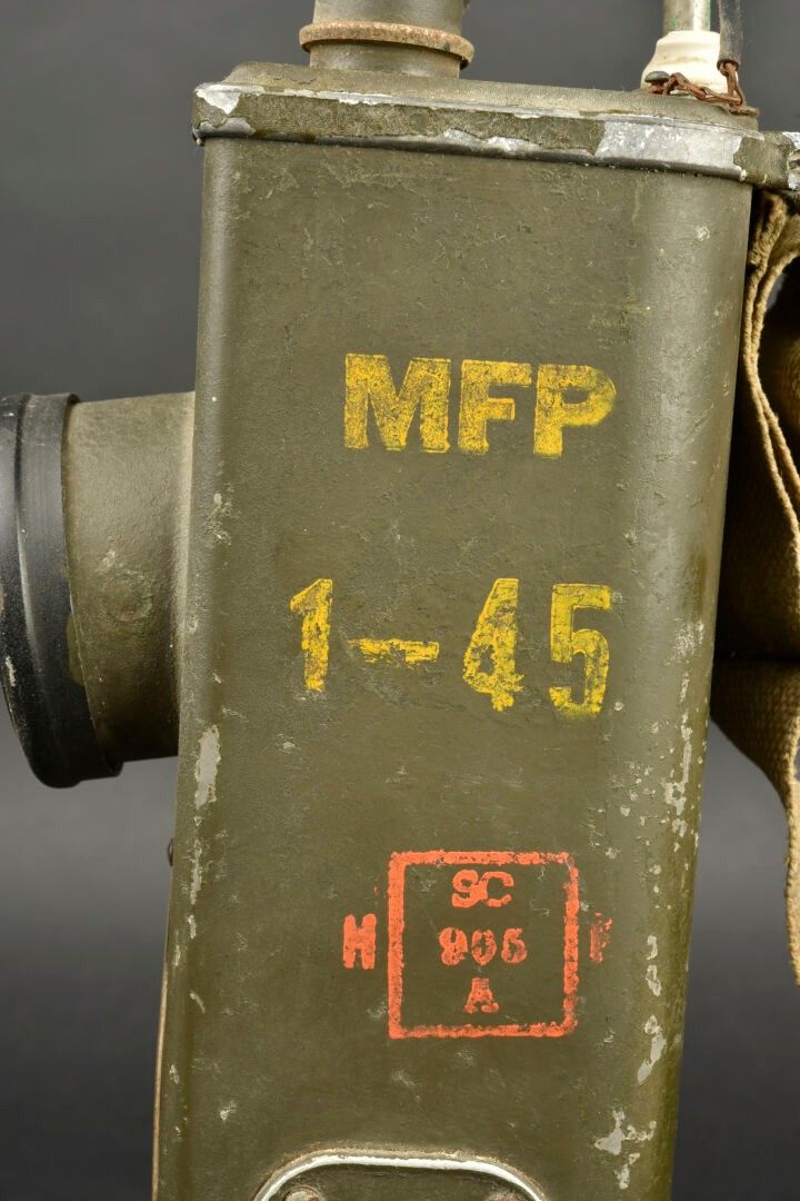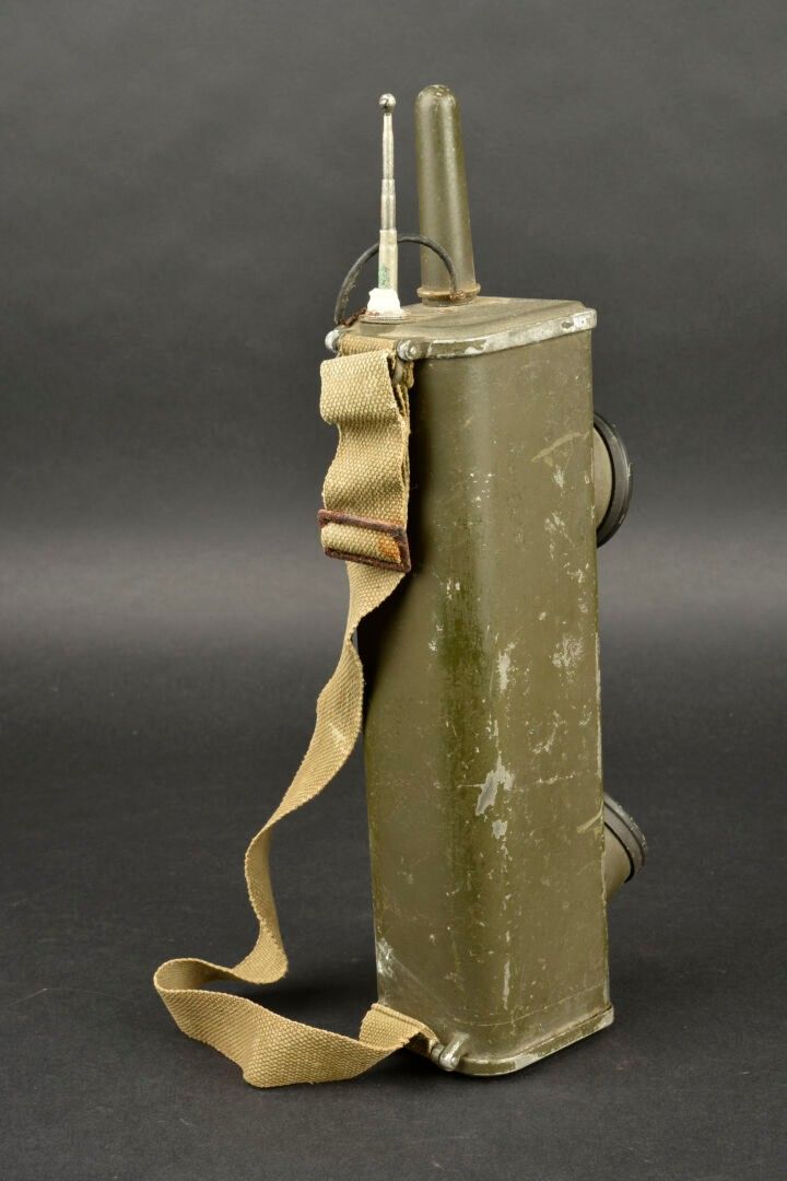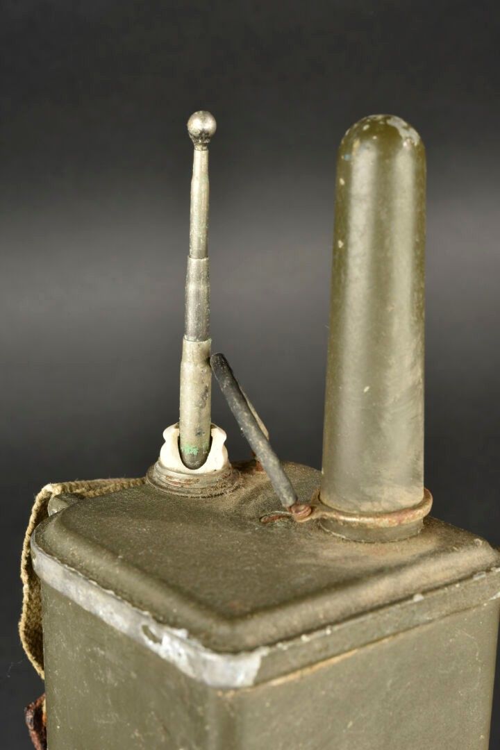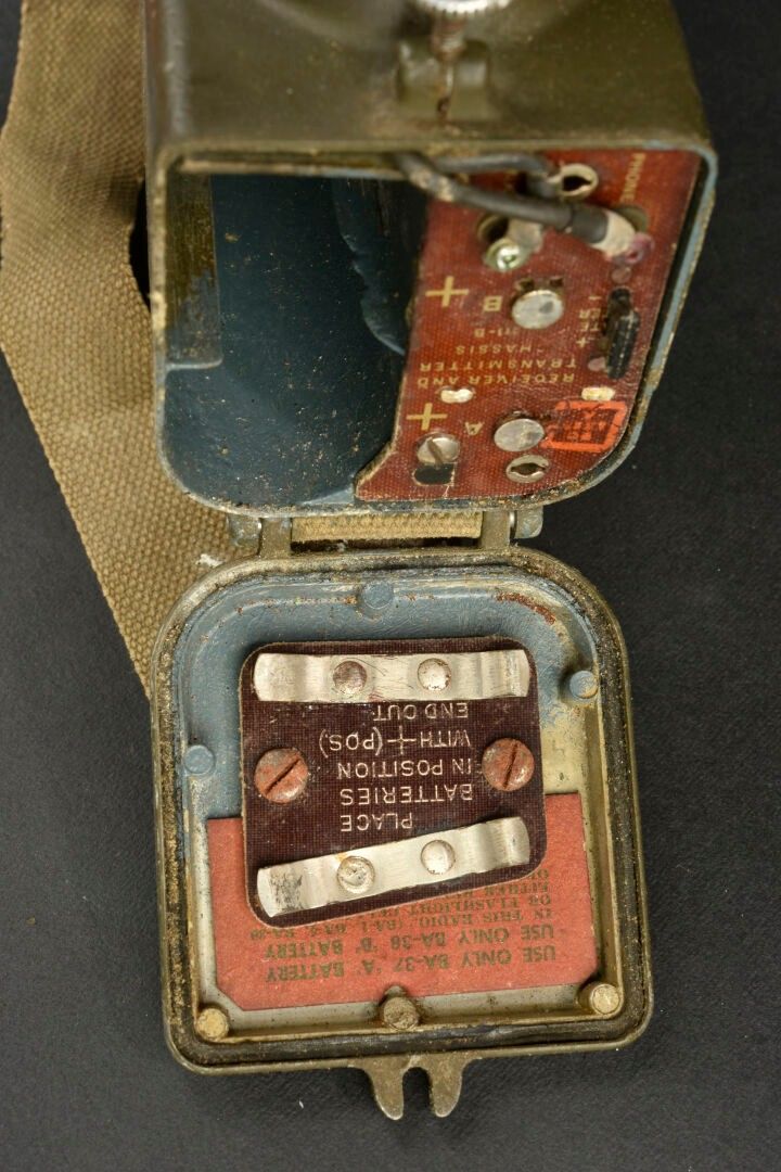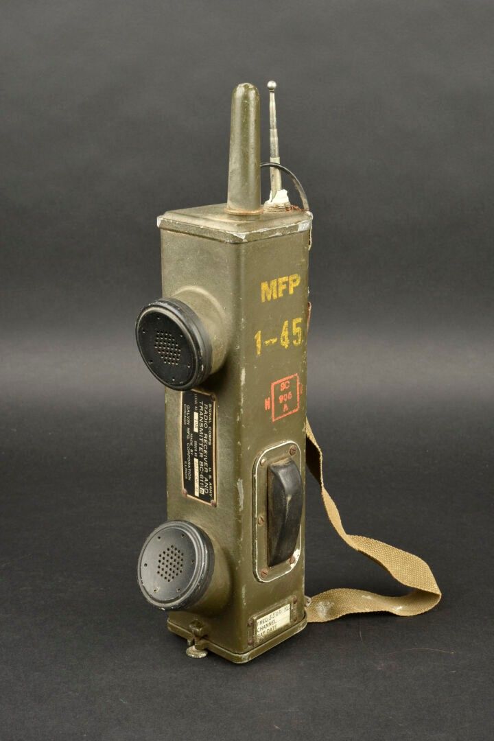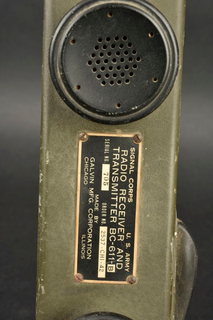 Radio receiver BC-611-B. Made of metal. Smooth khaki colour (80%). Complete telescopic antenna. All moving parts are functional. Batteries missing. Plaque marked Signal Corps US Army Radio Receiver and Transmitter BC-611-B. Dated 1942. Carrying strap present. Manufactured by Galvin MFG Corporation Chicago Illinois. Side markings MFP 1-45. Some wear and patina. Condition II+. 2+