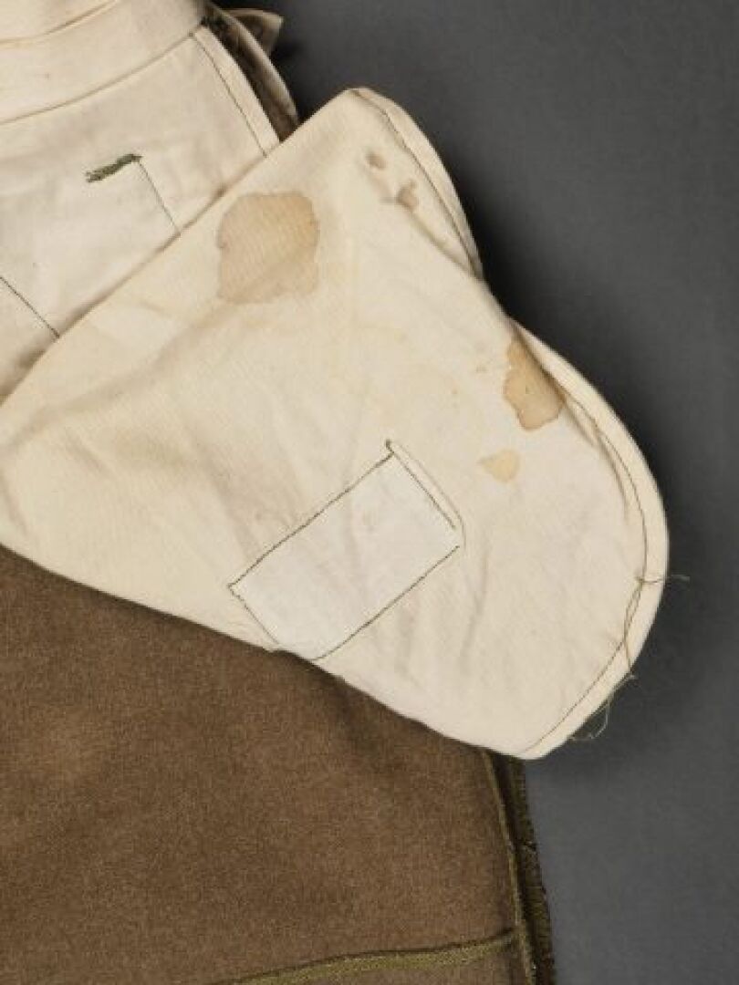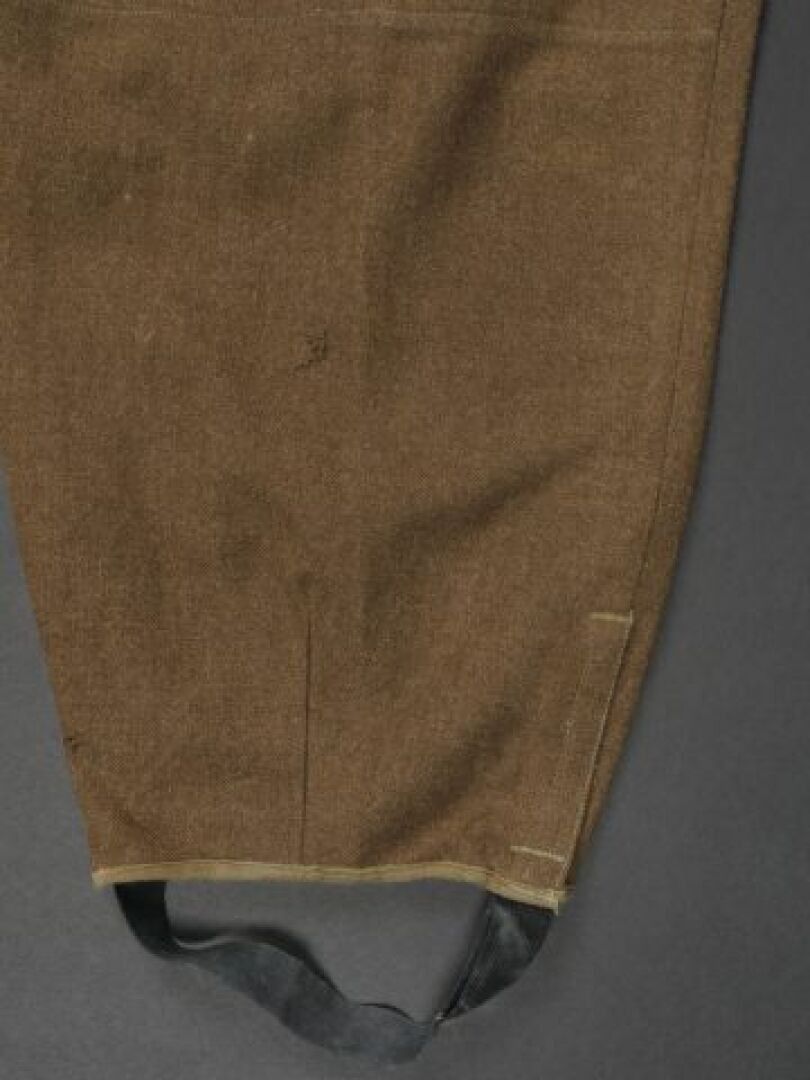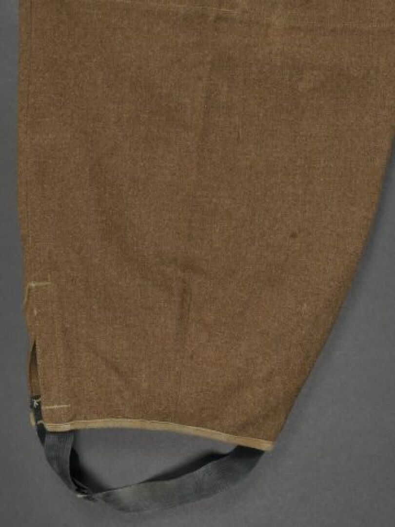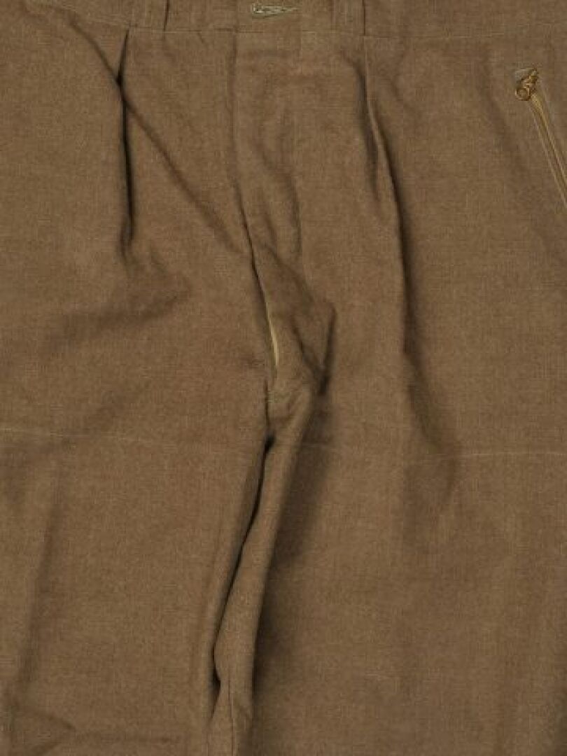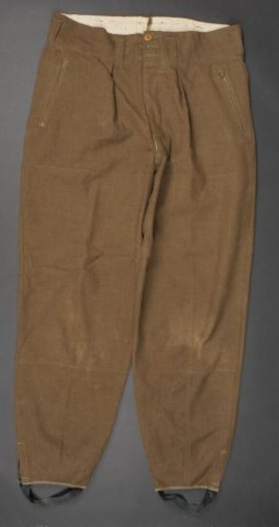 US ski trousers. In thick khaki cloth. Specific model for US army skiers. Spindle-shaped, the elastic at the bottom of the legs is flexible. The hip pockets close with zips. The fly is complete and functional, made by Conmar. All buttons are present. Inside lined in white cotton fabric, some seams at the back have been taken up. Size W34 L 31. Manufacturer's label present but illegible. Some wear and patina, as well as a few stains and tears. Condition II+. 2+