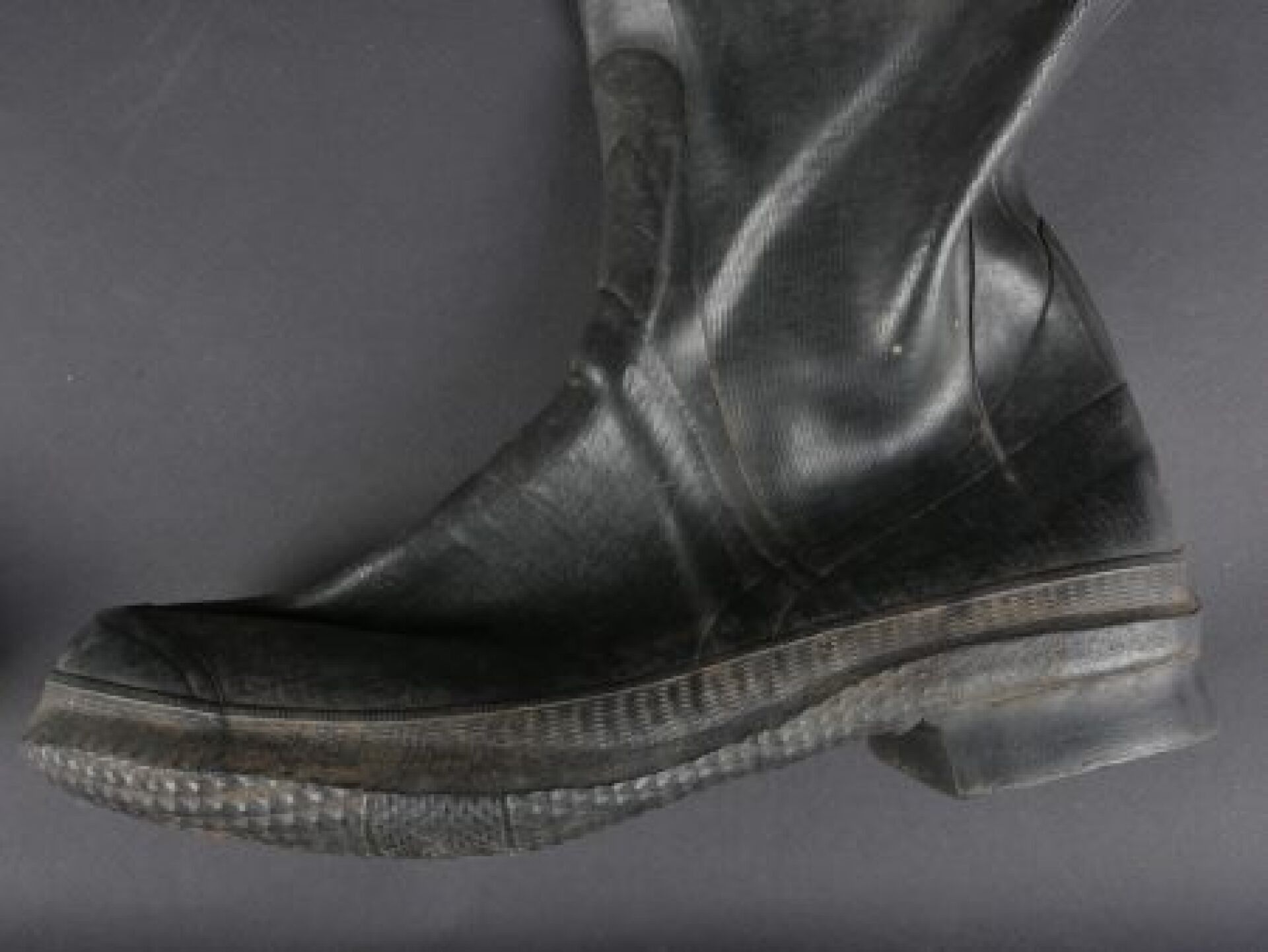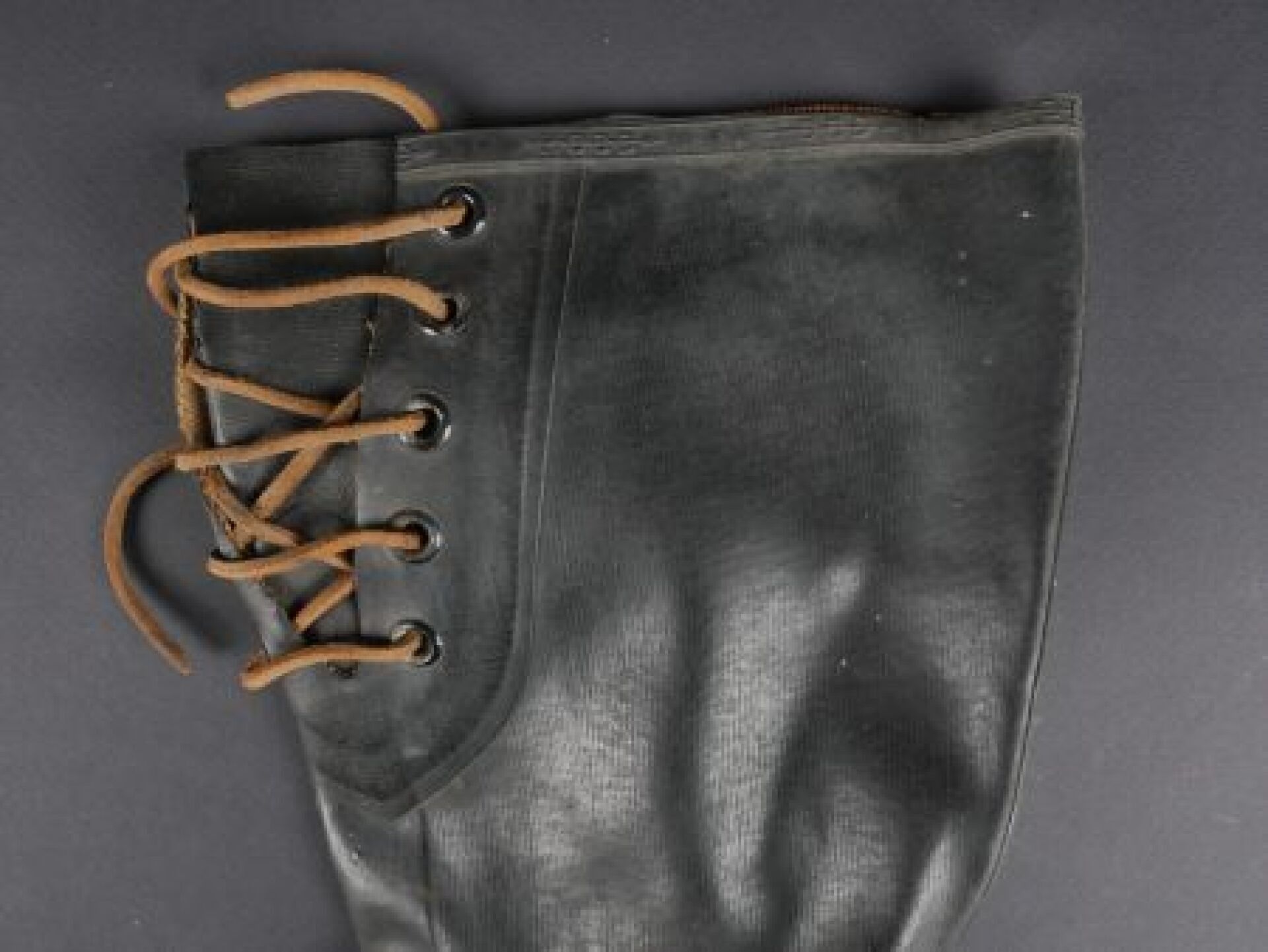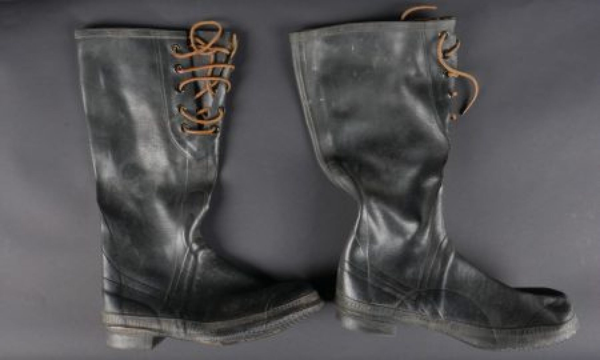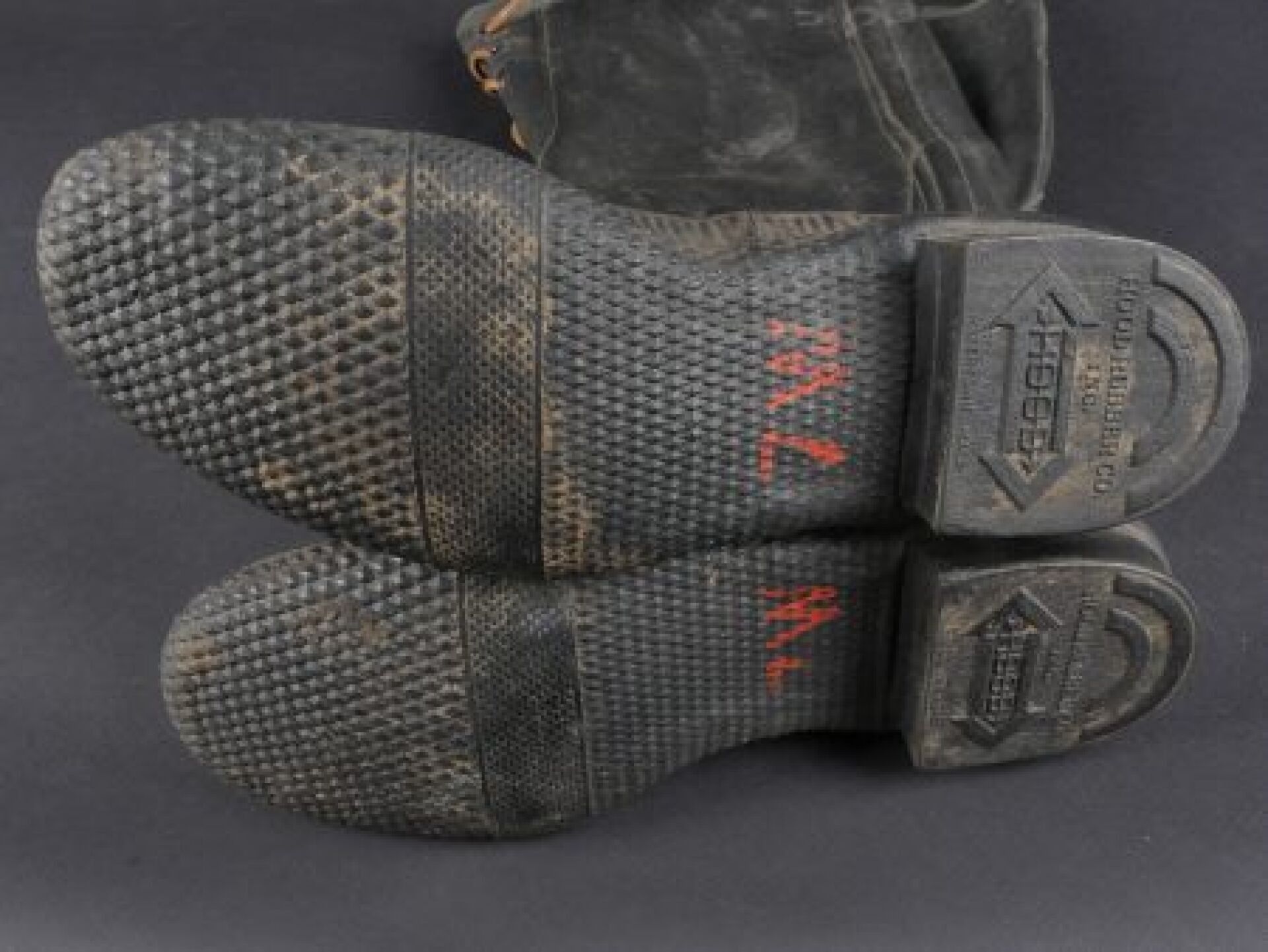 US rubber boots. Homogenous pair in black rubber, leather laces are present. Soles marked 7W, heels made by Hood. Interior markings illegible. Some wear and patina. Condition II+. 2+