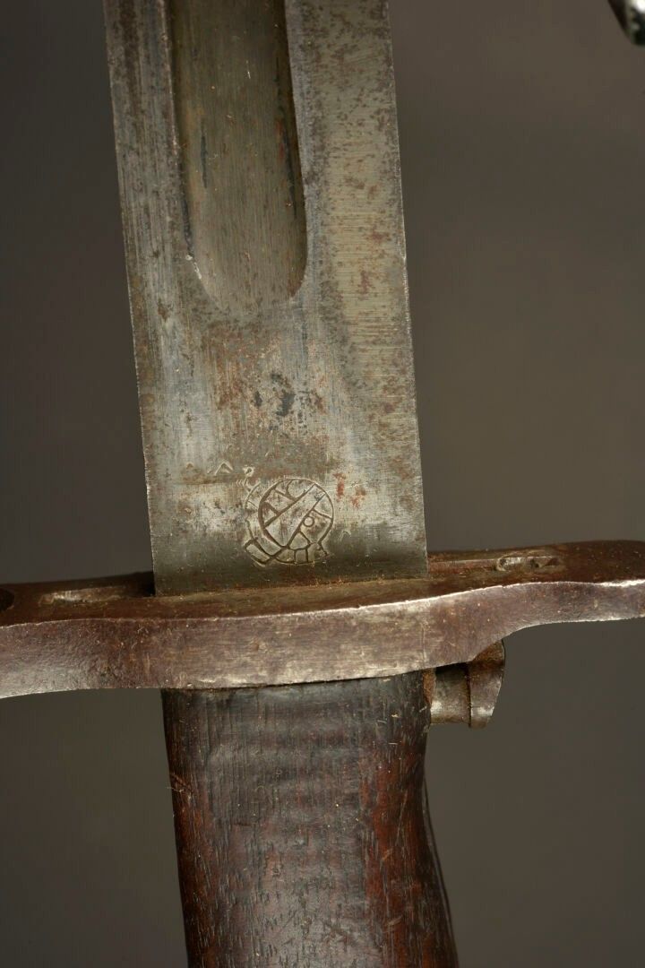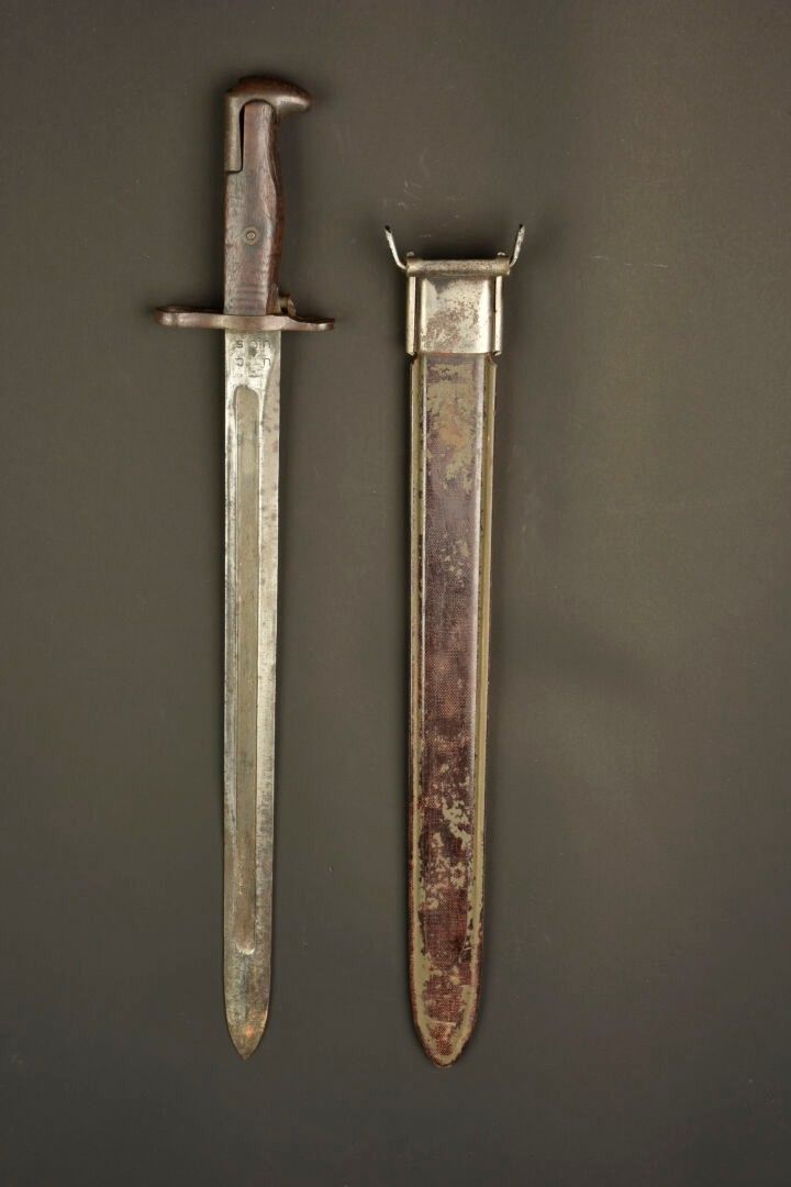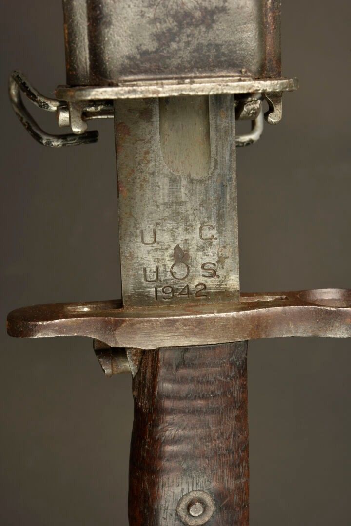 Garand bayonet. Long model. Wooden plates. The metal fittings are partially oxidised. Blade in relatively good condition, some traces of oxidation visible. Manufactured by UC US 1942. Complete scabbard. The belt hook is present. 60% khaki paint. Some wear and patina. Condition II+. For adults only.