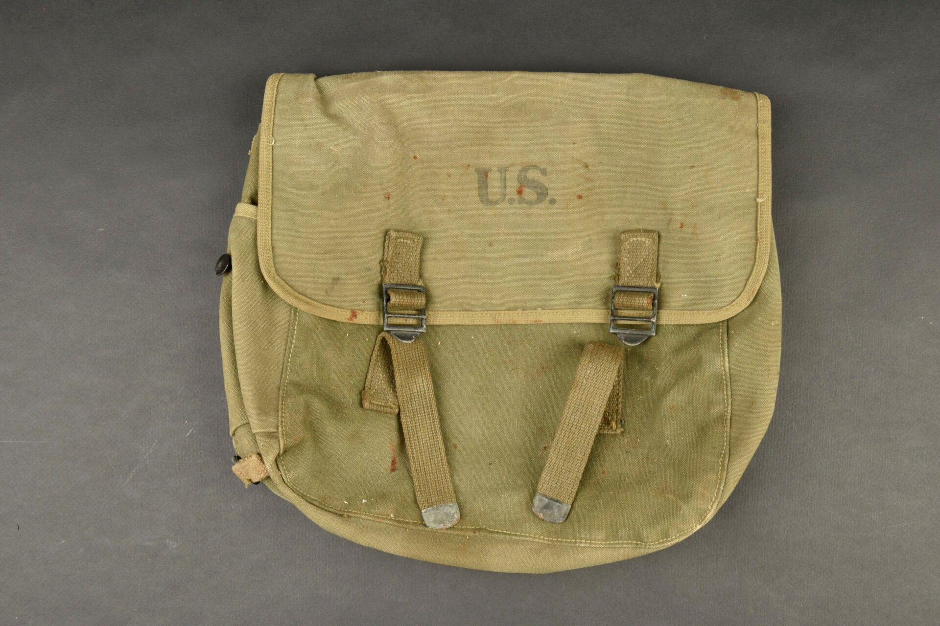 M-36 musette bag. Heavy OD7 canvas, all straps are present except for the carry strap. Nice US marking on the flap. Made by Luce 1944. Some wear, patina and stains. Condition II+. 2+