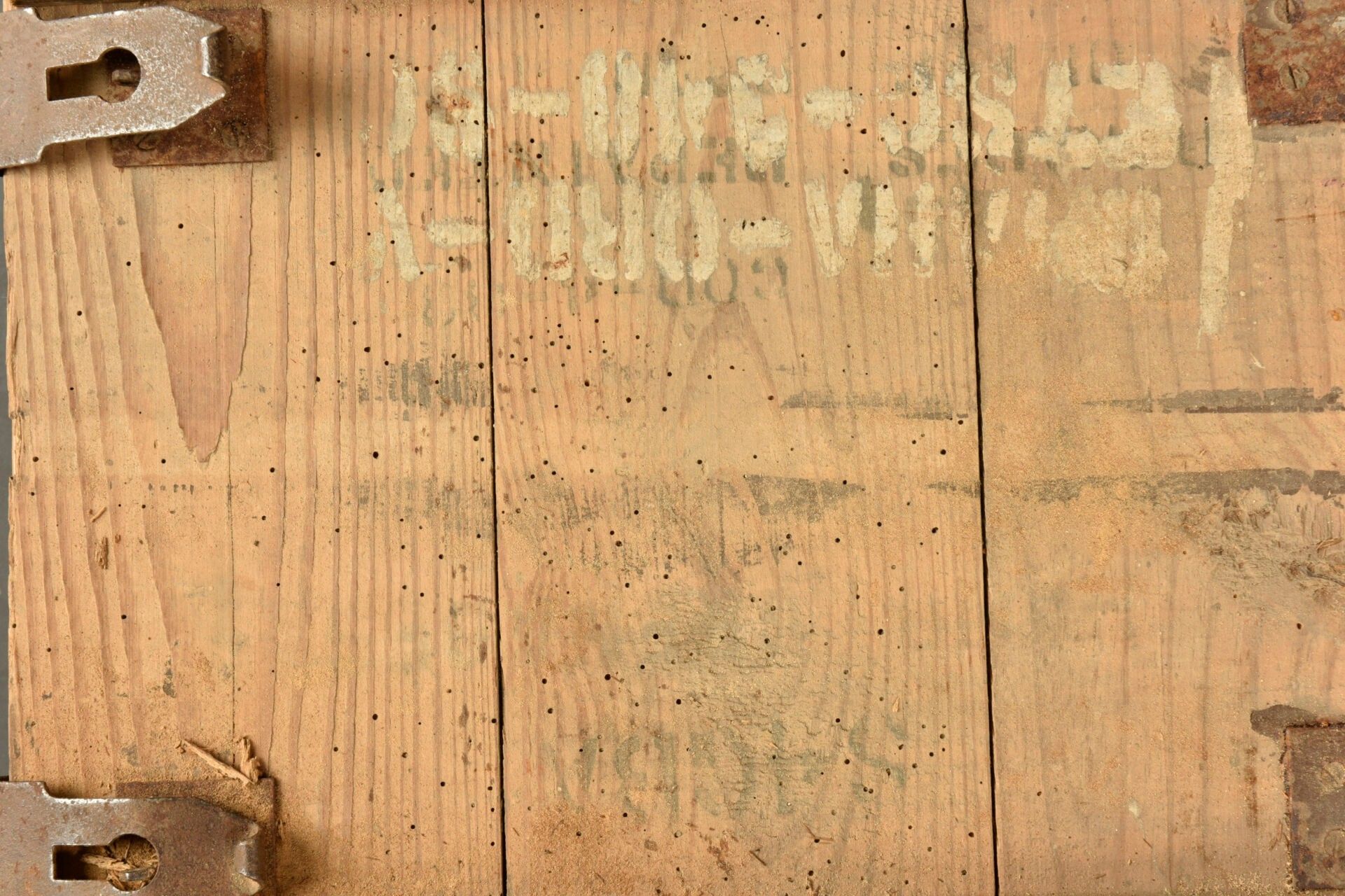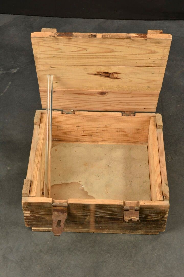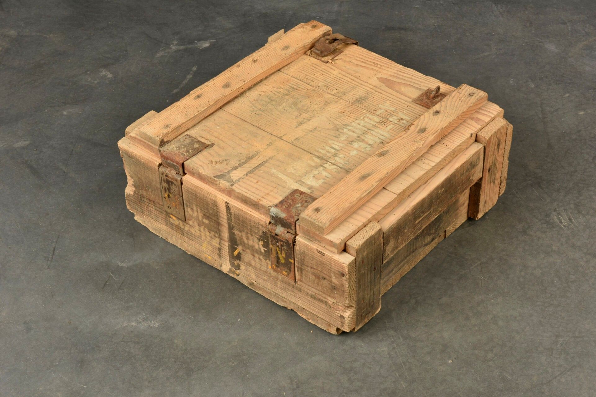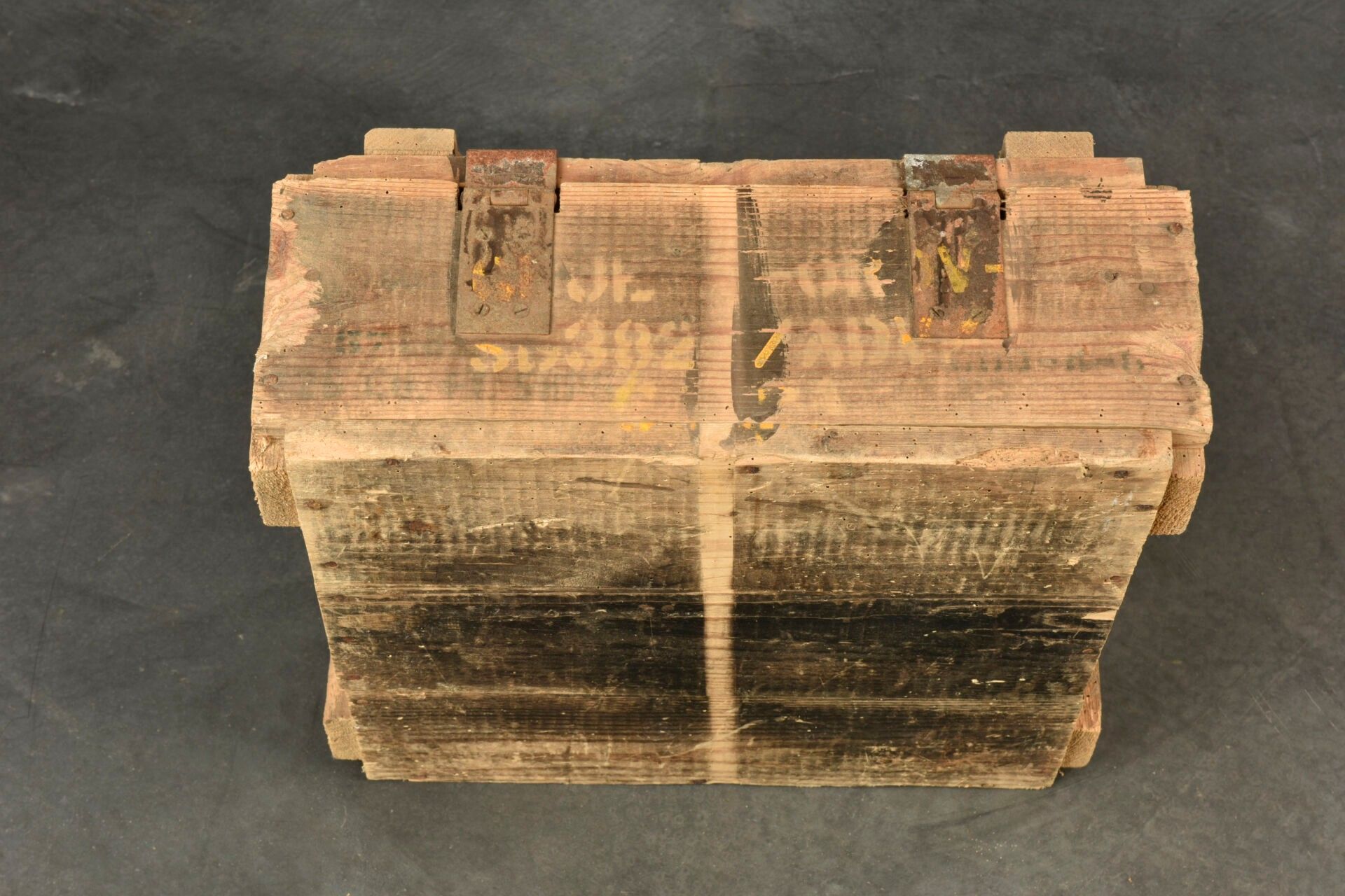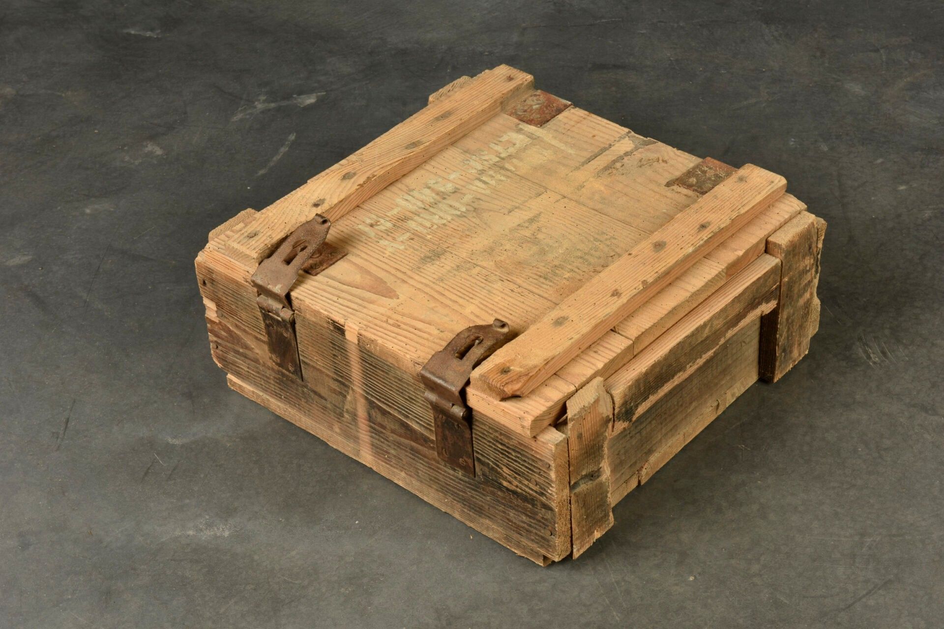 US ammunition box. Wooden with its lid. Markings illegible. The hooks are functional but oxidised. Some wear and patina. Condition II+. 2+