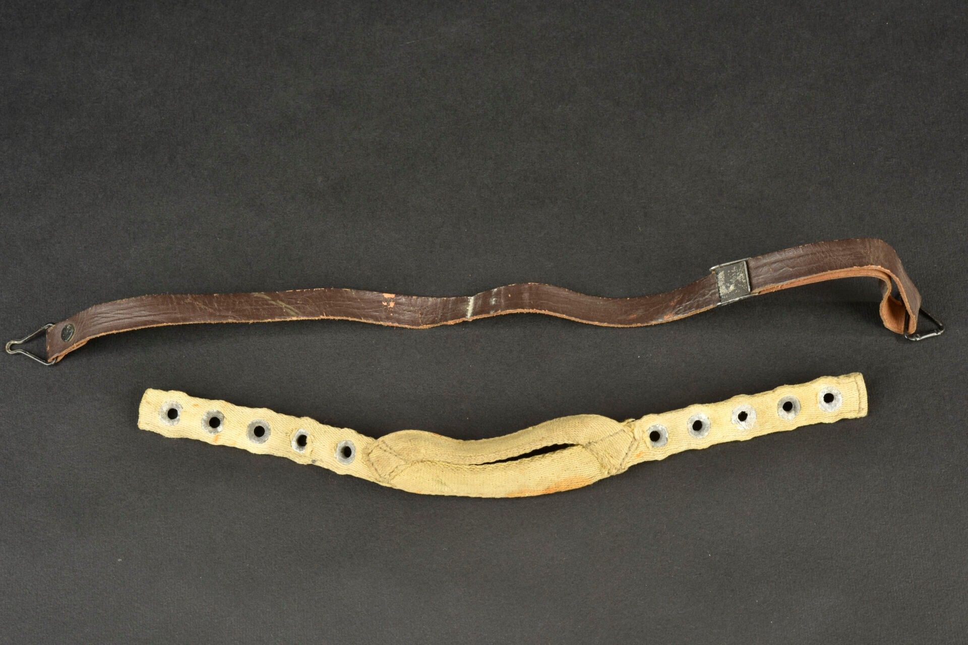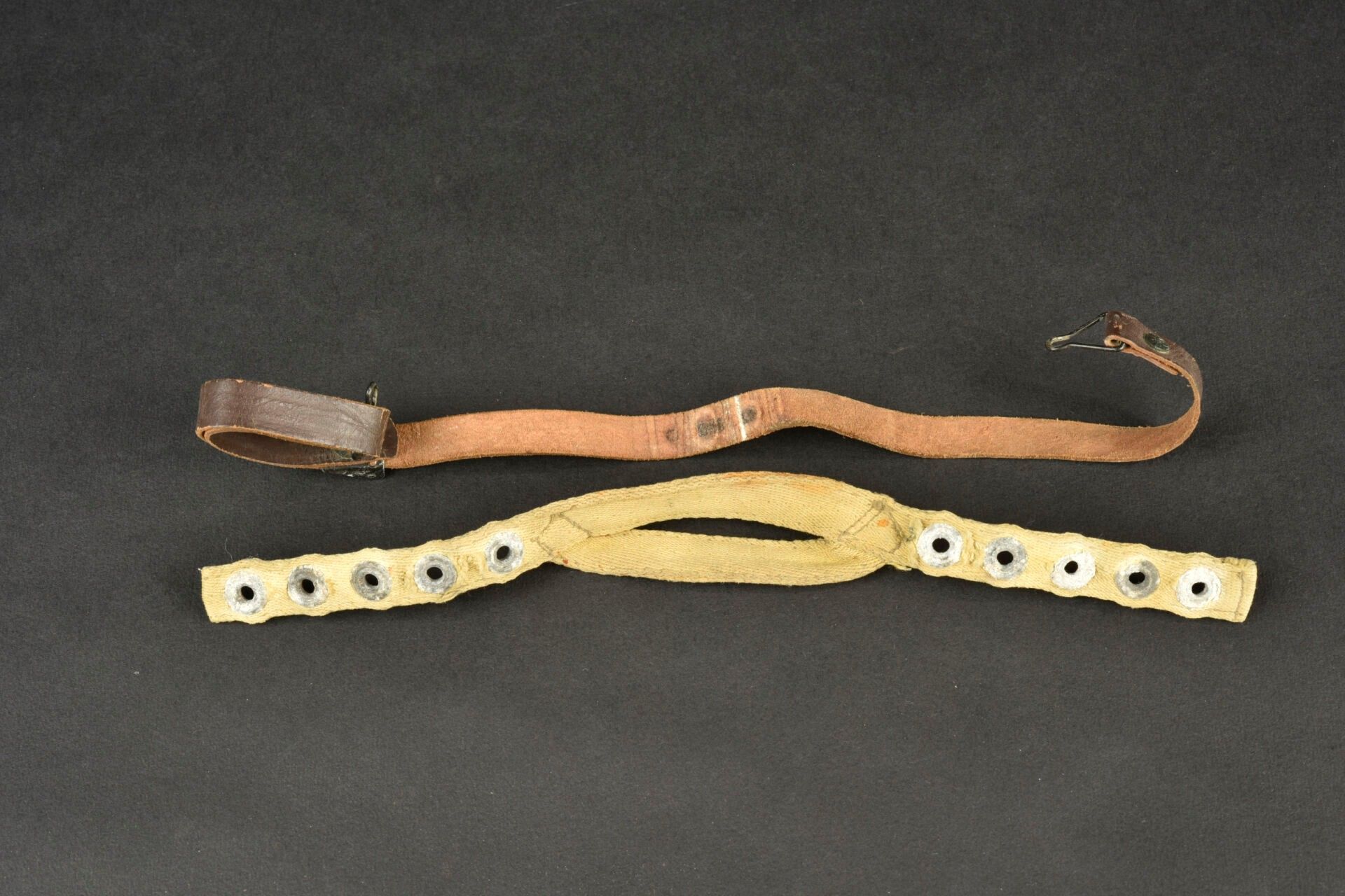 US paratrooper chinstrap. Khaki canvas. Five adjustment eyelets. Metal parts are oxidised. US liner chinstrap, complete, DOT made. Some wear and patina to be noted. Condition II+. 2+
