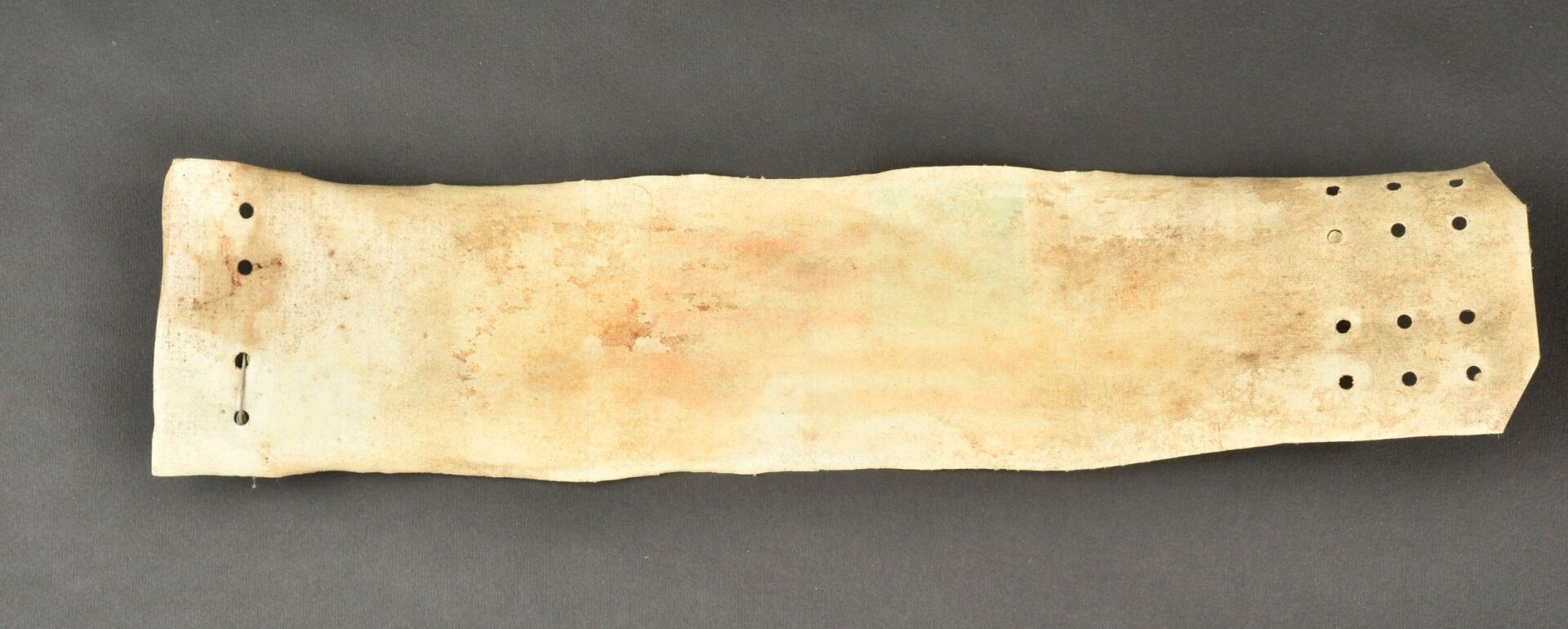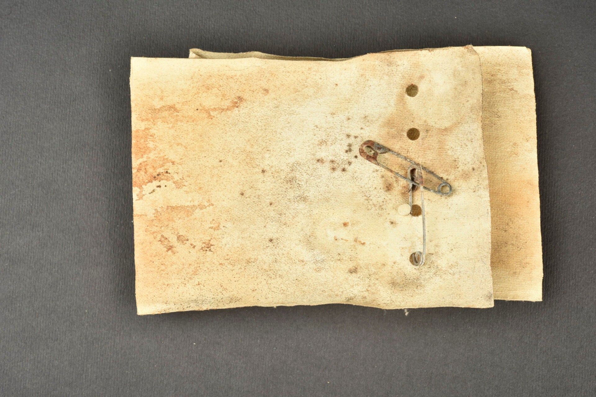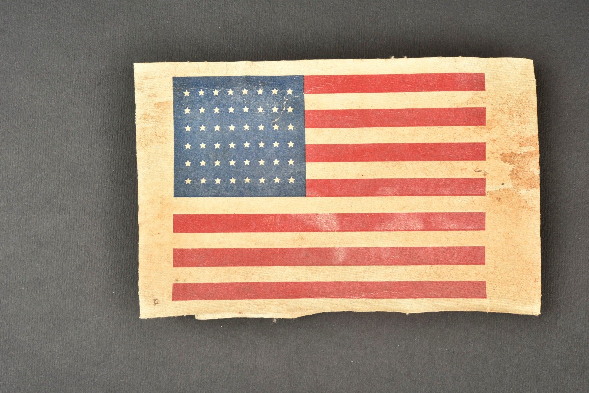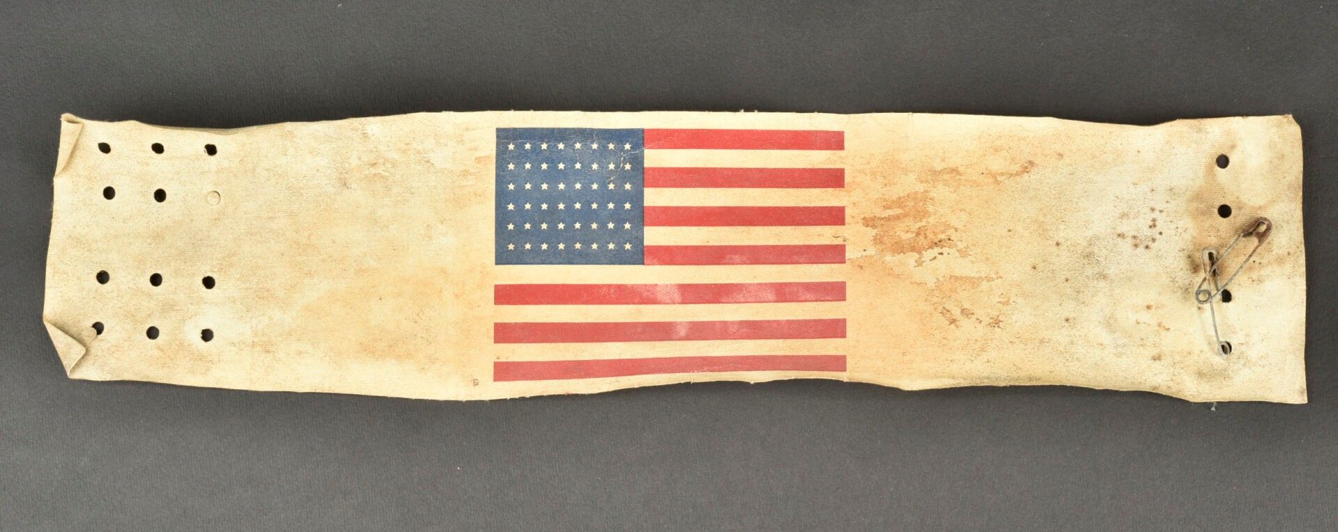 Invasion armband. White waterproof canvas. 48 star printed US flag. Several rows of adjustment holes on back. Two safety pins complete, but heavily oxidised. Relatively stiff canvas. Some wear, patina and stains. Condition II+. 2+