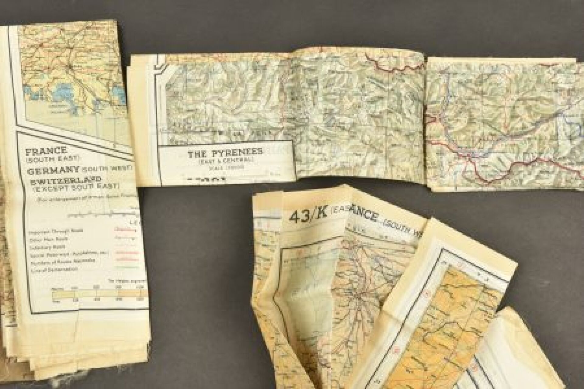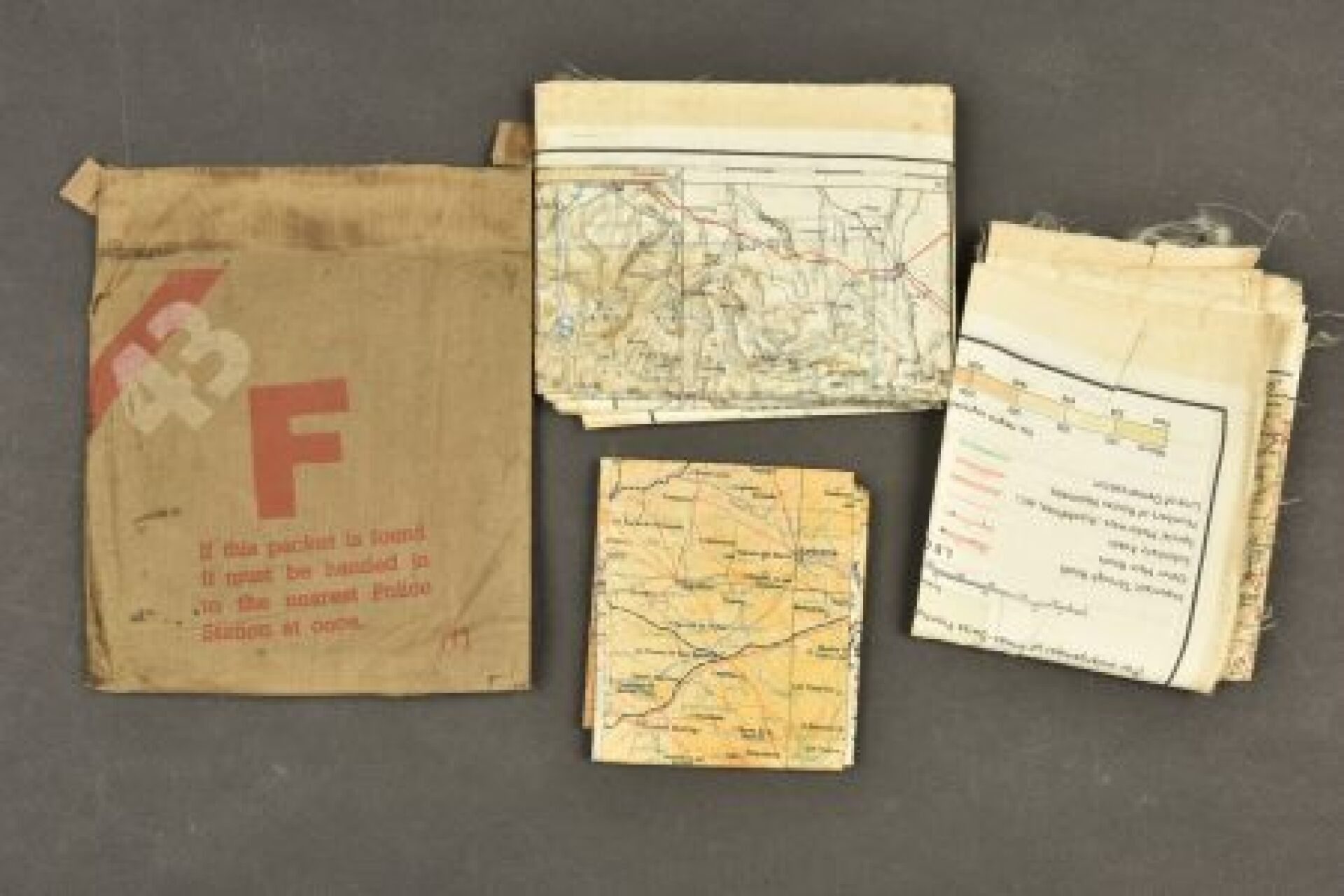 Silk escape cards. Comprising a waterproof canvas pouch, open, marked F in red, also MARK III, and 43 in white paint. Tears to the sides of the pouch. Containing a silk card, marked 3C, originally folded, on the front Sheet C Holland Belgium France Germany and on the reverse Sheet D Belgium Germany. A second silk card, originally folded, on the front marked Sheet A, France Belgium Holland, on the reverse Sheet B, France Spain. A third silk card, marked 43 K Portugal Spain on the front. On reverse Spain France. Original folded. According to the seller, these cards were found by Jacques Collé, owner of the Dieppe Museum, in the wreckage of a bomber that crashed in Dieppe. Some wear and patina to be noted. Condition II+. 2+