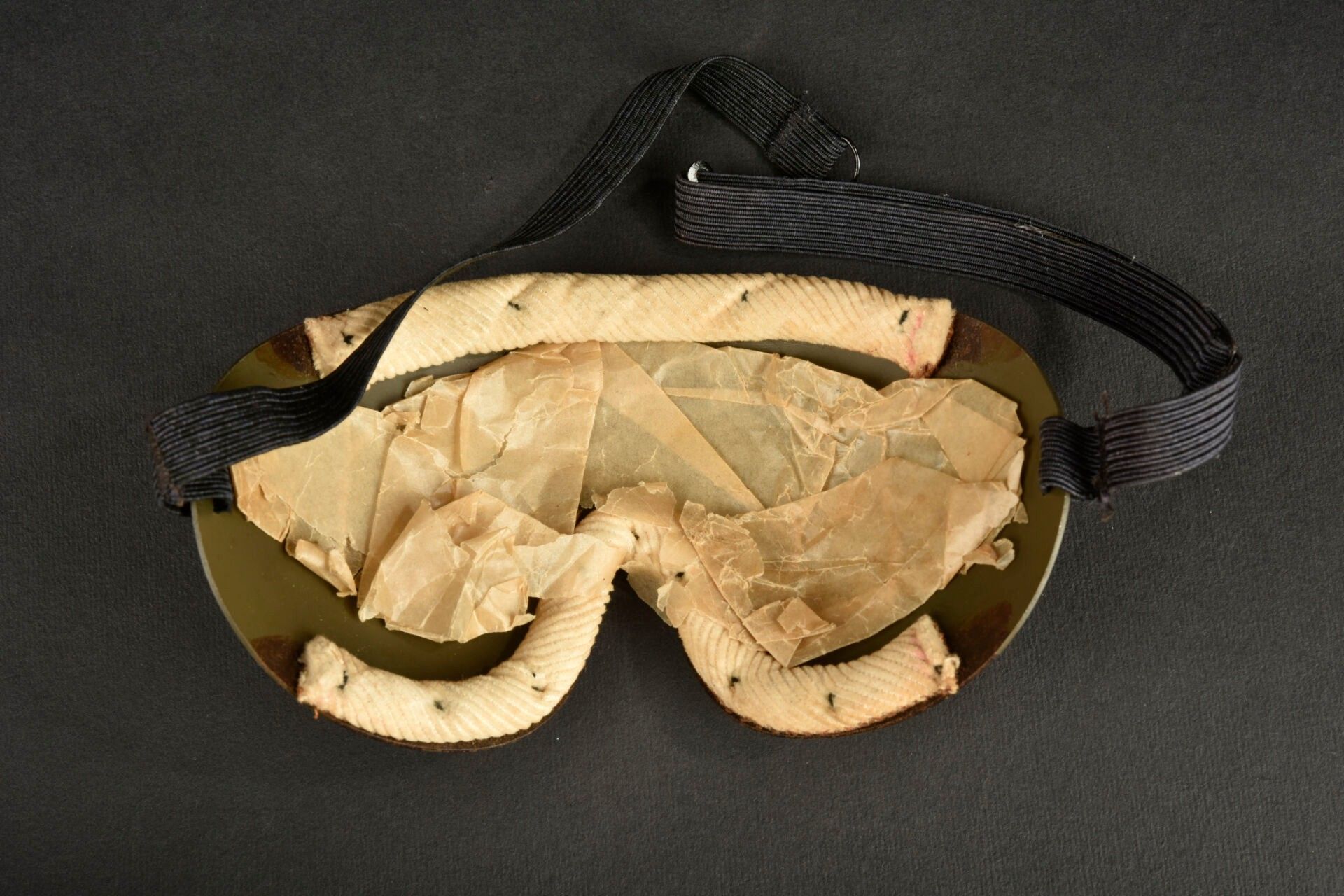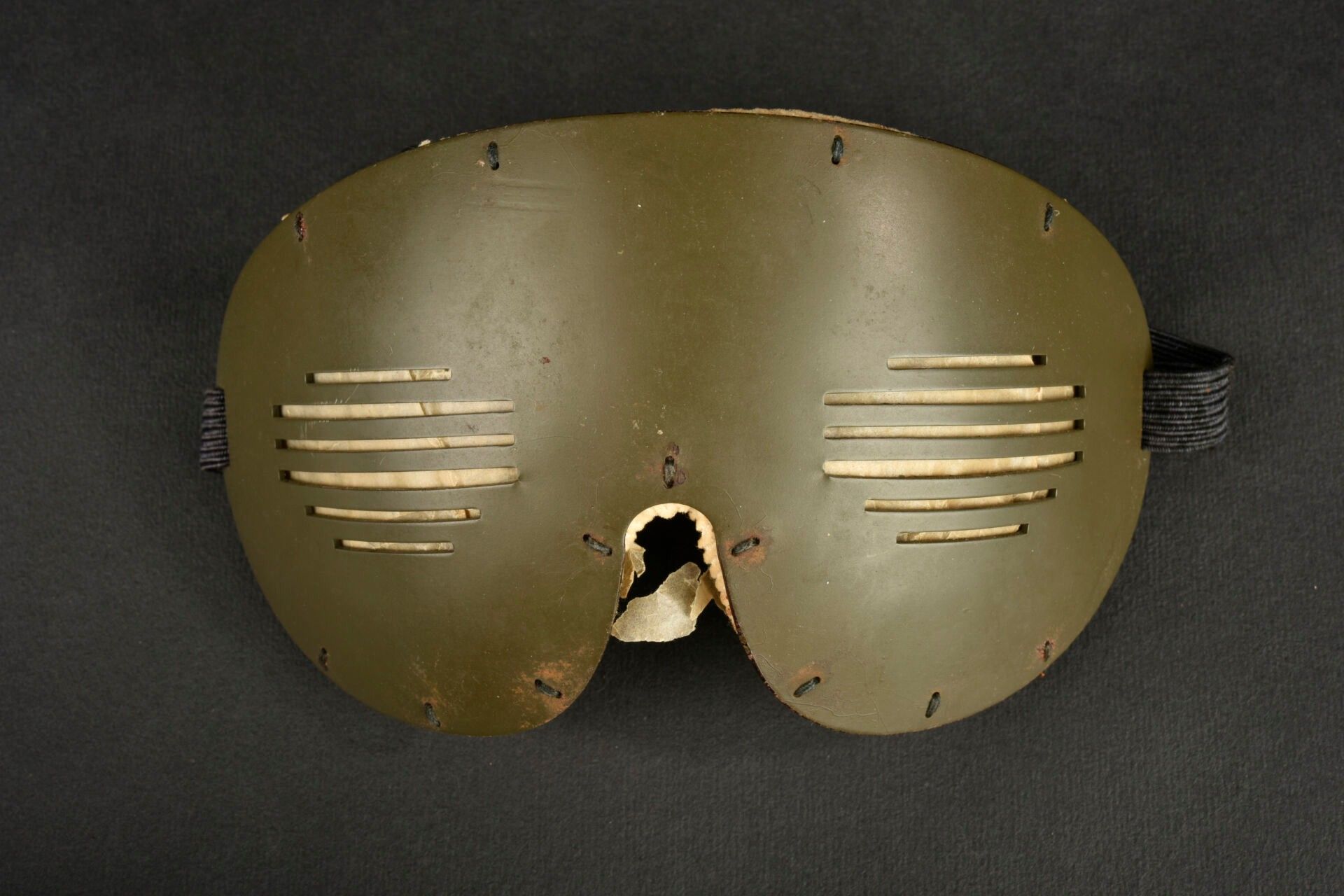 Anti-flak bezel. Metal, 90% khaki paint. White felt lining. Distended elastic. Some wear and patina. Condition II+. 2+