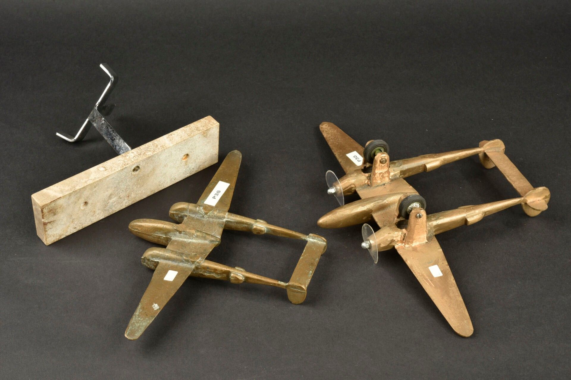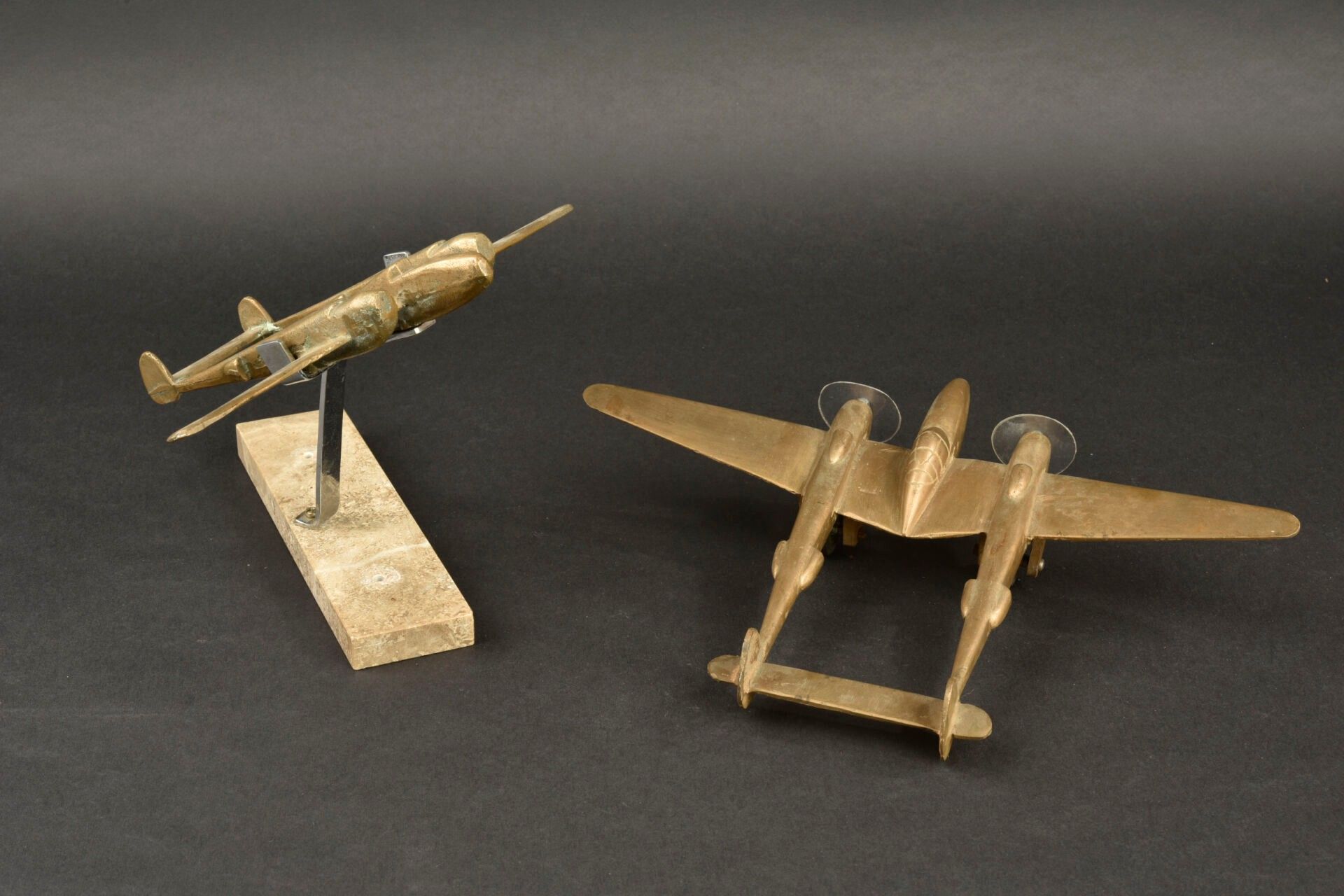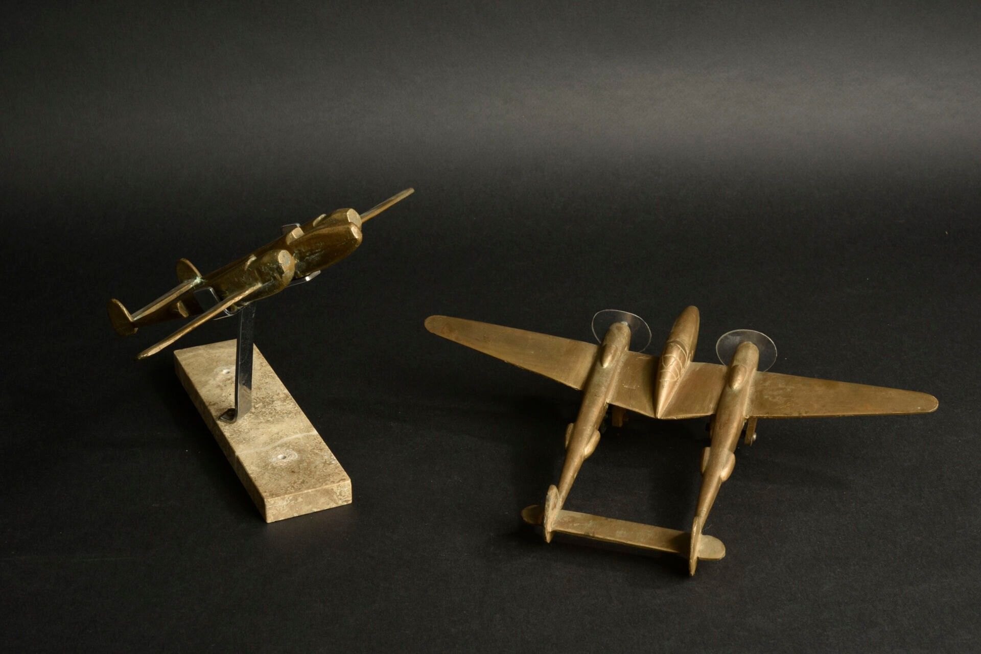 Set of 2 bronze American P38 Lightning aircraft models. One 23.6cm long x 33.3cm wingspan on wheels with plastic disc propellers. A second, 19 cm long x 27 cm wingspan, on a stand and stone terrace. Very decorative II
