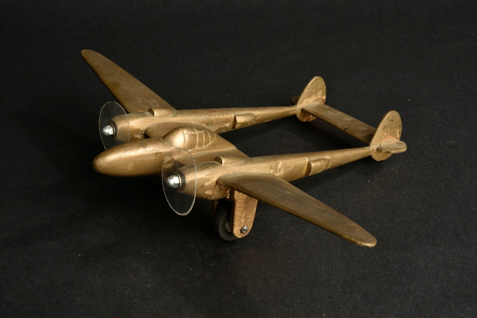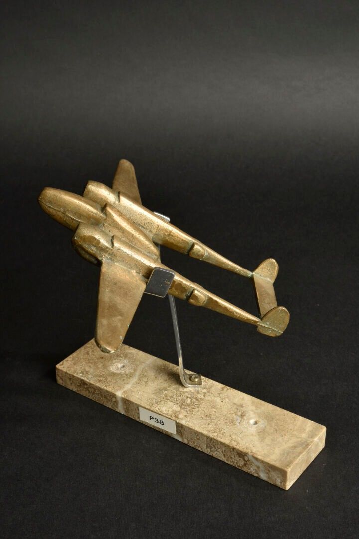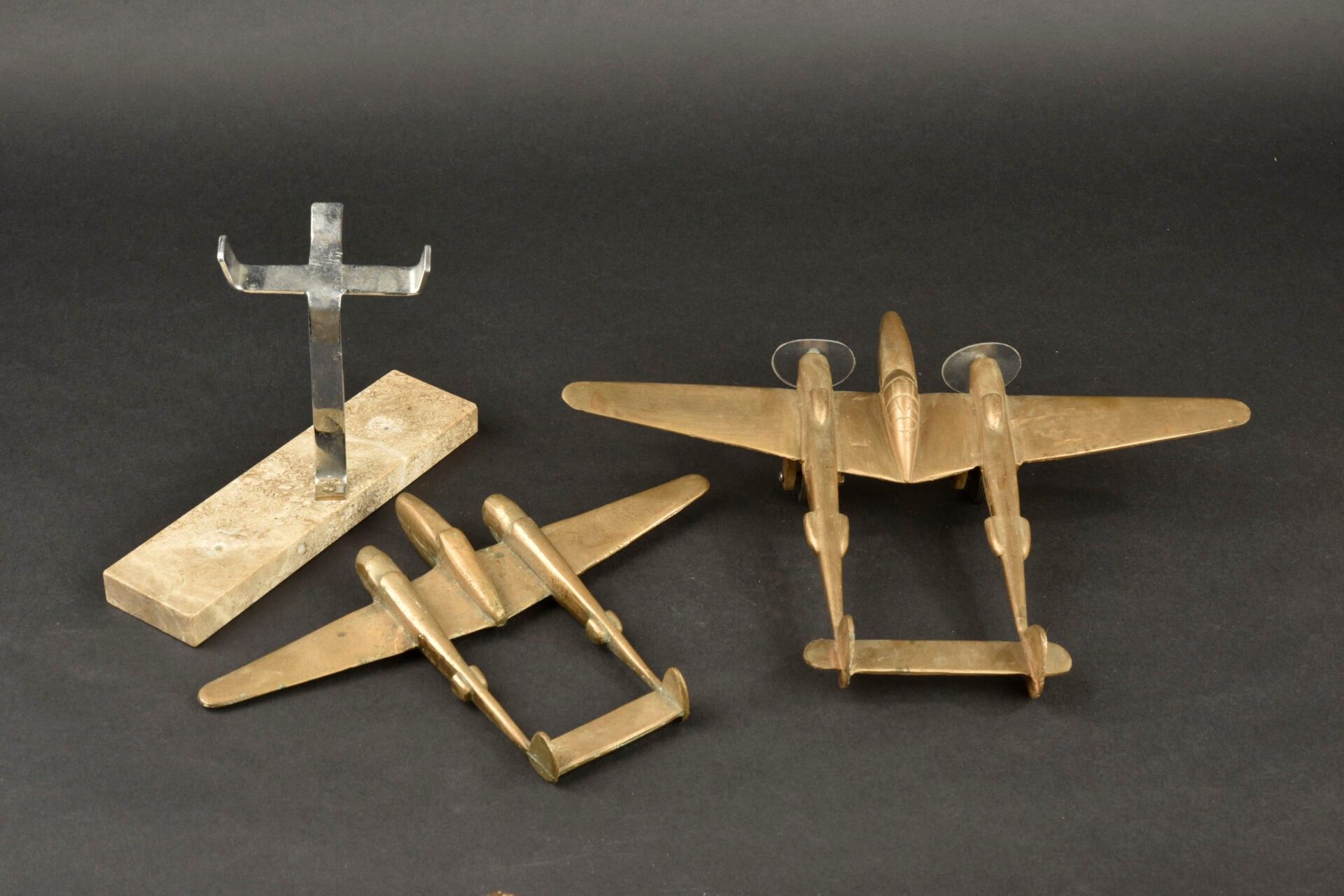 Set of 2 bronze American P38 Lightning aircraft models. One 23.6cm long x 33.3cm wingspan on wheels with plastic disc propellers. A second, 19 cm long x 27 cm wingspan, on a stand and stone terrace. Very decorative II
