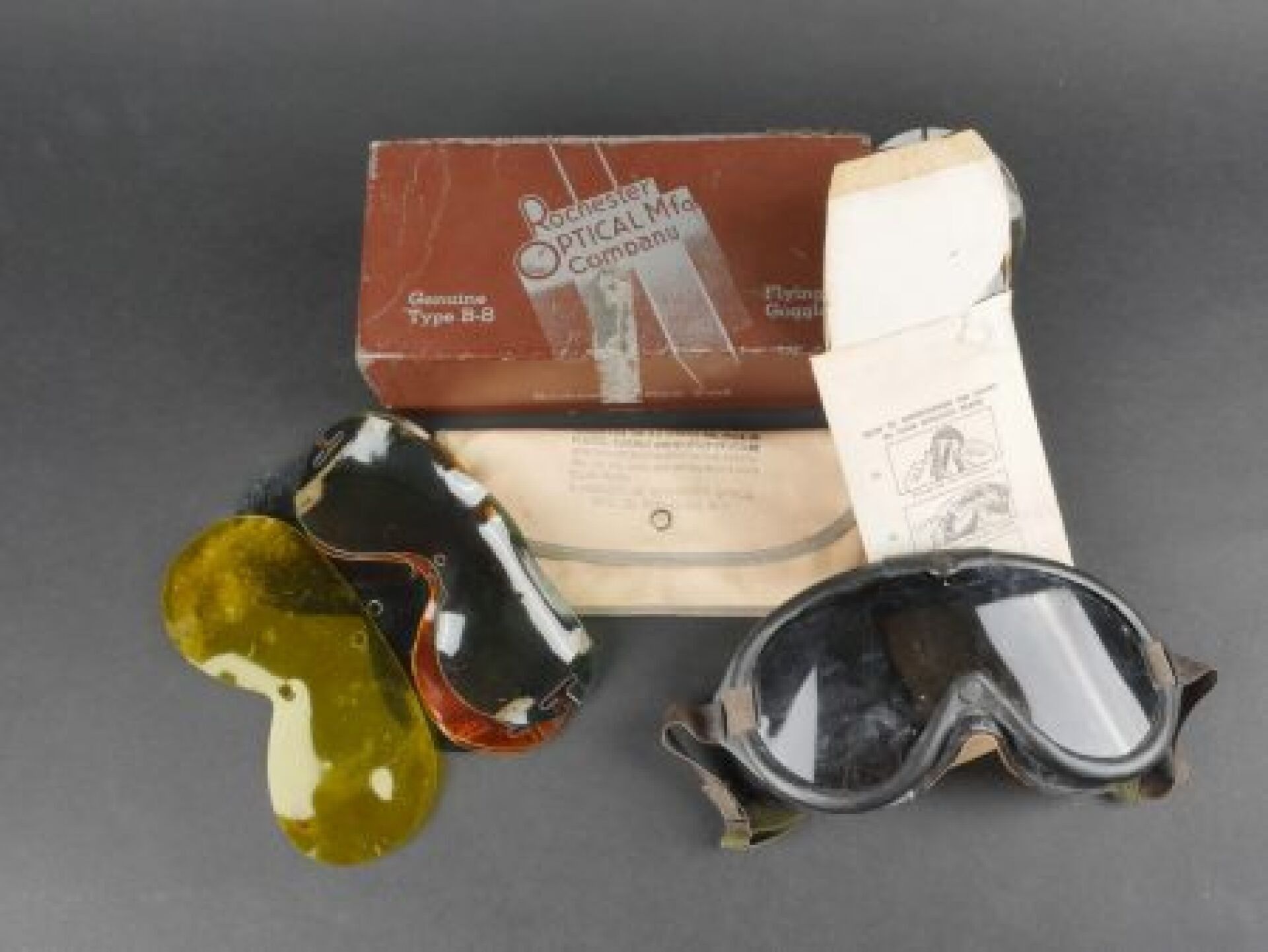 B-8 flight goggles. Nice brown cardboard box. Markings Flying Goggles Genuine Type B-8 Rochester Optical MFG company. Black rubber B-8 goggles, full elastic, chamois lining, smoked glass filter. Beige canvas cover, functional snap. The filters are present, as well as the instructions for use. Some wear and patina. Condition II+. 2+