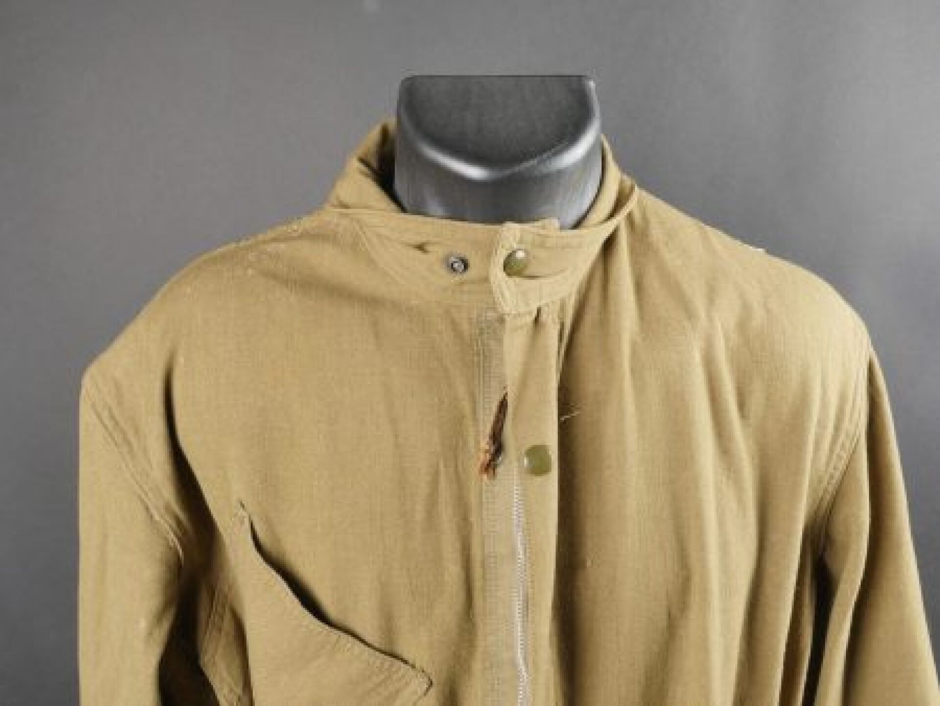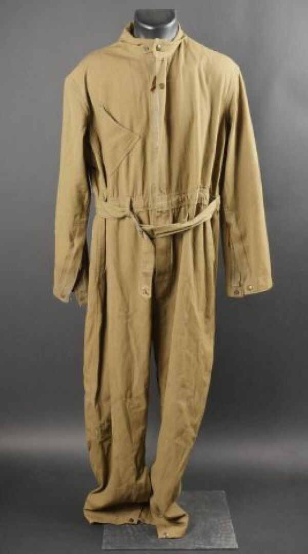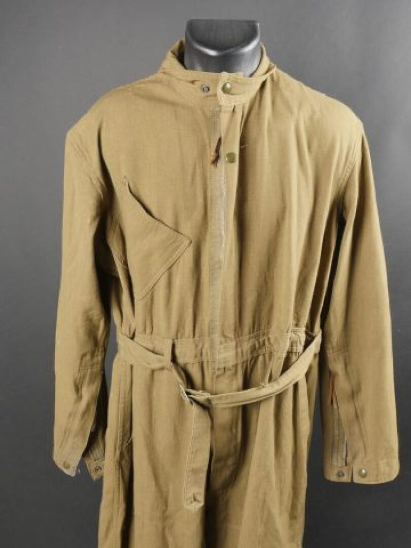 A-4 flight suit. Thick khaki canvas. Functional zip, made by Crown, leather tab present. Full belt. Label in collar dated 1942, size 44. Some wear and patina, as well as a few stains and tears. Condition II+. 2+