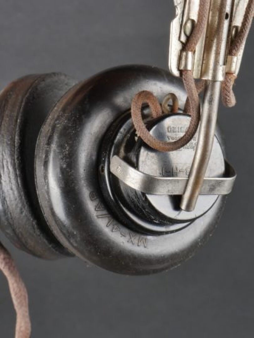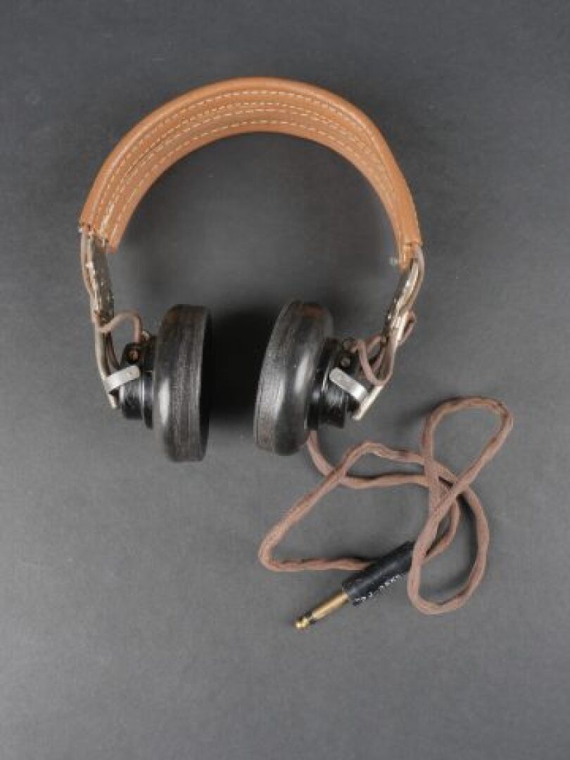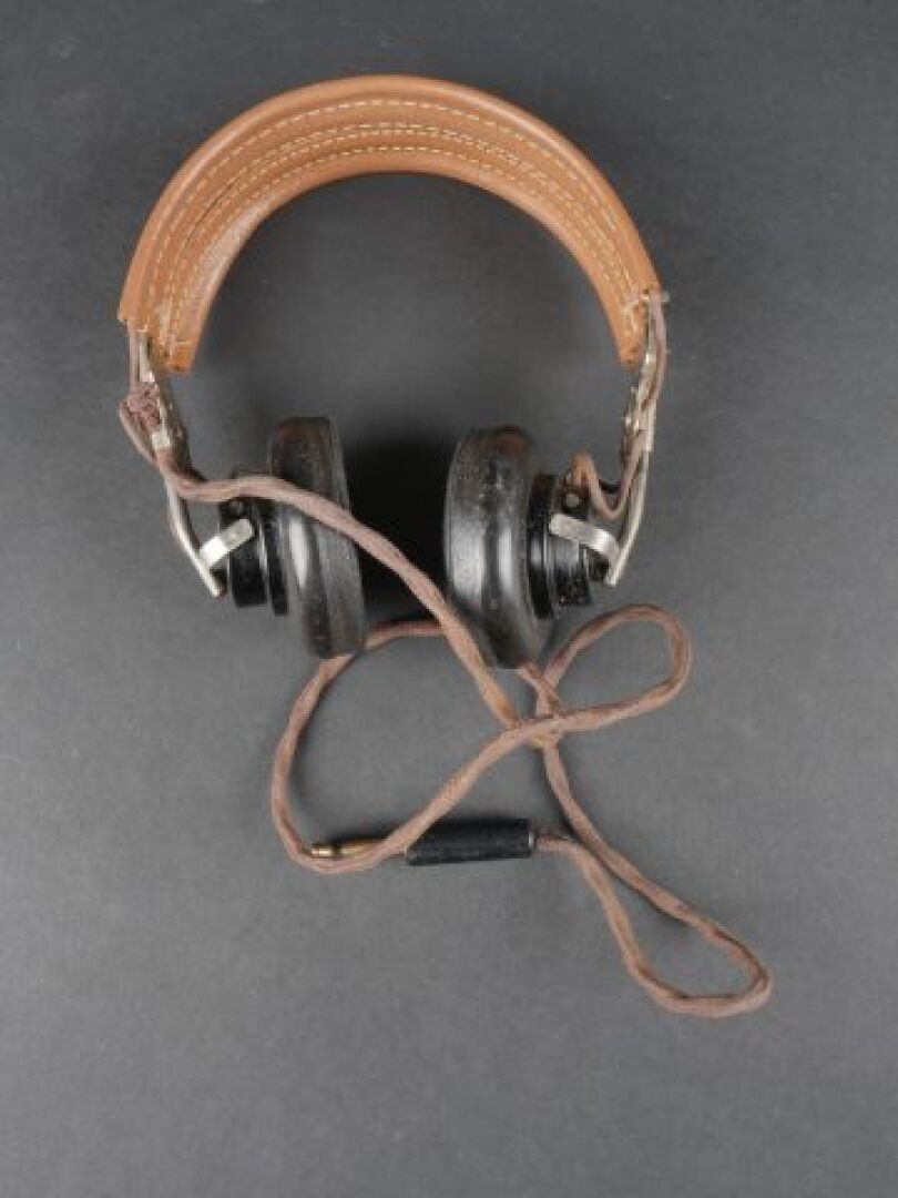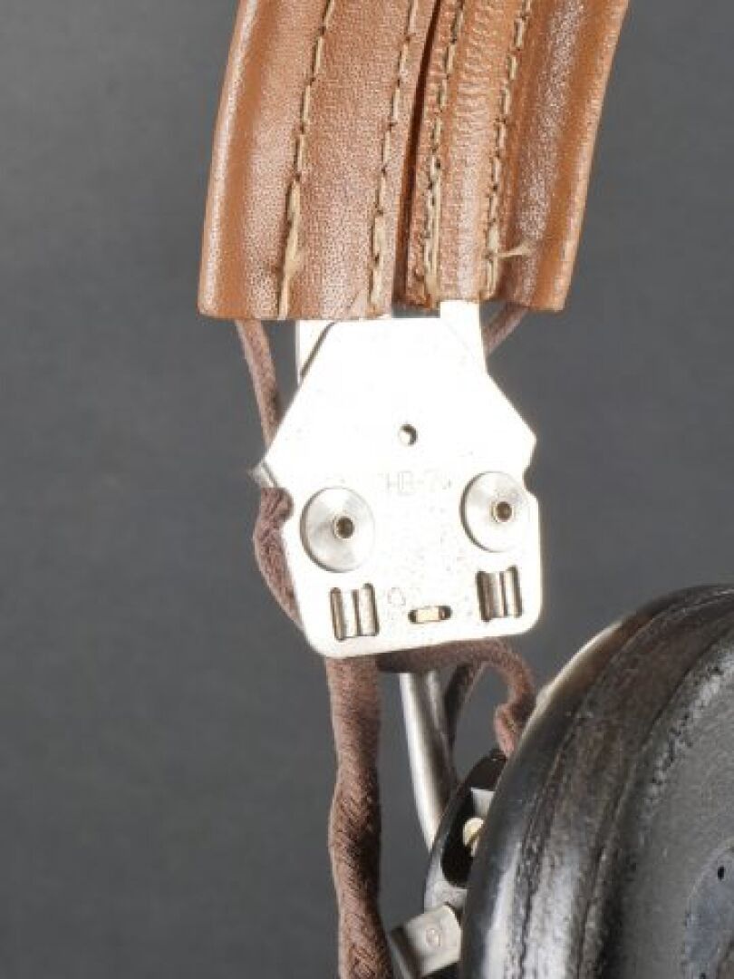 ANH-15 radio headset. Metal frame. Covered in thick brown leather. Rubber ear cups. Cable and plug present. Some wear and patina. Condition II+. 2+