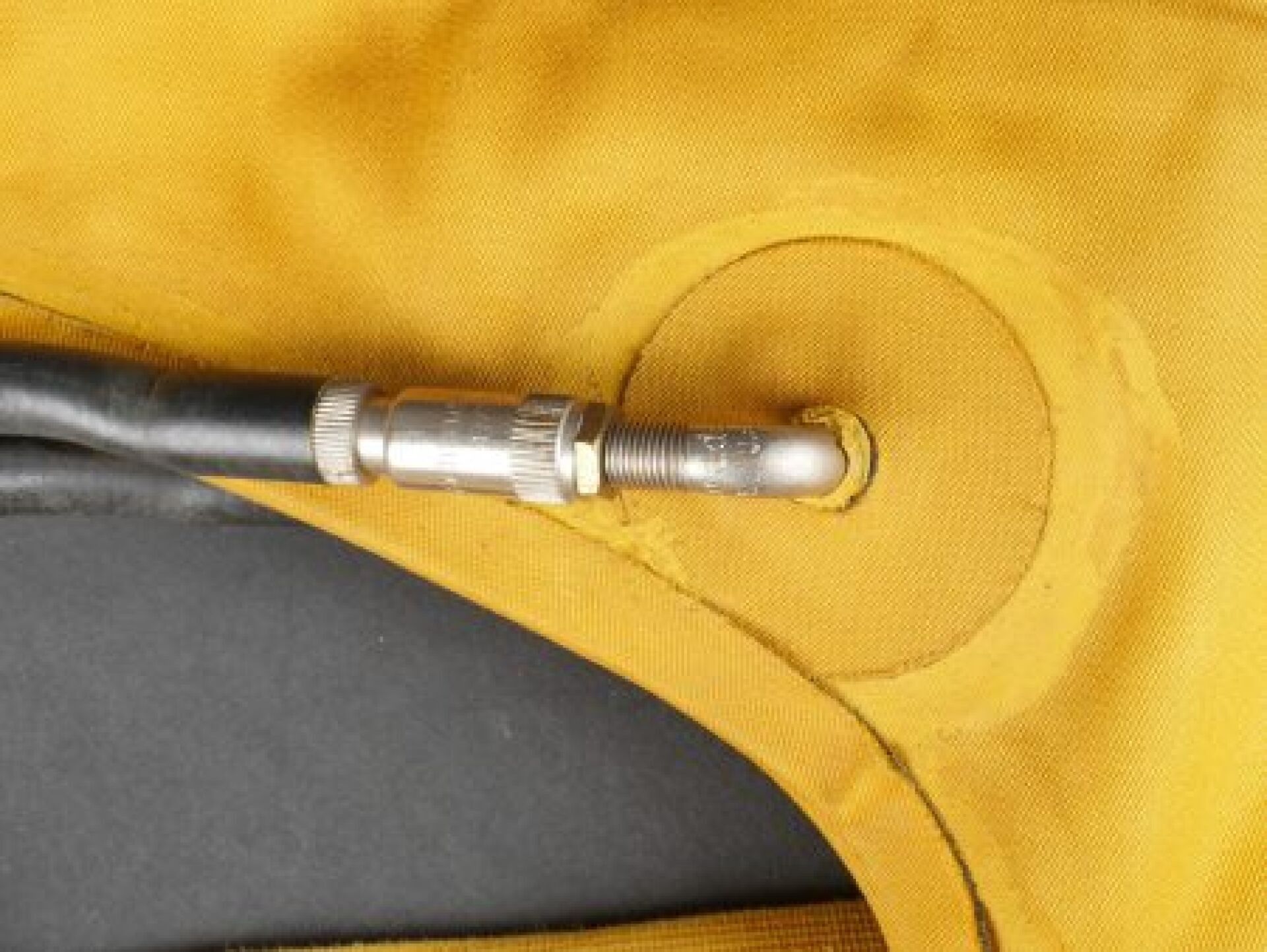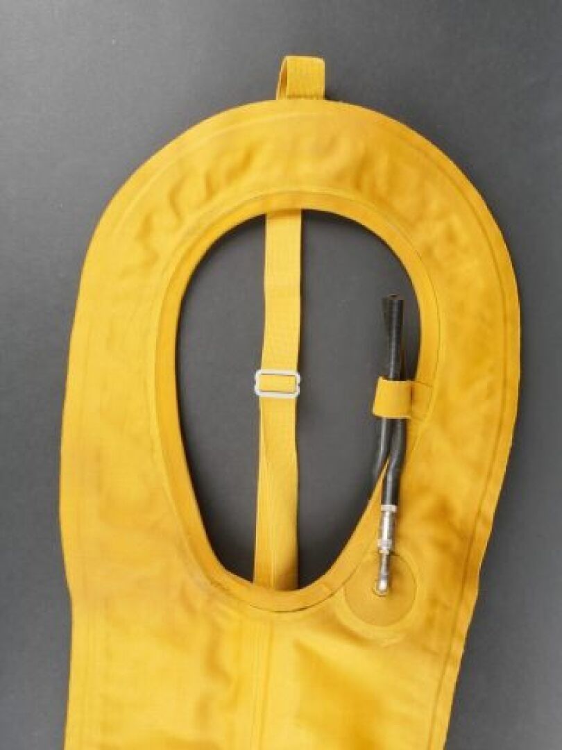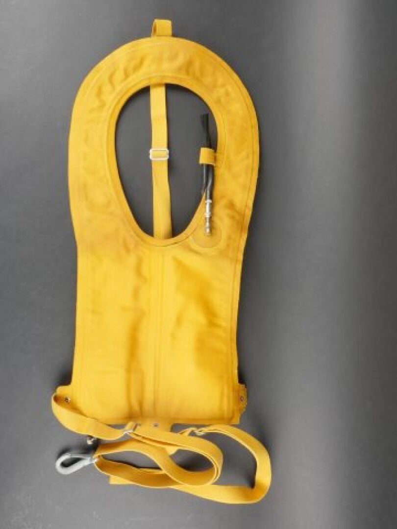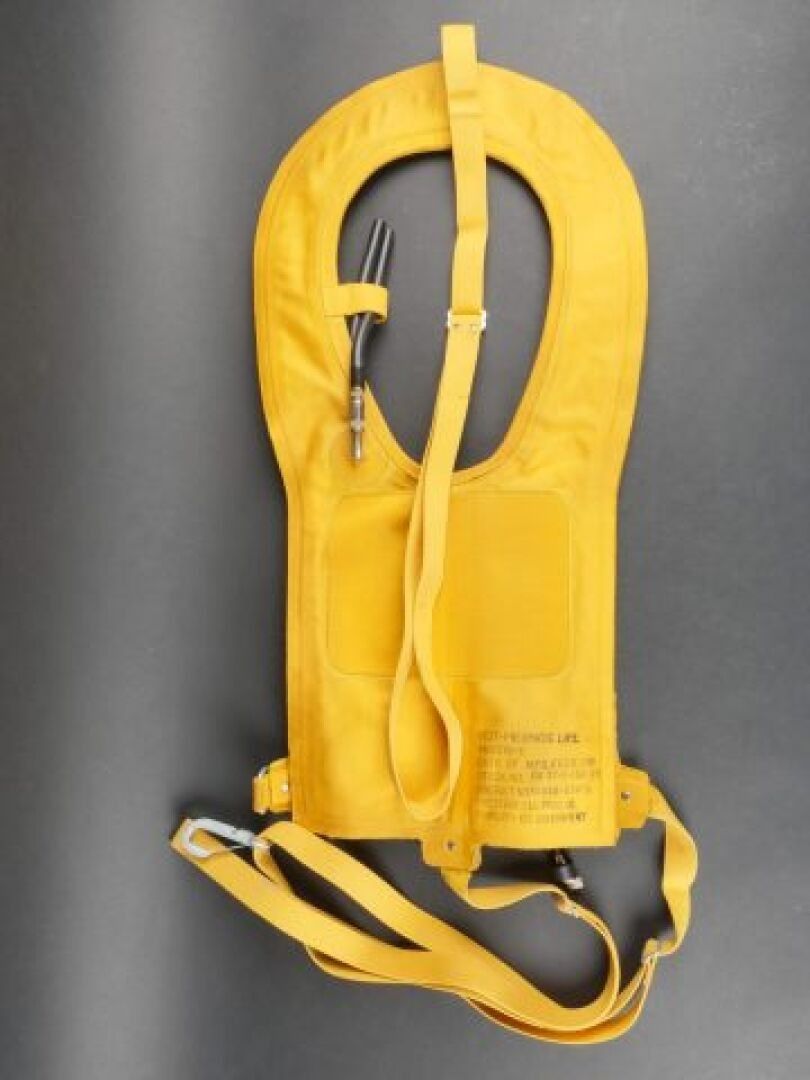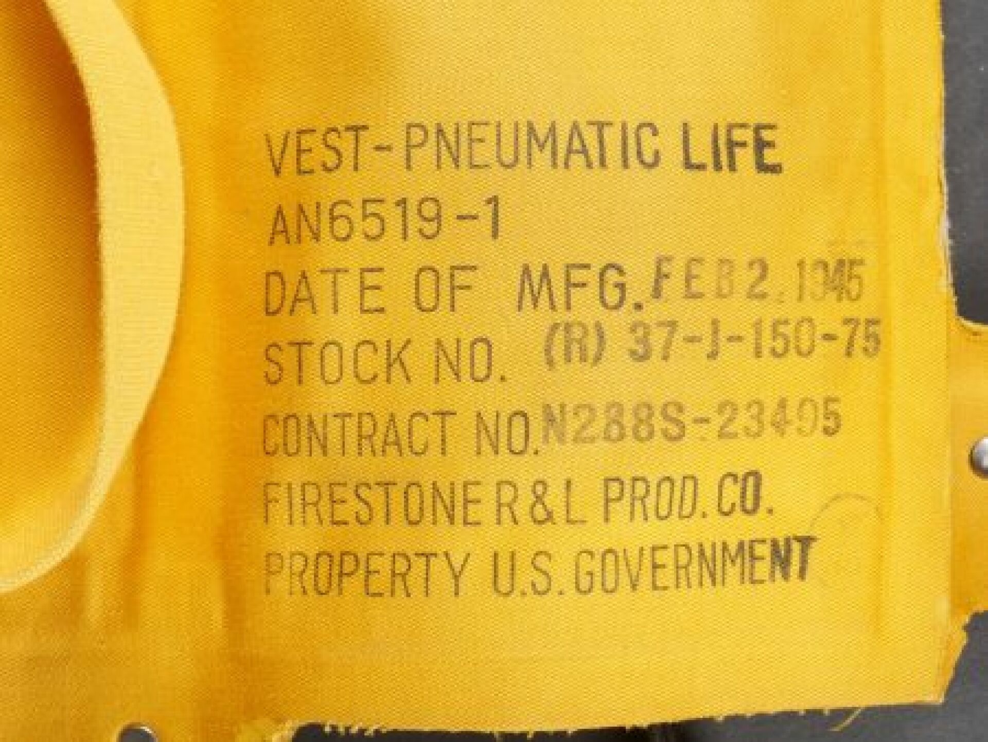 Mae Vest AN 6519-1. Yellow canvas. All straps present. Soft canvas. Automatic inflation canisters are present with their cords. Rubber inflation hoses are present. Made by Firestone R&L Prod Co, dated 2 February 1945. To note a light wear and patina of the part, as well as some stains. Condition I-. 1-
