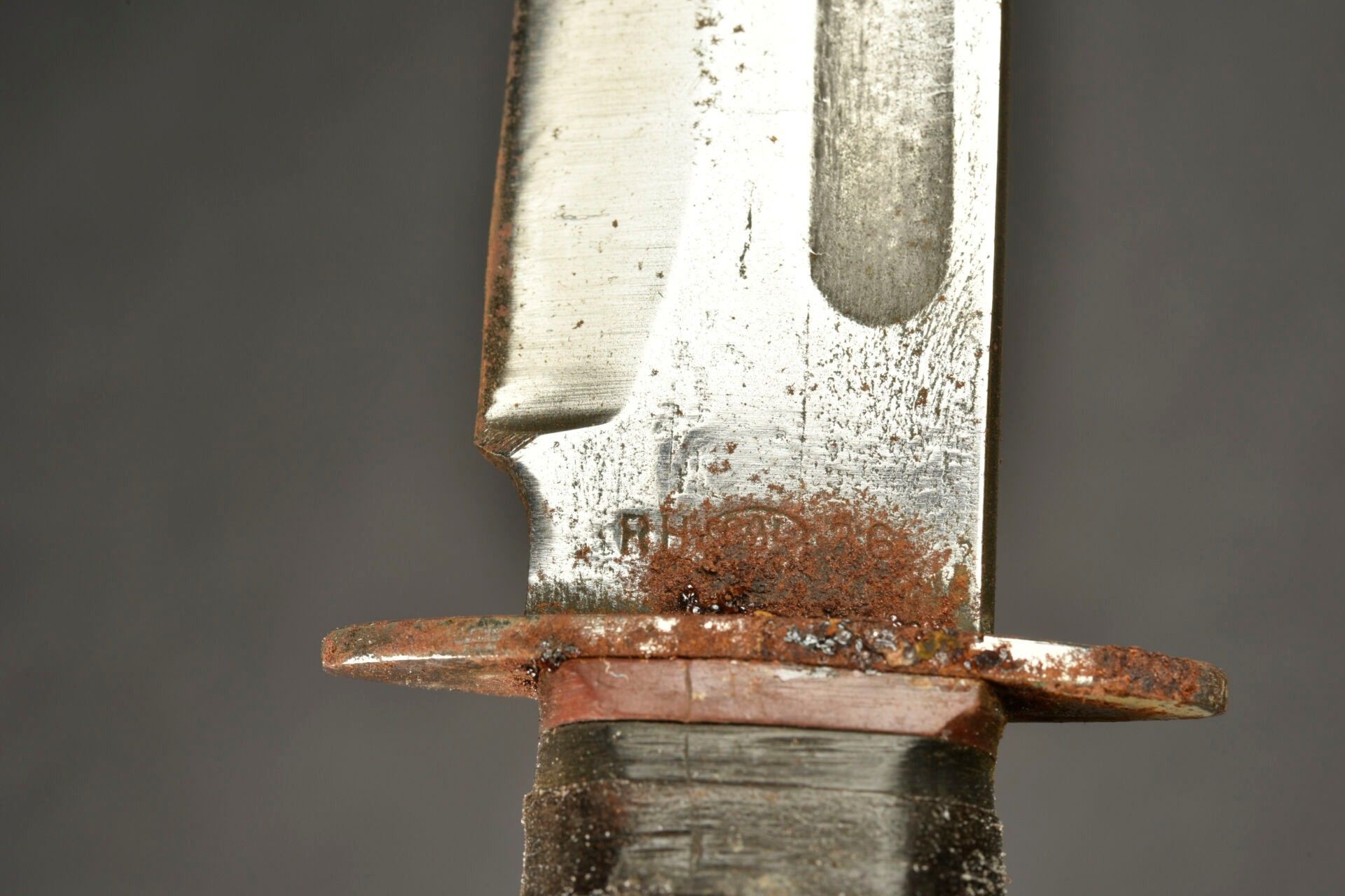 RH 36 knife. Metal fittings. Handle with leather rings, heavily moulded. Guard heavily oxidised. Beautiful blade, sharpened and cleaned. Markings illegible. Brown leather scabbard, functional snap. No visible markings. Some wear and patina. Condition II+. For adults only.