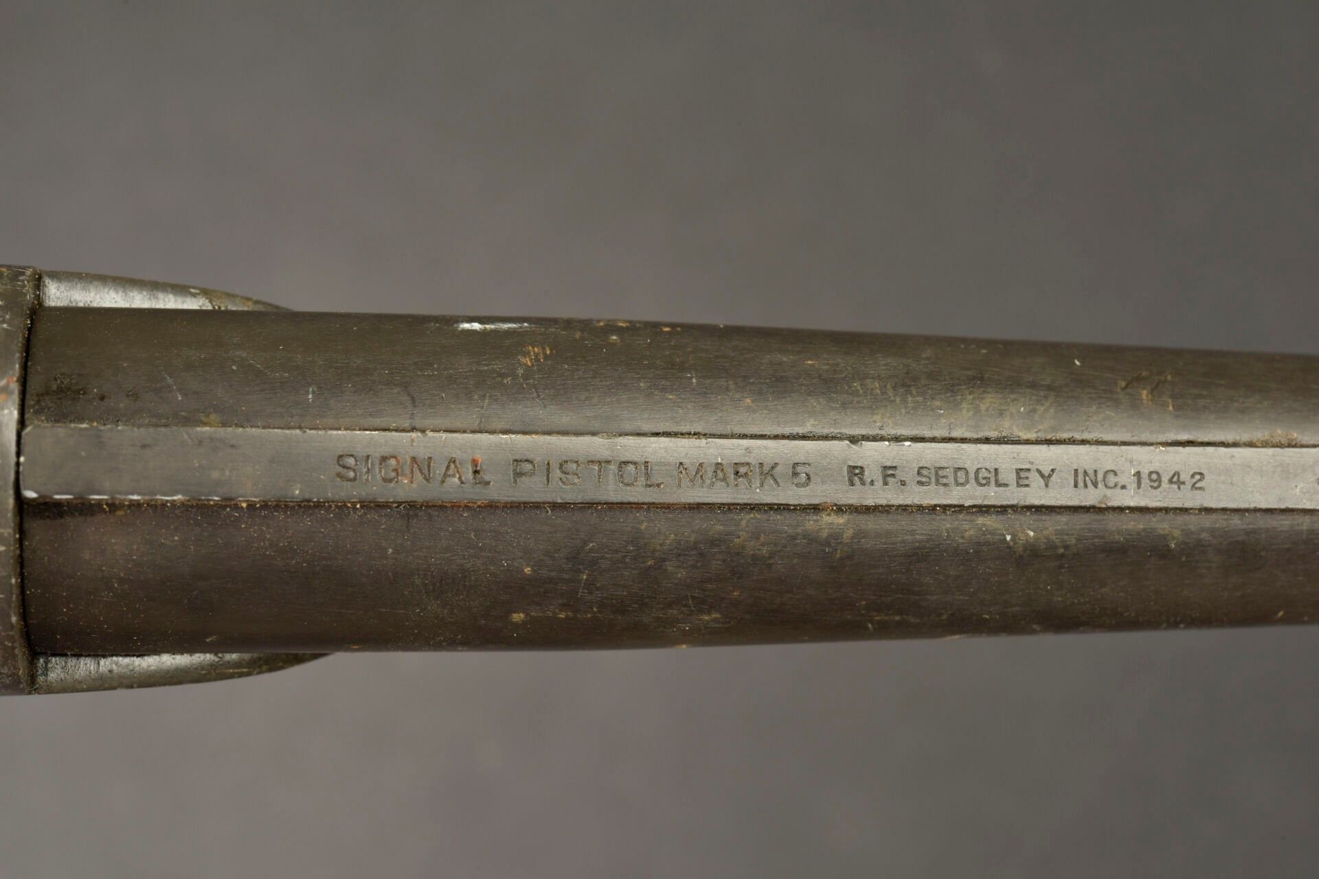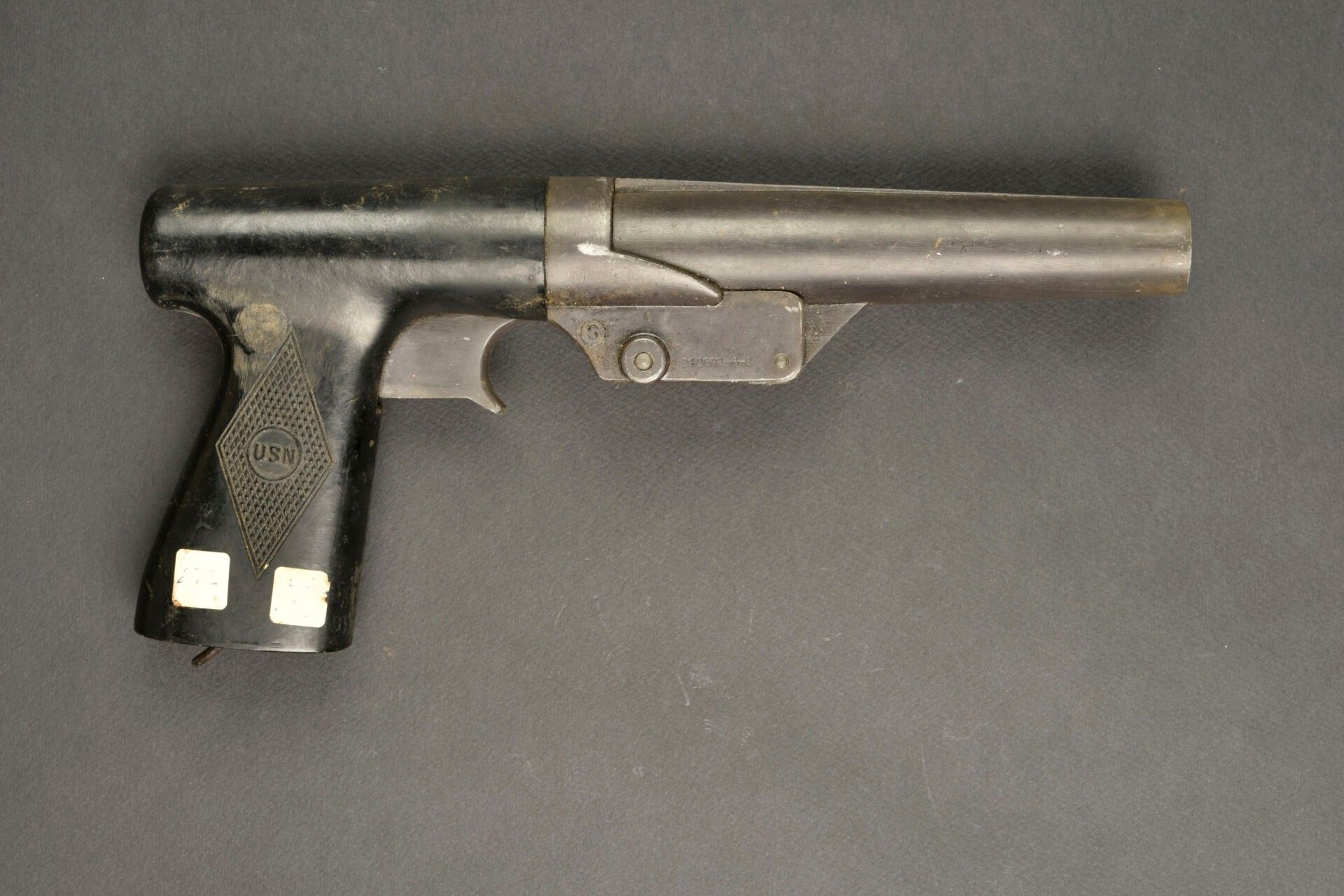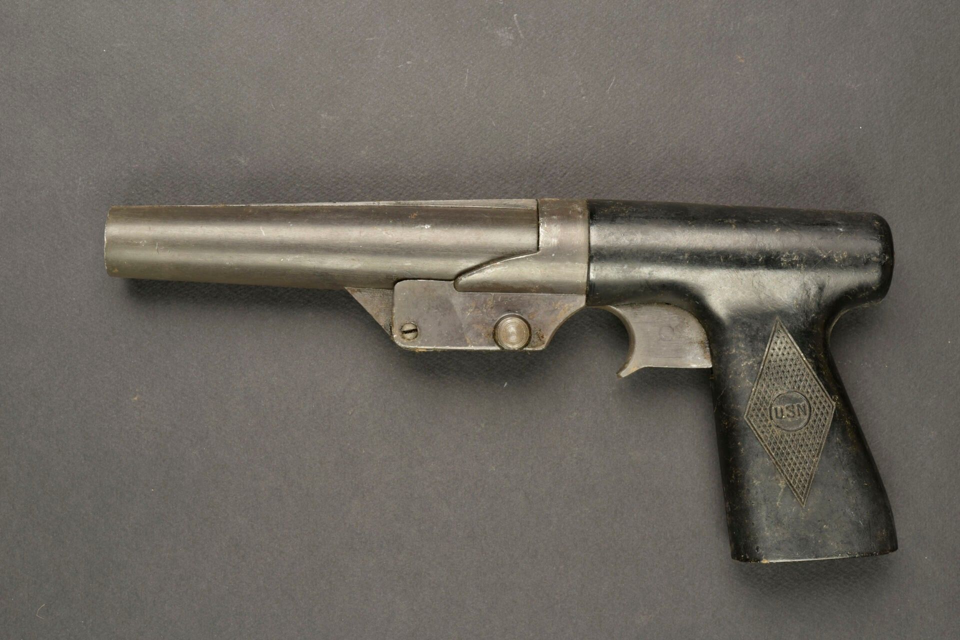 US Navy Sedgley Mark 5 rocket pistol. One-piece plastic grip with checkered lozenges marked USN. Bronze plated steel barrel. Marked on top SIGNAL PISTOL MARK 5 R.F. SEDGLEY INC. 1942. Functional mechanism. Wear, patina II. Weapon of category D under condition of an identity paper reserved to the major.
